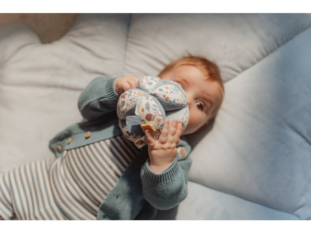 Měkký textilní míček je díky svému provedení snadno uchopenitelný malými dětskými ručičkami. Různorodé textury a vzory lákají dítě ke zkoumání, míček navíc při pohybu jemně cinká.