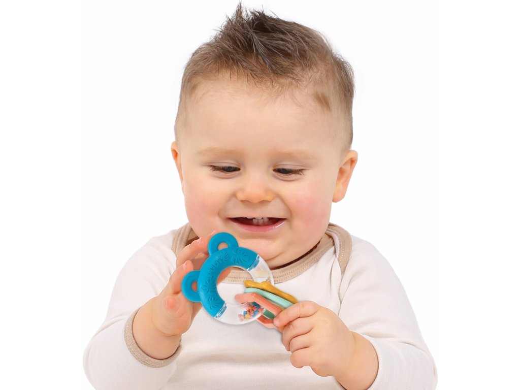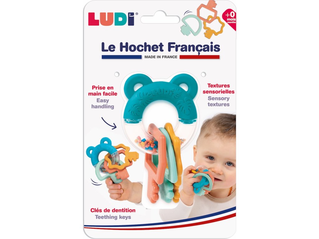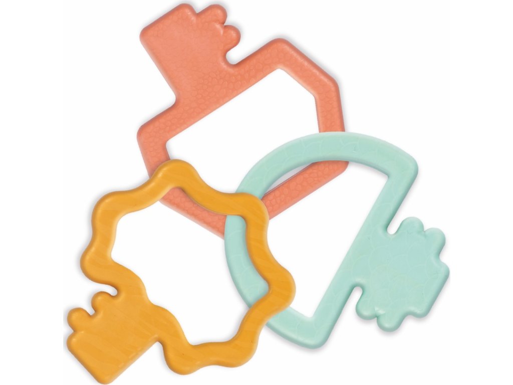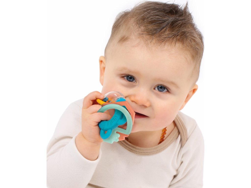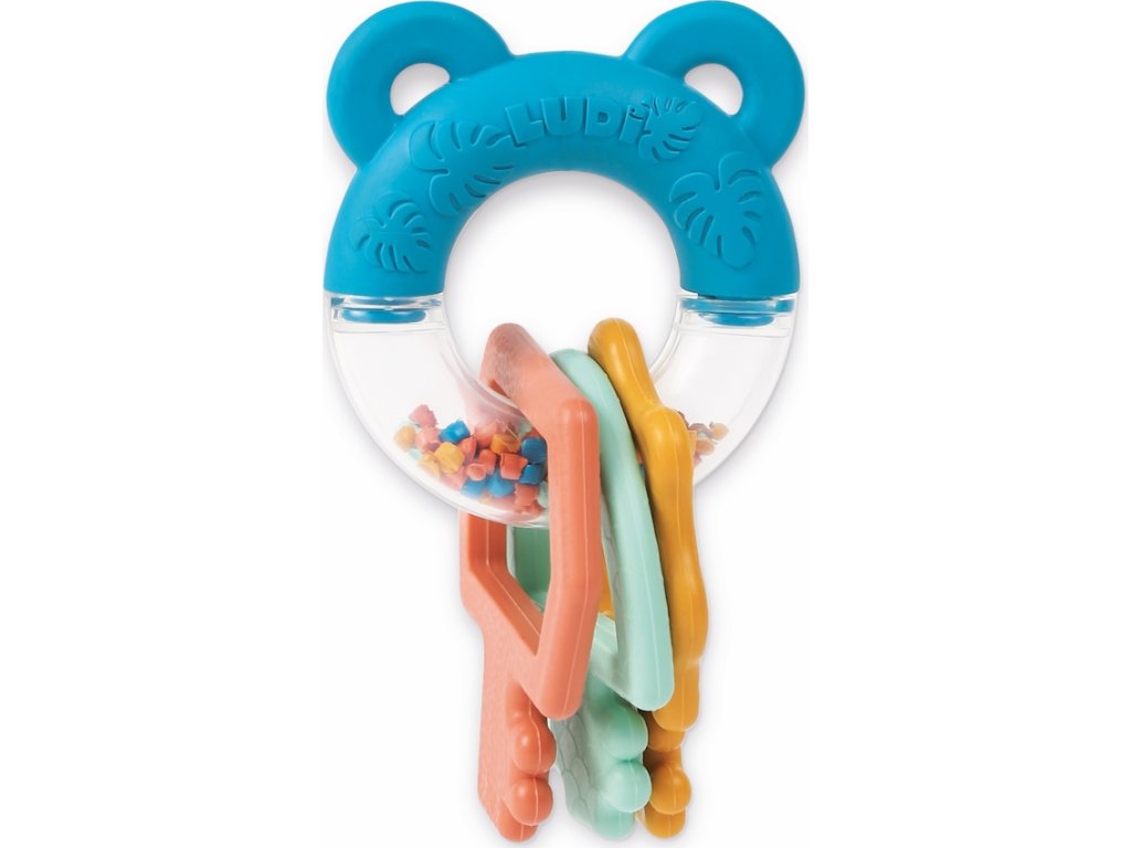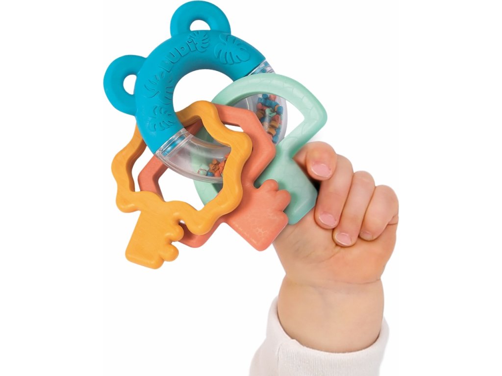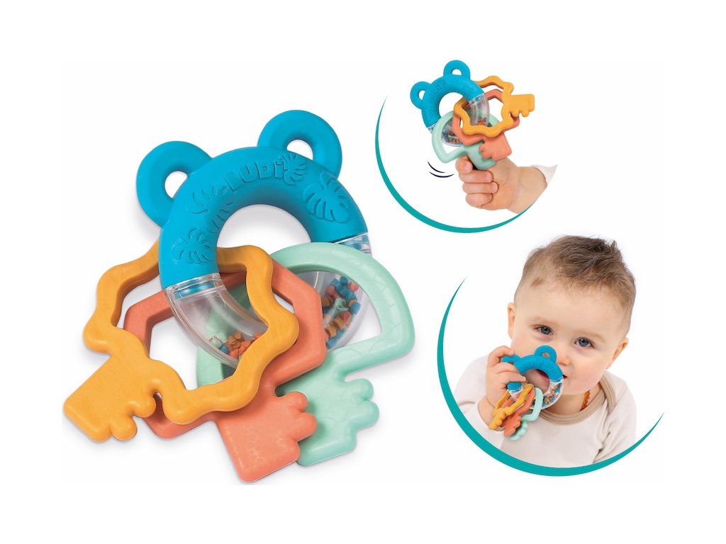 Krásné chrastítko s kousátky v podobě klíčků ve hravých barvách poskytne vašemu dítěti různorodé textury pro zkoumání rukama i ústy. Tvar hračky, která při pohybu jemně chrastí, umožňuje snadné uchopení.