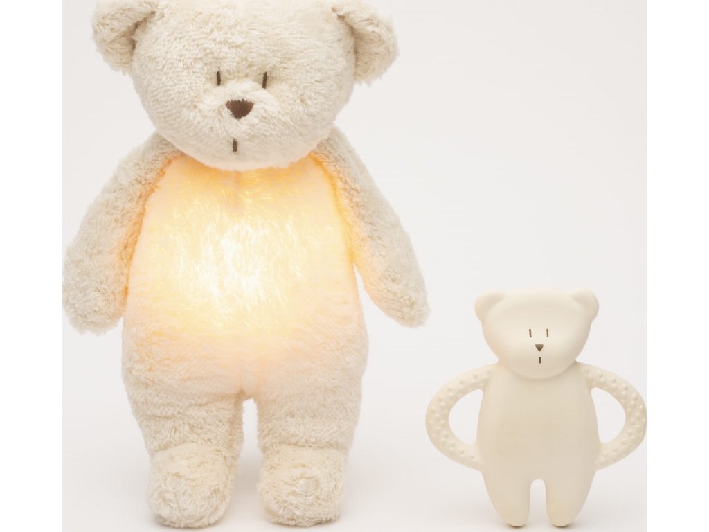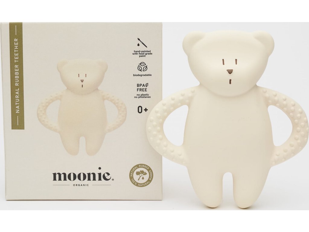Kousátko MOONIE podobě roztomilého medvídka z přírodního kaučuku bylo pečlivě navrženo tak, aby zklidnilo bolavé dásně během prořezávání zoubků a zároveň poskytovalo bezpečný a příjemný smyslový zážitek. Tvar a velikost kousátka umožňují snadné držení malými dětskými ručičkami, různorodé textury lákají dítě ke zkoumání. Hračka je ručně malovaná netoxickými potravinářskými barvami.