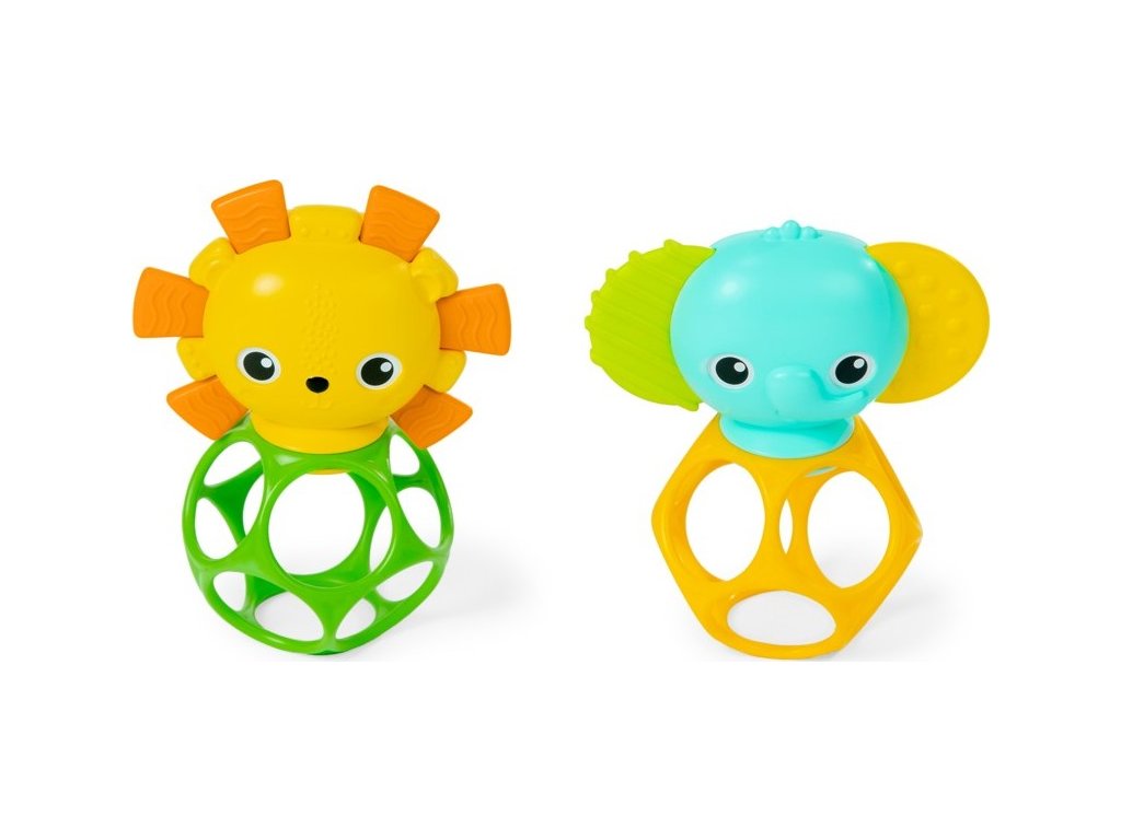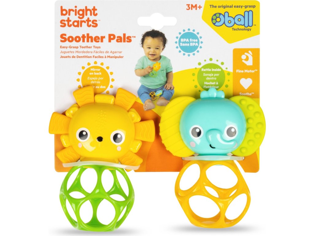 Vítejte v džungli - uklidňující džungli! Toto 2 balení kousátek obsahuje kamarády lva a slona, kteří pomohou vašemu děťátku uklidnit bolavé dásně. Vyrobeno pomocí flexibilní a odolné technologie Oball Bright Starts, snadno uchopitelný tvar umožňuje dítěti chytit kousátko a samo se uklidnit. Tato hračka pro miminka je vyrobena se spoustou otvorů na prsty, které jsou vhodné pro jejich malé ručičky a zároveň podporuje jemnou motoriku. Peek-a-boo! zrcátko na zadní straně kousátka lva pomáhá sebeobjevat. Zatřeste kousátkem slona, abyste objevili chrastící korálky a potěšili malá ouška miminka! Kousátka ve tvaru dudlíků neobsahují BPA pro 100% bezpečné prořezávání zoubků a hraní. Dvojnásobná zábava a dvojnásobné uklidnění pro vaše malé divoké dítě! Vezměte si tyto hračky na cesty – obě kousátka jsou navržena tak, aby se vešla do standardní tašky na pleny. Snadno se také čistí – jednoduše otřete vlhkým hadříkem a jemným mýdlem. Tyto hračky jsou navrženy pro novorozence a starší děti a jsou skvělými dárky pro každou příležitost.