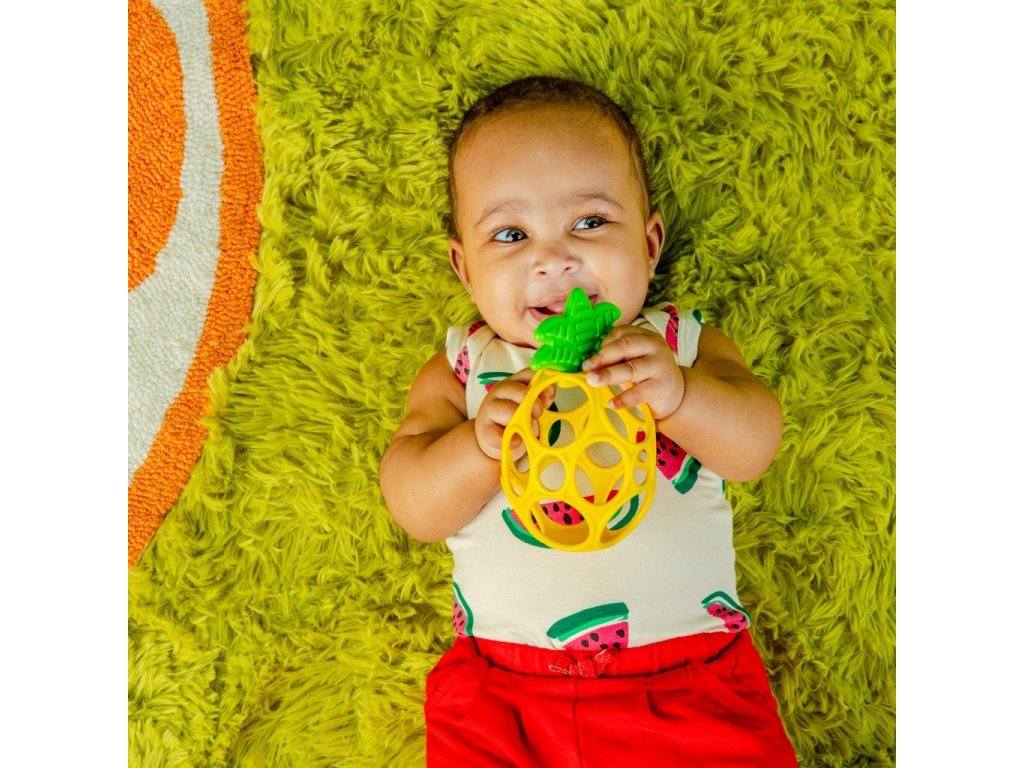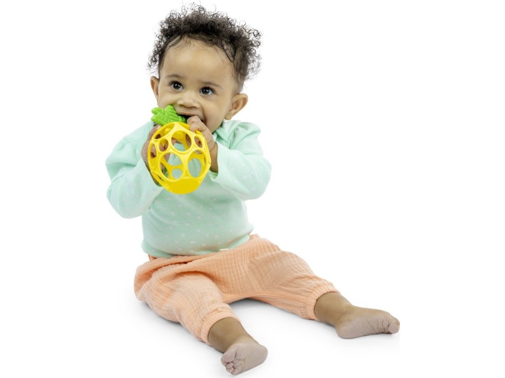 - Snadno uchopitelné ananasové kousátko vyrobené z flexibilní a odolné technologie Oball od Bright Starts má otvory na prsty pro malé ručičky na držení a hraní.