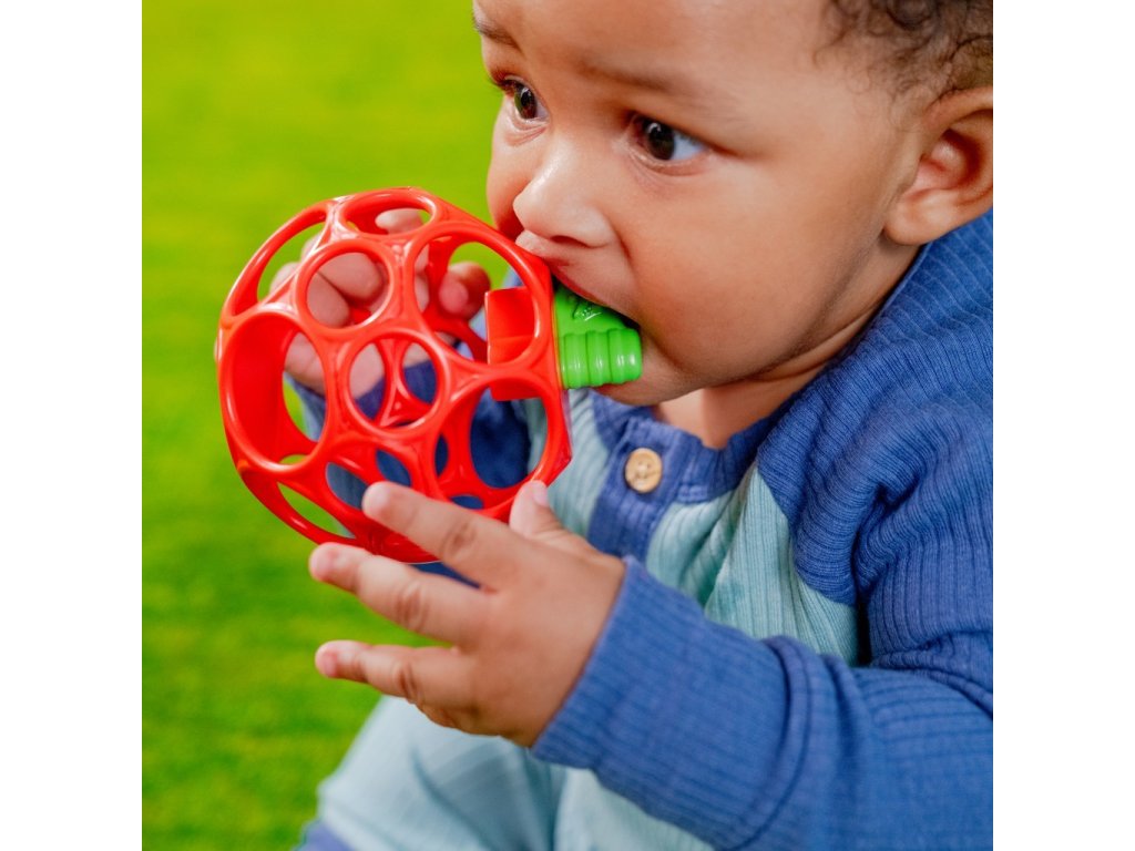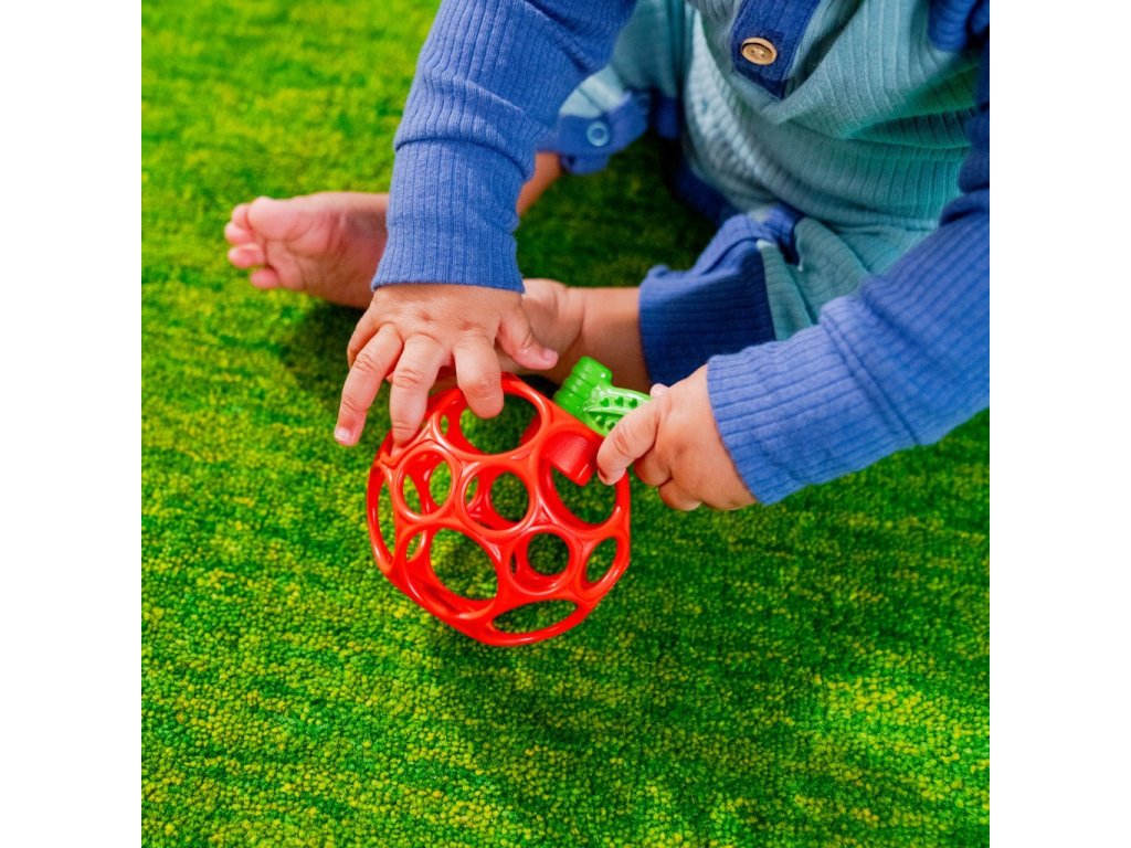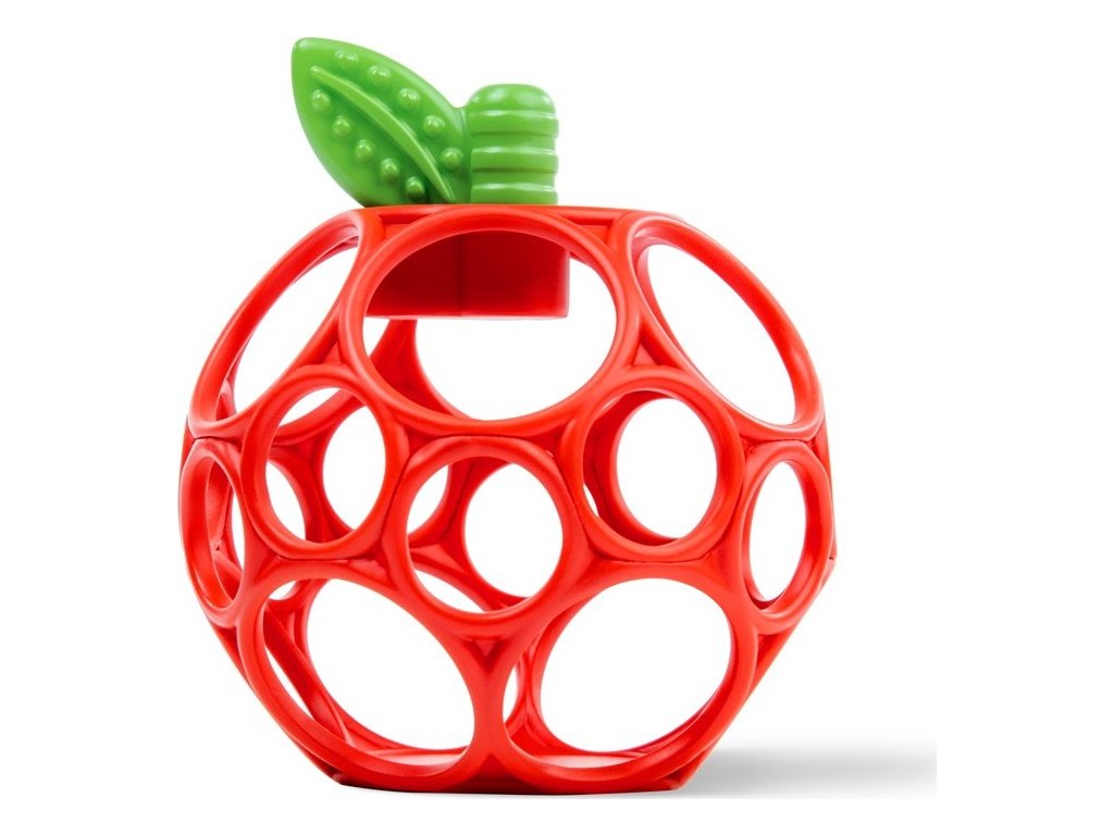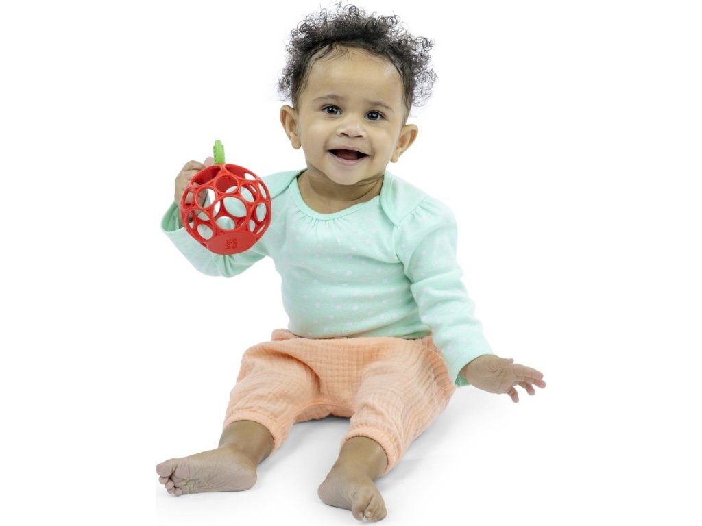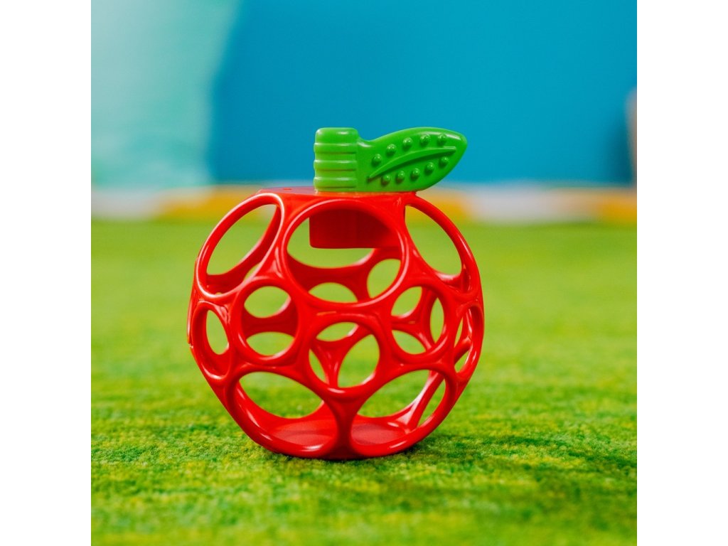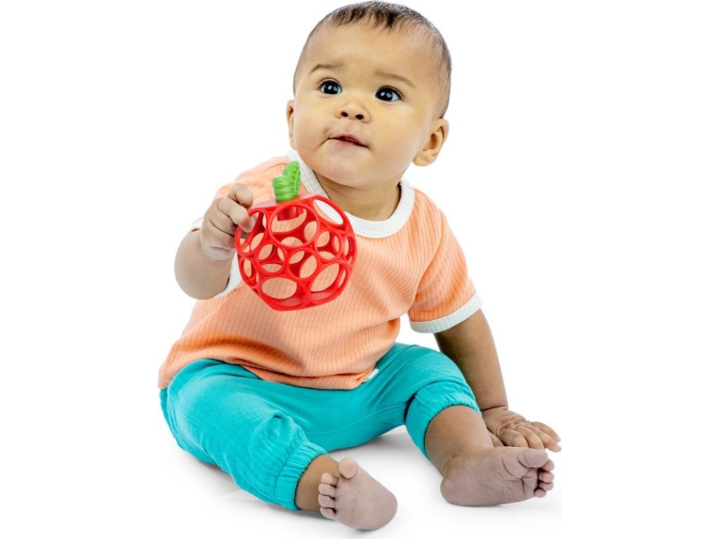 - Lehce uchopitelné jablečné kousátko vyrobené z flexibilní a odolné technologie Oball od Bright Starts má otvory na prsty pro malé ručičky na držení a hraní.