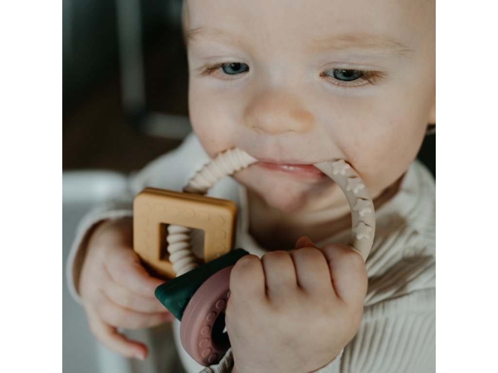Silikonové kousátko FIGURES, které se skládá z kroužku s výstupky, na nichž jsou geometrické tvary, umožňuje dítěti objevovat svět nových pocitů. Je nejen zdrojem zábavy, ale také nástrojem, který stimuluje vývoj. Různé tvary a textury nabízejí vašemu dítěti zajímavé hmatové vjemy, pomáhají zkoumat hmat a korigují rozvíjející se smyslové dovednosti.