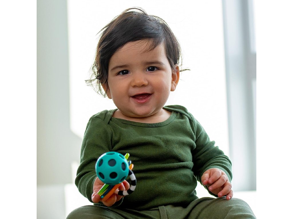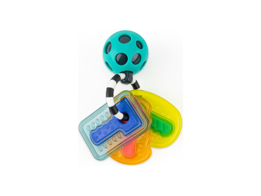 Chrastítko ve tvaru klíčenky s míčkem ve výrazných kontrastních barvách je vyrobeno z příjemného materiálu.