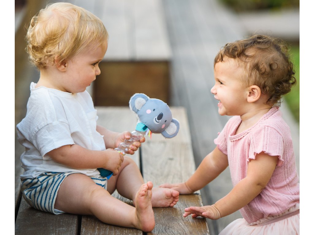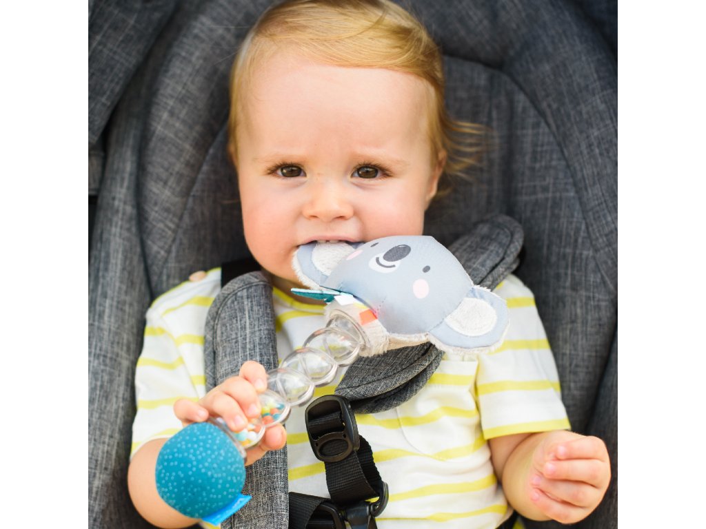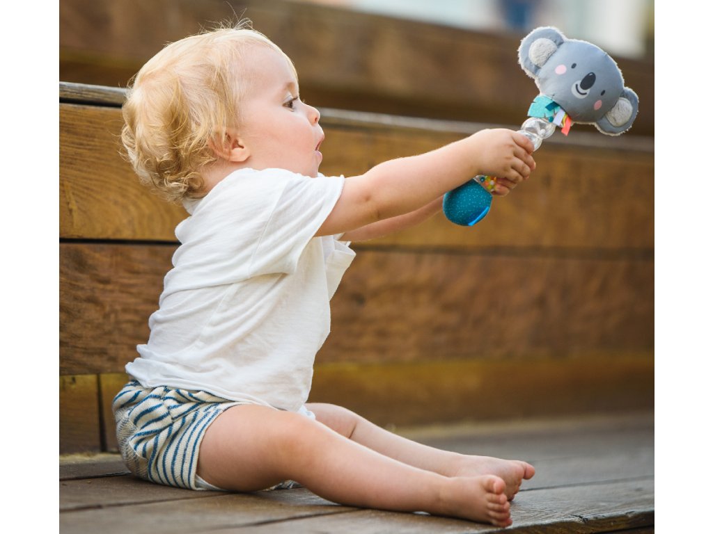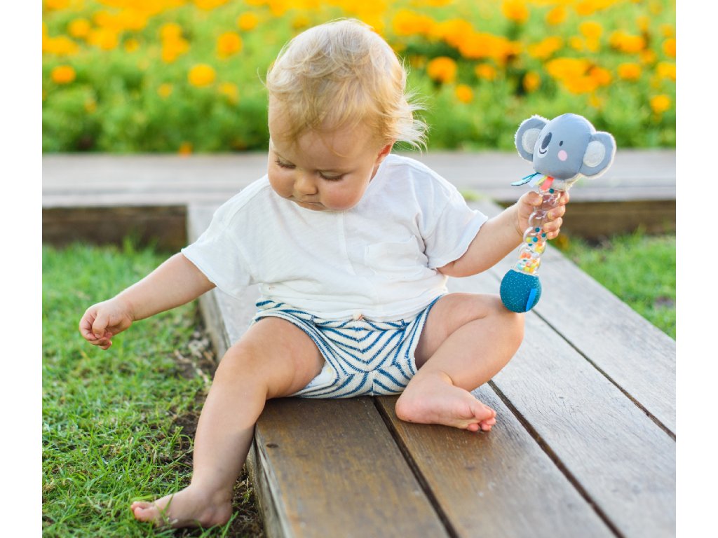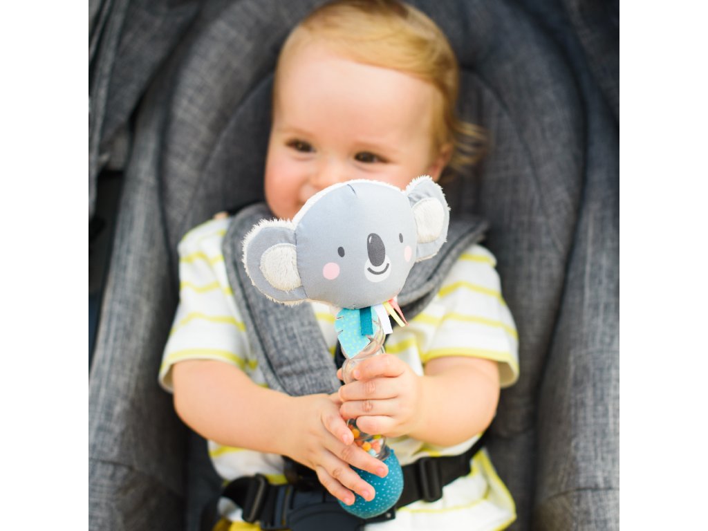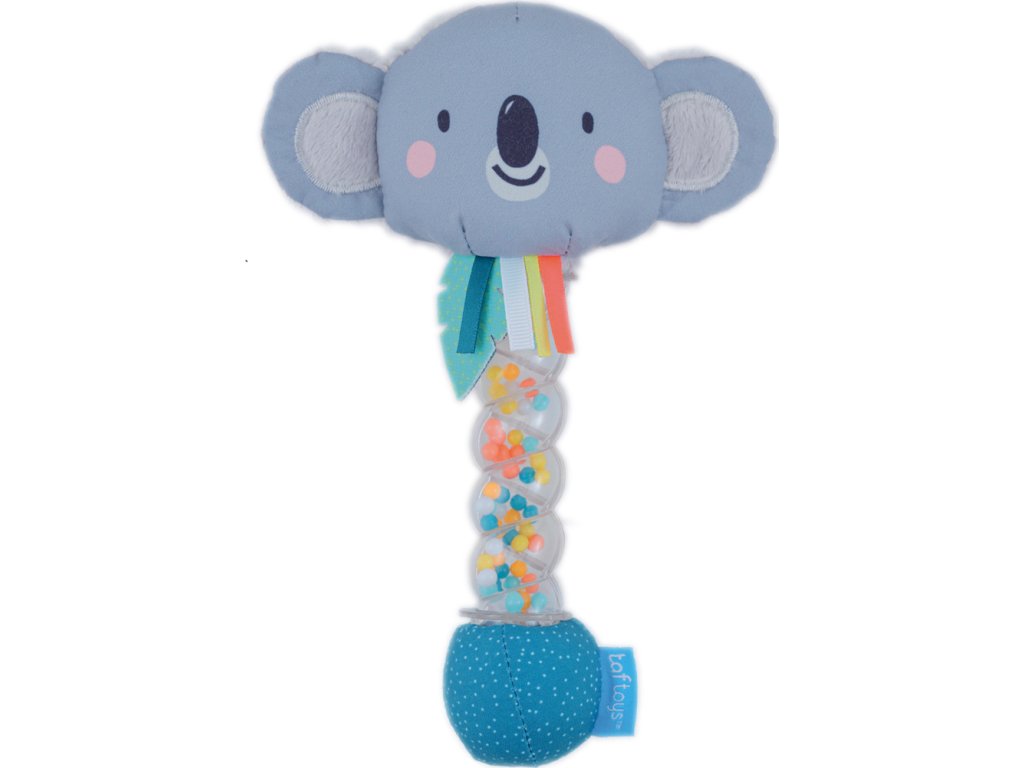 Chrastítko tvoří měkká plyšová hračka ve tvaru usměvavého medvídka koaly a průhledné plastové držadlo naplněné barevnými korálky. Uklidňující zvuk přesýpajících se korálků připomíná zvuk padajících kapek deště.
