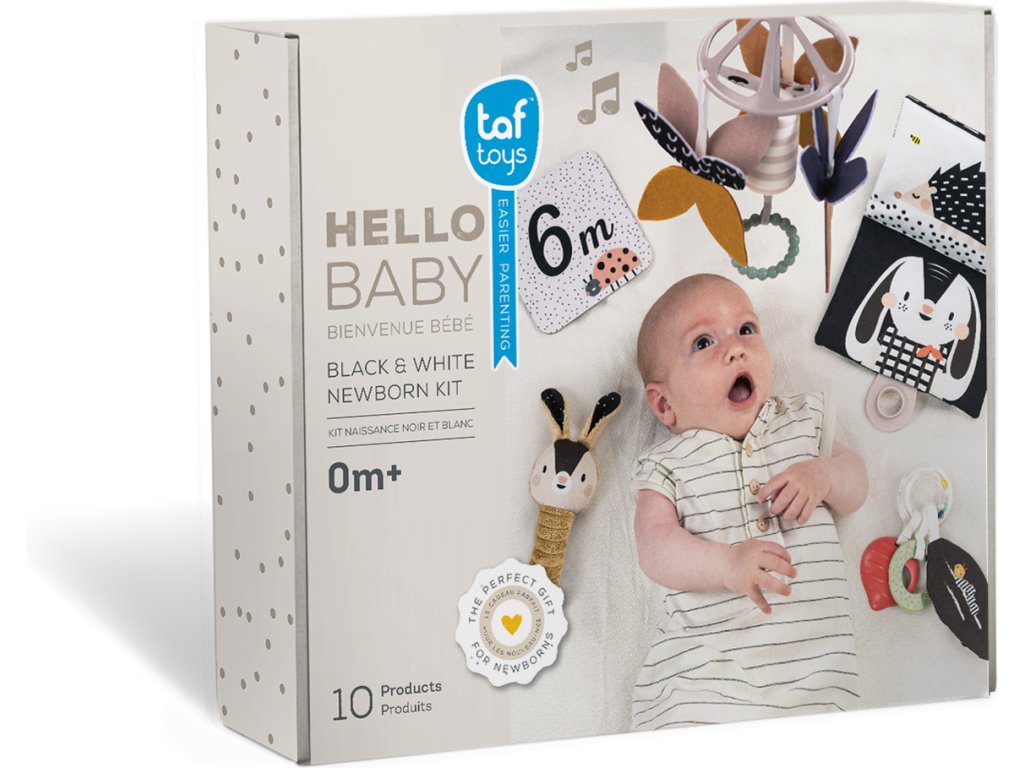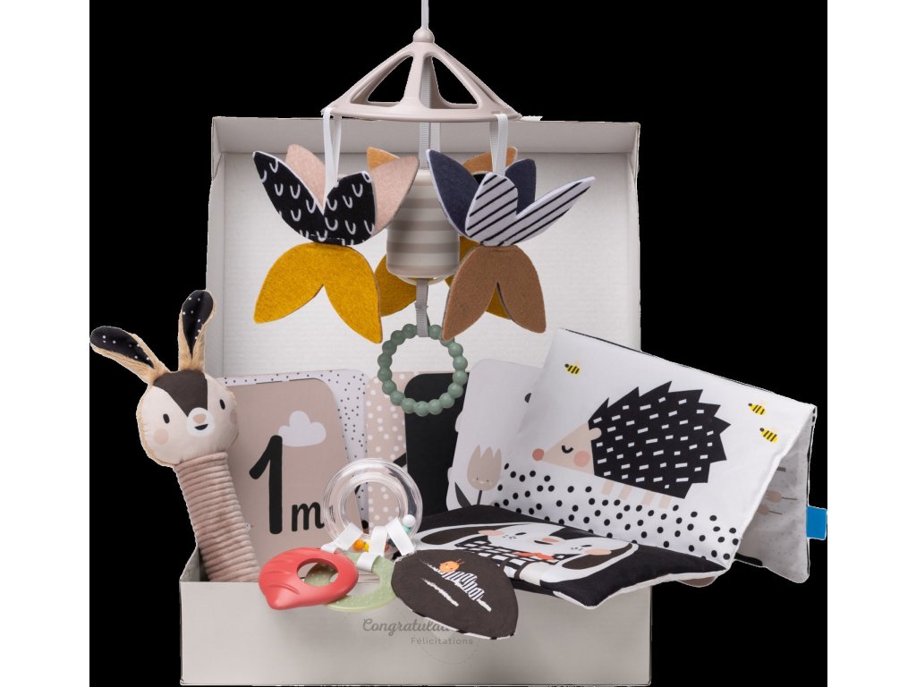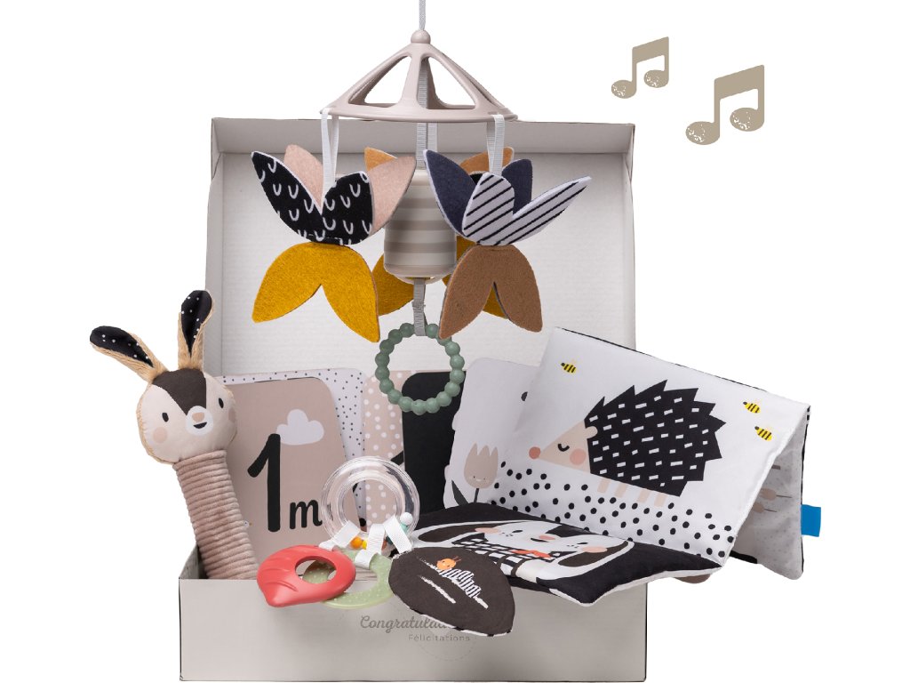 Dárkový box obsahuje 10 vývojových hraček navržených k posílení smyslového, motorického a kognitivního rozvoje vašeho dítěte od prvních dnů života: