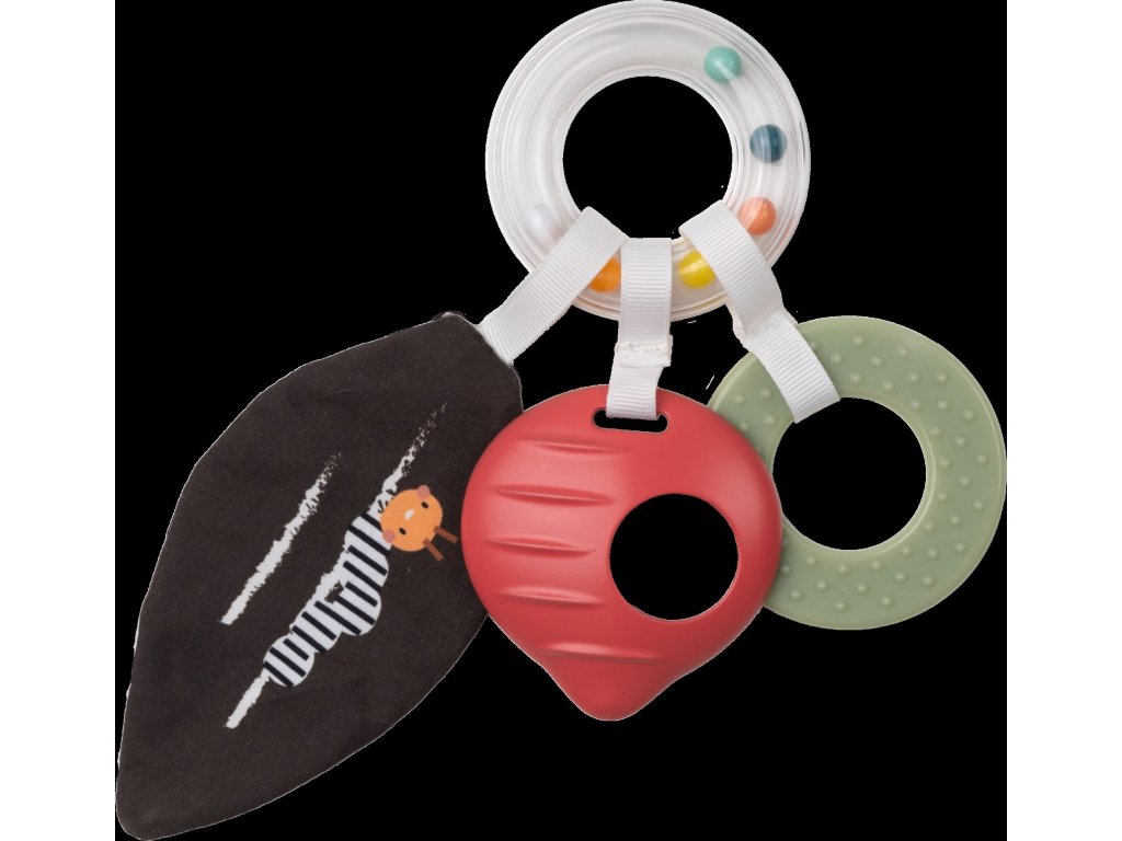 - Chrastítko a kousátko: Kroužkové chrastítko s kousátky a šustivým listem pomáhá rozvíjet jemnou motoriku a koordinaci rukou.