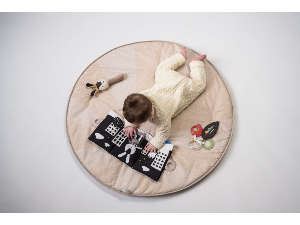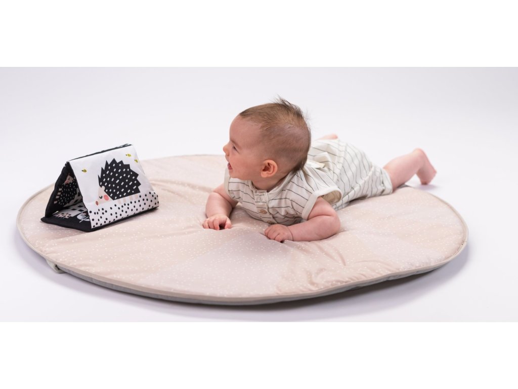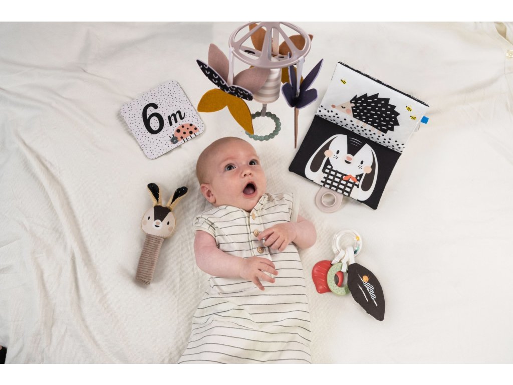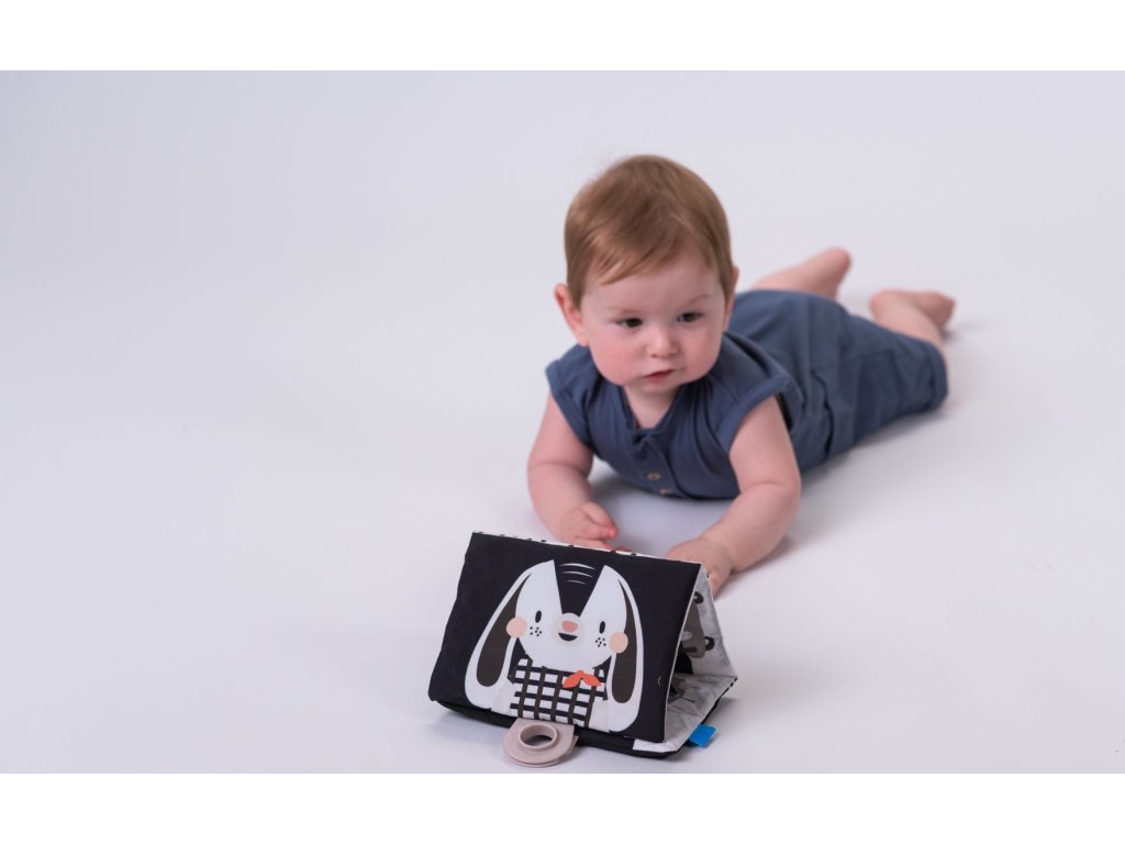 - Knížka na bříško: Černobílá šustivá knížka pro stimulaci smyslů je ideální pro čas hry na bříšku, podporuje zrakový a sluchový vývoj.