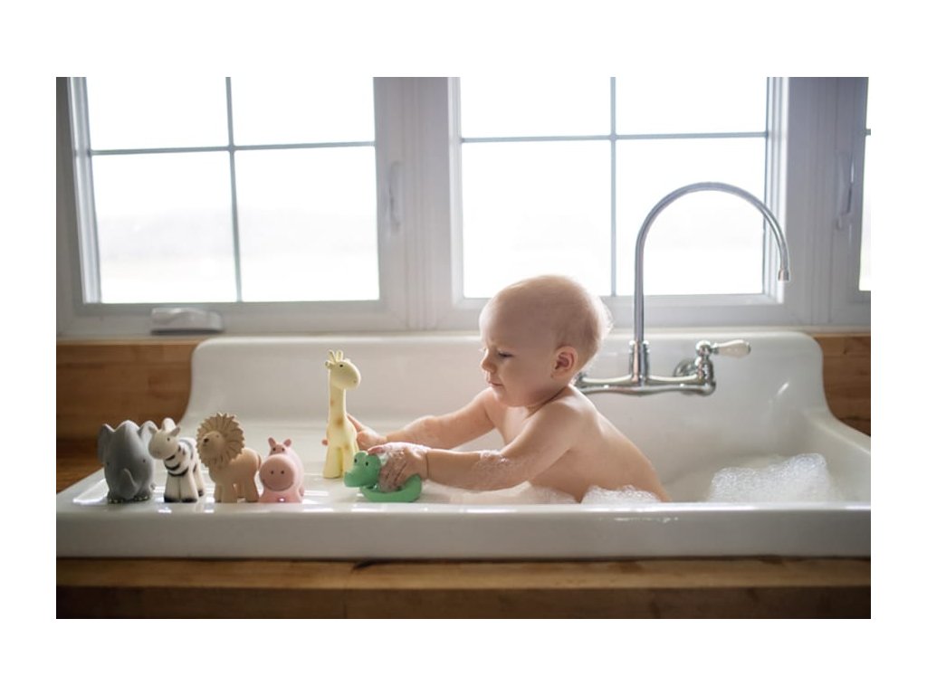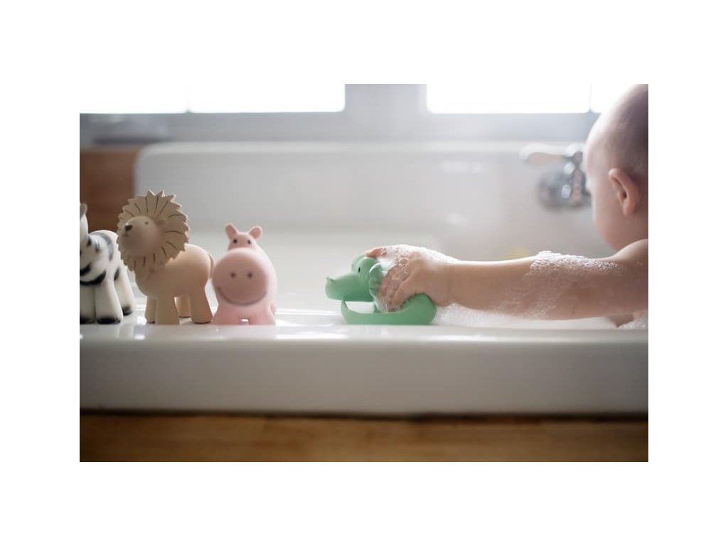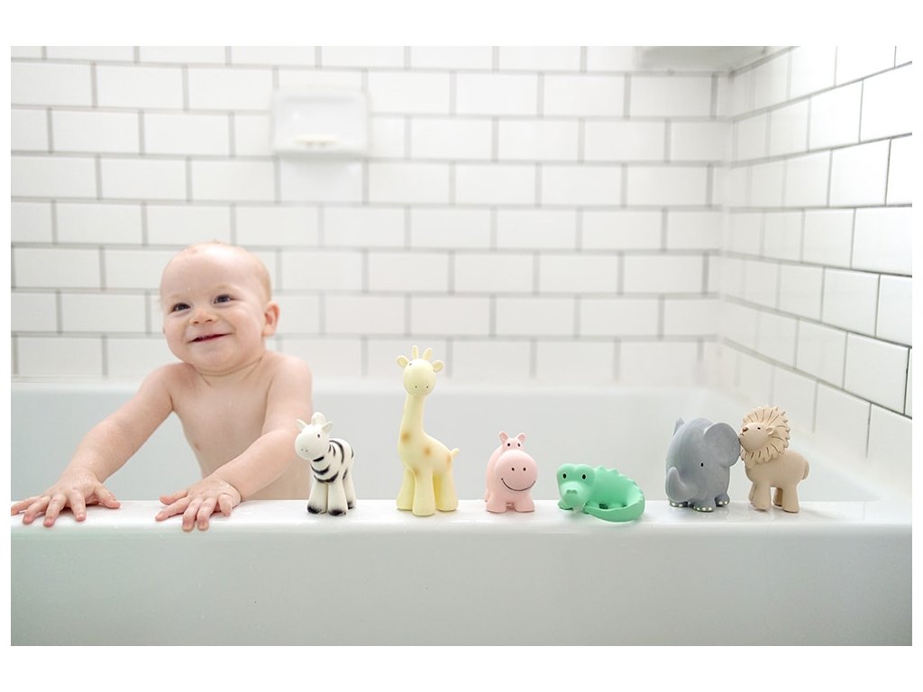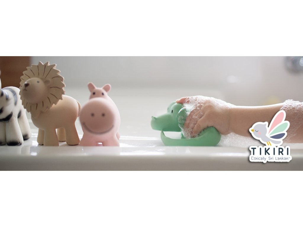 Roztomilé Tikiri zvieratká sú vyrobené z príjemne jemnej mäkkej prírodnej gumy z kaučukového stromu Hevea. Zvieratká nemajú žiadny otvor, ktorým by sa do vnútra mohla dostať vlhkosť, takže sú ideálne ako hračka do kúpeľa alebo hryzátko pri prerezávajúcich sa zúbkoch. Deti obľubujú špecifickú príjemnú vôňu a chuť prírodnej gumy a zaujme ich aj zvuk jemne znejúcej hrkálky vnútri zvieratka. Prírodná guma vyrobená z miazgy kaučukového stromu Hevea, ktorá je pravidelne odoberaná tak, aby strom netrpel, šetrne a udržateľne Ekologický, v prírode rozložiteľný materiál, bezpečný aj pre tie najmenšie bábätká Ručne maľované netoxickými rastlinnými farbami Neobsahuje BPA, PVC, ftaláty ani žiadne iné škodlivé látky Vhodné od narodenia Vyrobené na Srí Lanke vo fair trade podmienkach Vďaka ručnej práci je každé zvieratko jedinečné a prípadné drobné nerovnosti materiálu a odlišnosti v kresbe sú prirodzenou vlastnosťou Veľkosť zvieratiek: Hrošík: 8 x 12 x 5 cm Žirafka: 17 x 8 x 5 cm Zebra: 11 x 11 x 5,5 cm Sloník: 9 x 11 x 7 cm Levík: 11 x 7 x 5,5 cm Krokodíl: 5,5 x 9 x 9 cm