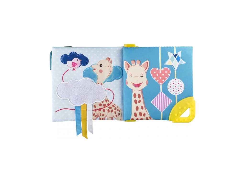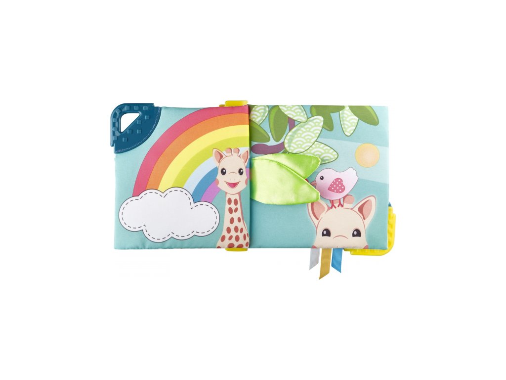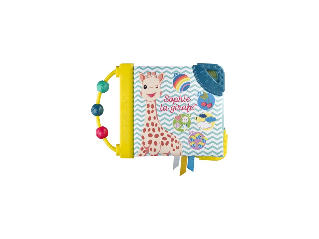 Dítě poznává žirafku Sophie a baví se počítáním různých prvků na každé stránce "1 duha", "2 třešně", "3 mraky".