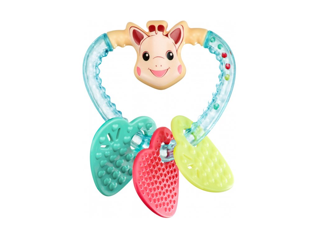 Dítě může chrastítkem třást, aby slyšelo cinkat medailonky a kuličky uvnitř chrastítka. Jeden medailonek na chrastítku je měkký, dítě jej tak může žvýkat a tím si ulevit od bolesti dásní.