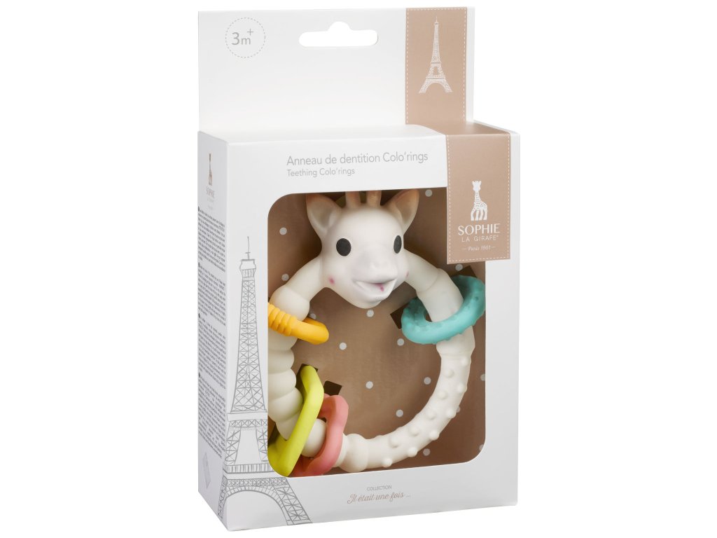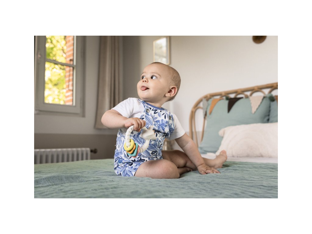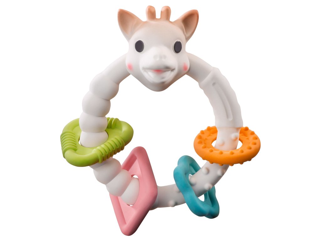 Bezpečný přírodní kousací kroužek je vyroben z 100% přírodního kaučuku získaného z kaučukovníku Hevea a z potravinářských barev. Hračka obsahuje mnoho měkkých částí určených ke kousání s různými tvary (uši, rohy nebo nos žirafky), které masírují dásně a poskytují dítěti úlevu od bolesti při prořezávání prvních zoubků. 4 barevné kroužky různých geometrických tvarů upoutají zrak a pozornost dítěte. Lehké a ergonomické, snadno se uchopují i malými dětskými ručičkami.
