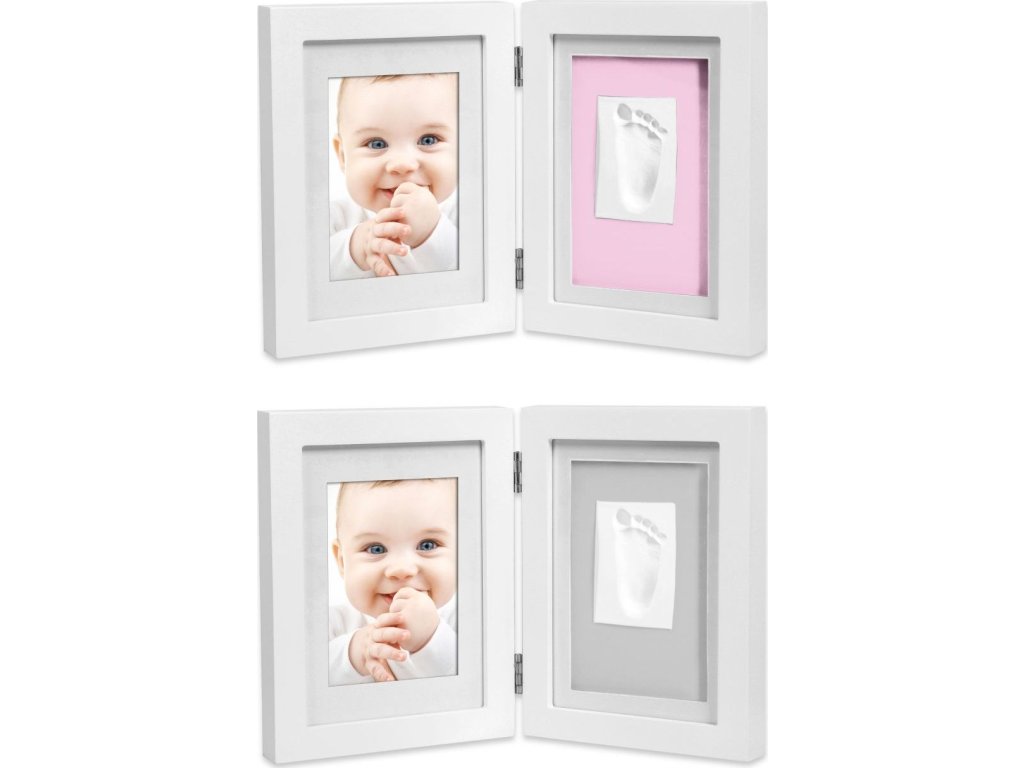 INTERBABY | Rámeček 2 OTISKY + 2 FOTKY INTERBABY rámeček je foto rámeček se třemi oddělenými prostory pro dvě fotografie a dva otisky ručiček nebo nožiček Vašeho miminka na šedém podkladu.
