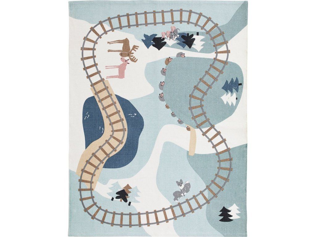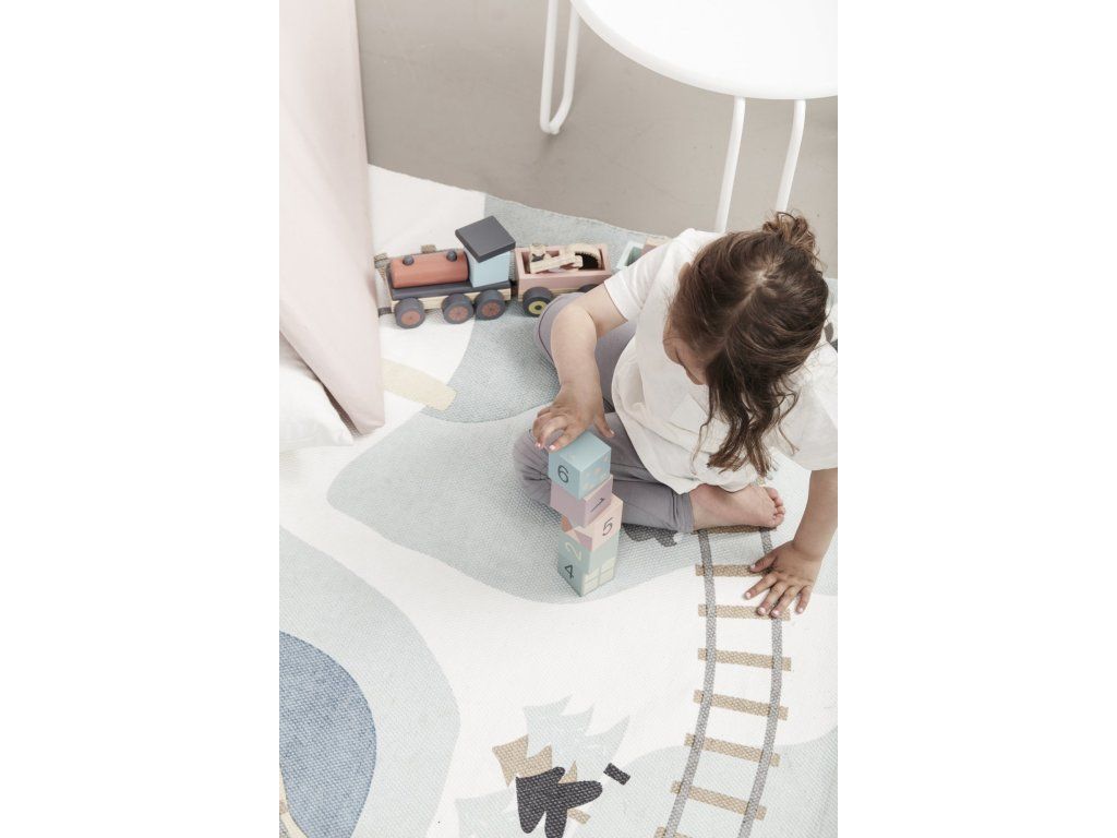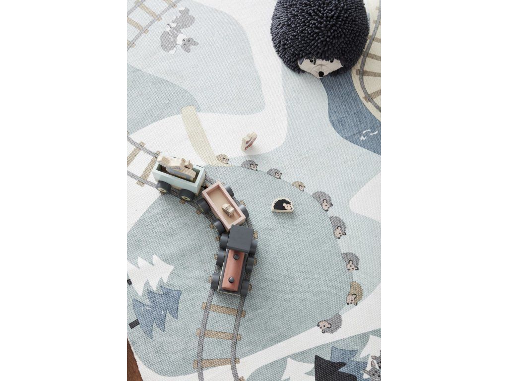 Koberec v designu lesa s kolejemi a zvířátky je ideální pro hru s dřevěným vlakem se zvířátky a dalšími doplňky ze série dřevěných hraček Edvin.