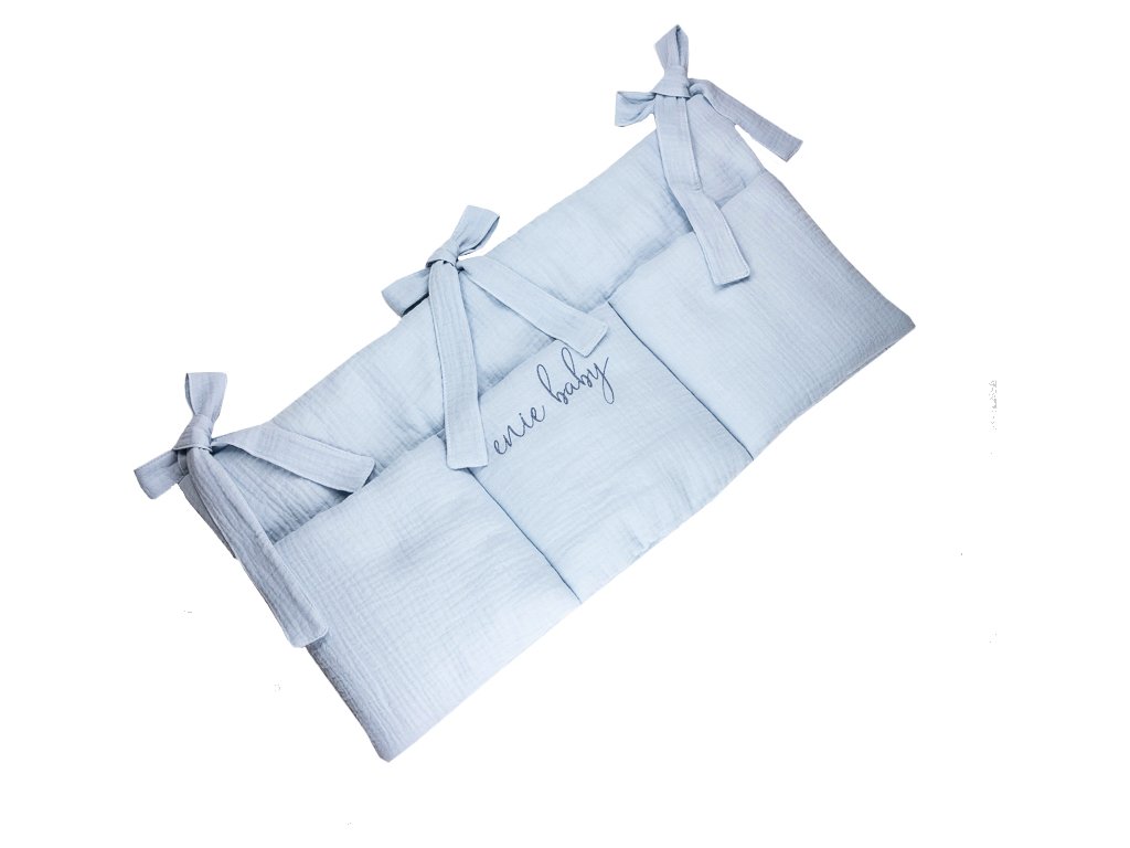 Kapsář na postýlku z mušelínu má tři prostorné úložné kapsy na ukládání hraček, deček, dudlíků a dalších nezbytností, jako jsou plenky nebo vlhčené ubrousky. Kapacita kapsy je 4- 8 plenek. Místo na vše, co chcete mít po ruce. Pomocí tří horních mašlí ho snadno zavěsíte kamkoliv. Celkové rozměry 60x30 cm.