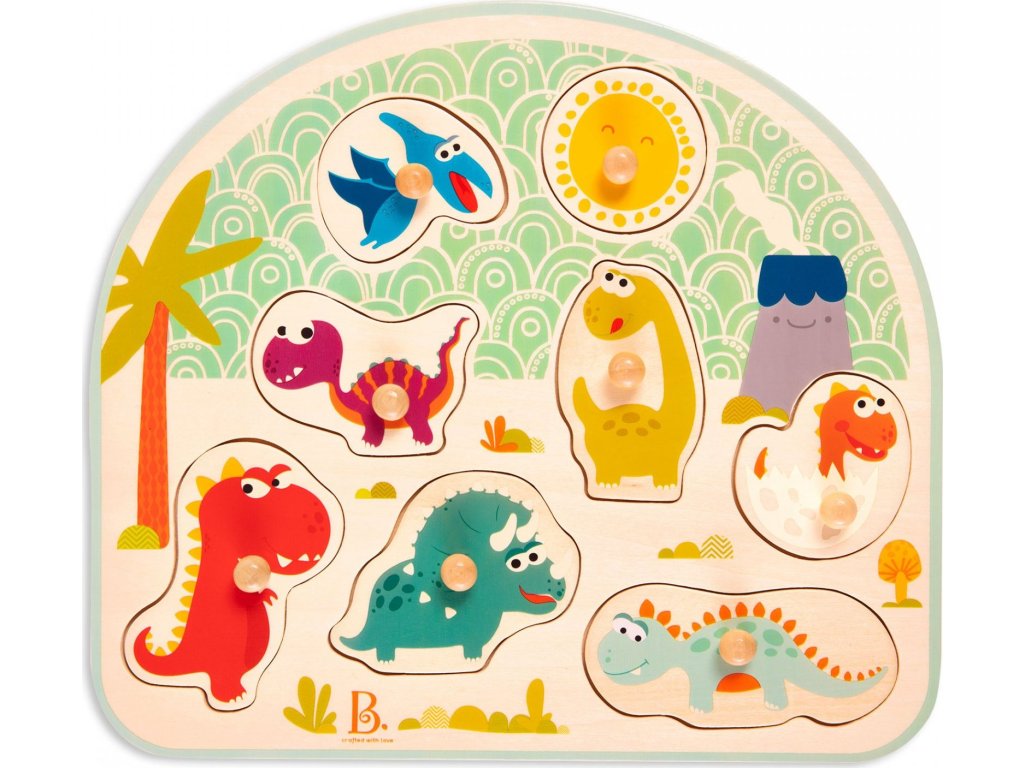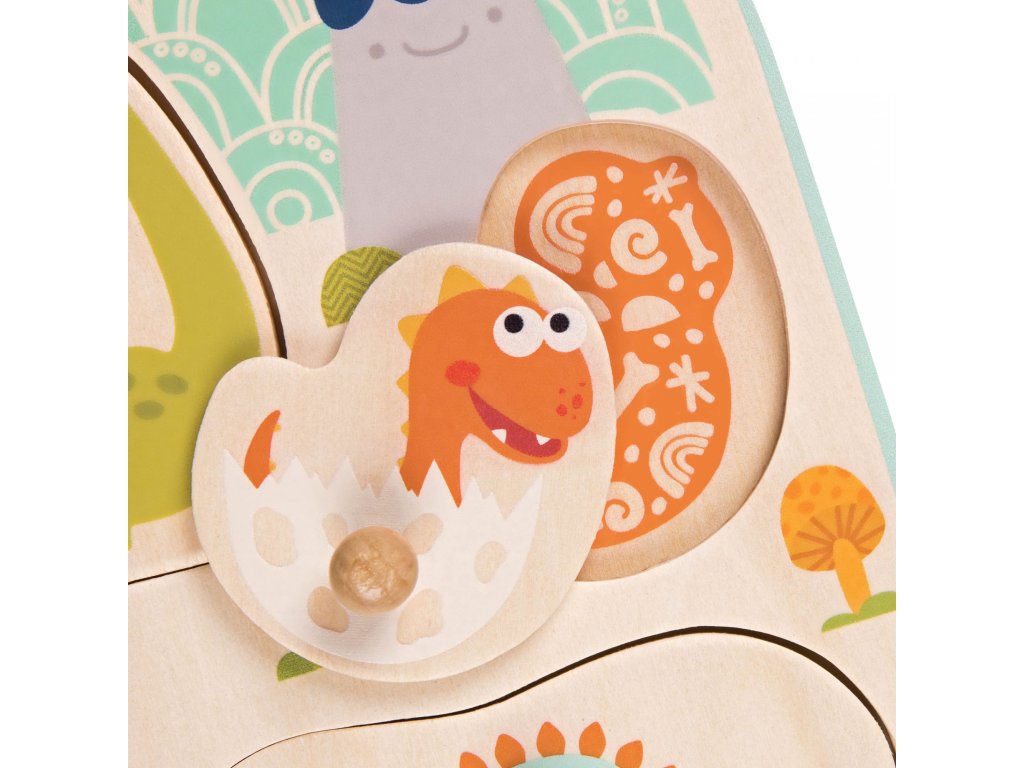Osm dřevěných vyjímatelných dinosaurů je vybaveno úchytkami pro snadné uchopení dětskými ručičkami. Roztomilí dinousauři lákají ke hře i k vymýšlení příběhů ze života v pravěku.
