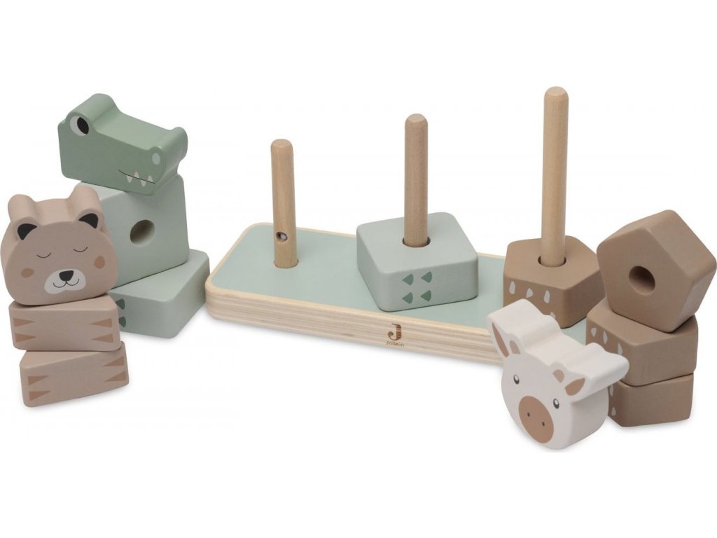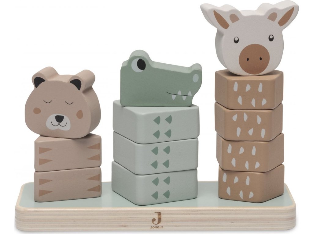 Dřevěná zvířátka z džungle jsou tvořena hlavičkou a kostkami, které se postupně navlékají na základnu. Hračka pomáhá rozvíjet jemnou motoriku dítěte a může sloužit i jako krásná dekorace v dětském pokoji.