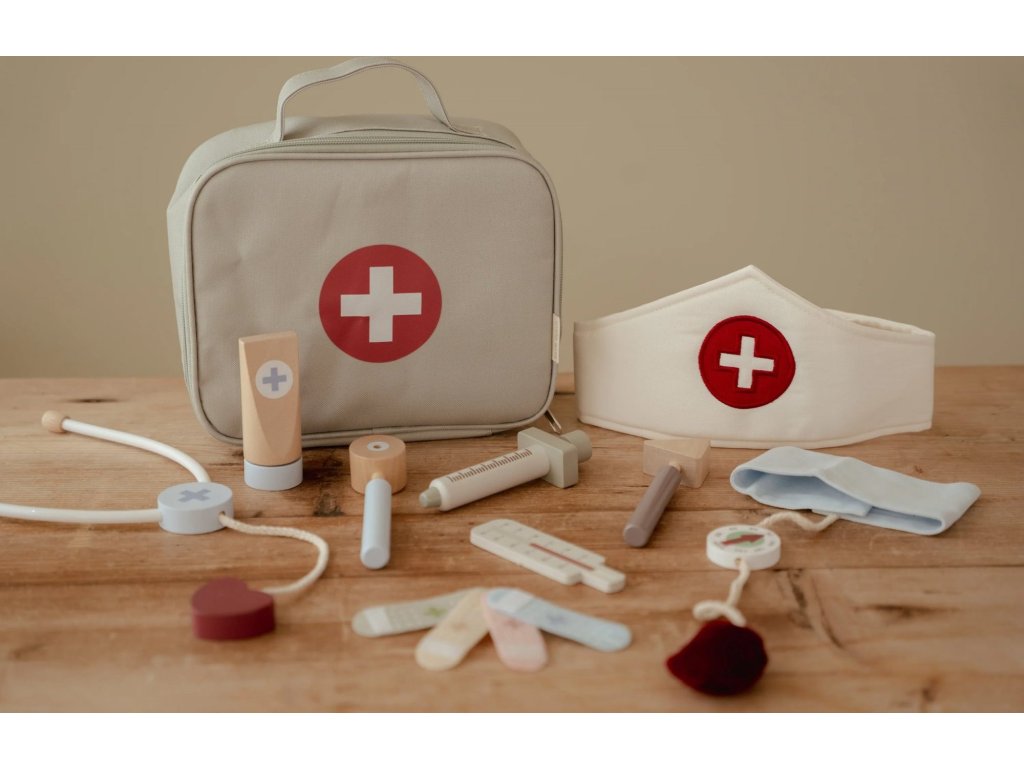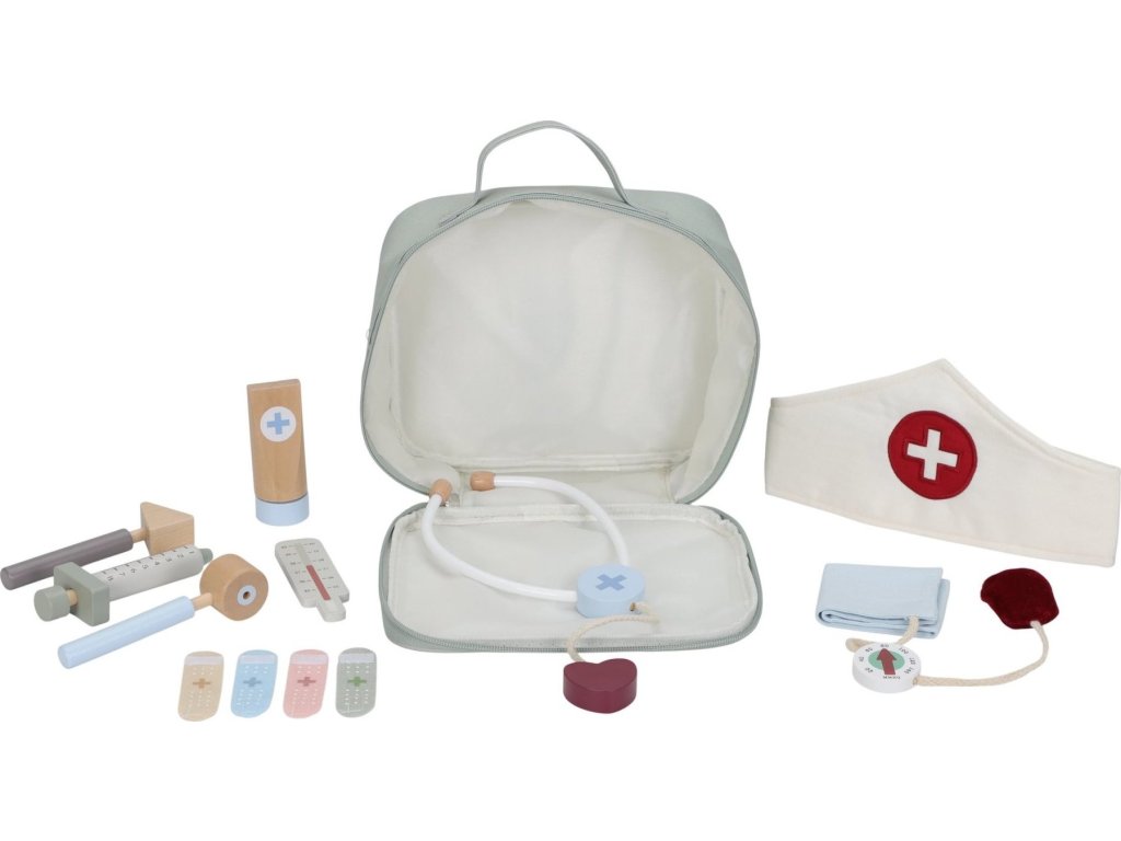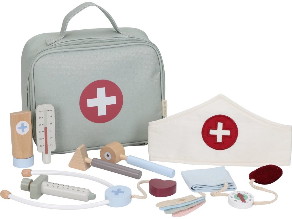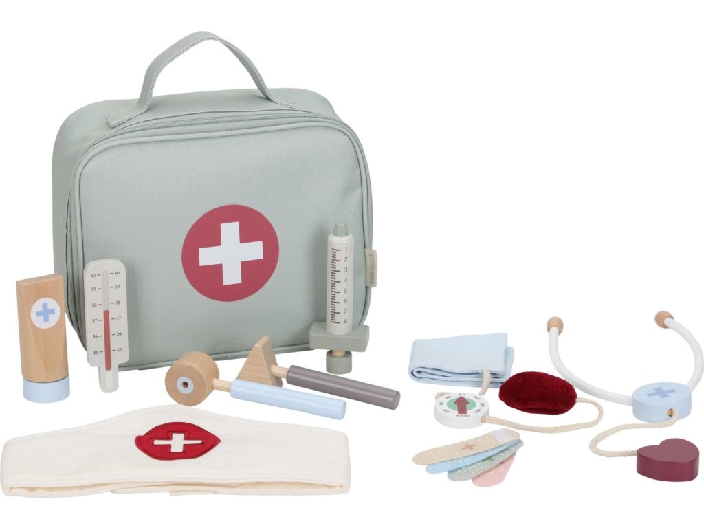 Paní doktorko, pane doktore – mohl/a byste se na mě podívat? S touto krásnou dřevěnou doktorskou sadou bude vaše dítě připravené postarat se o každého pacienta. Textilní lékařská taška ukrývá veškeré základní vybavení: teploměr, injekci, obvazy, stetoskop, tlakoměr a dokonce i doktorskou čepici.