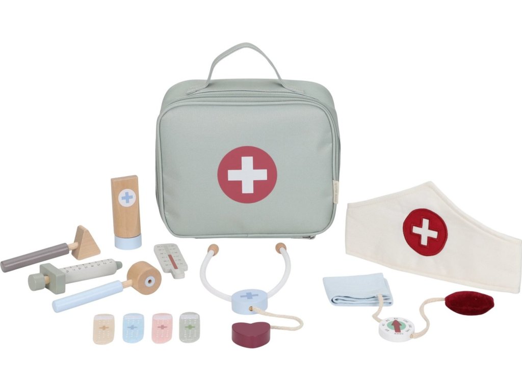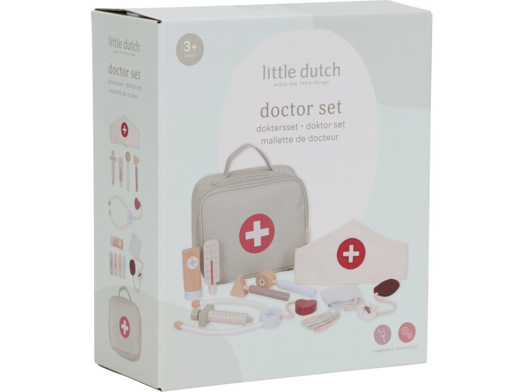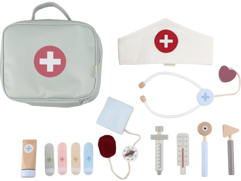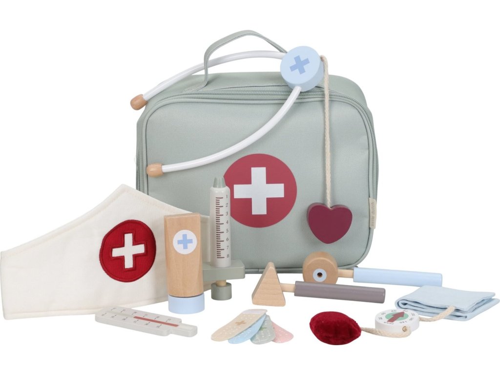 Paní doktorko, pane doktore – mohl/a byste se na mě podívat? S touto krásnou dřevěnou doktorskou sadou bude vaše dítě připravené postarat se o každého pacienta. Textilní lékařská taška ukrývá veškeré základní vybavení: teploměr, injekci, obvazy, stetoskop, tlakoměr a dokonce i doktorskou čepici.