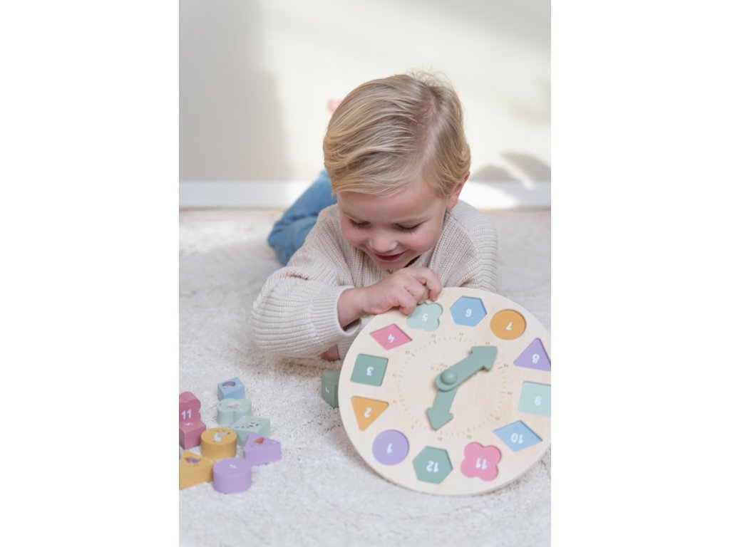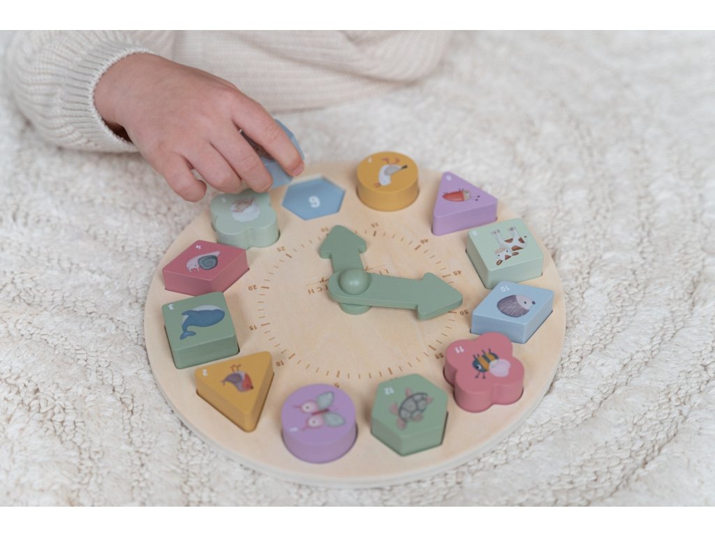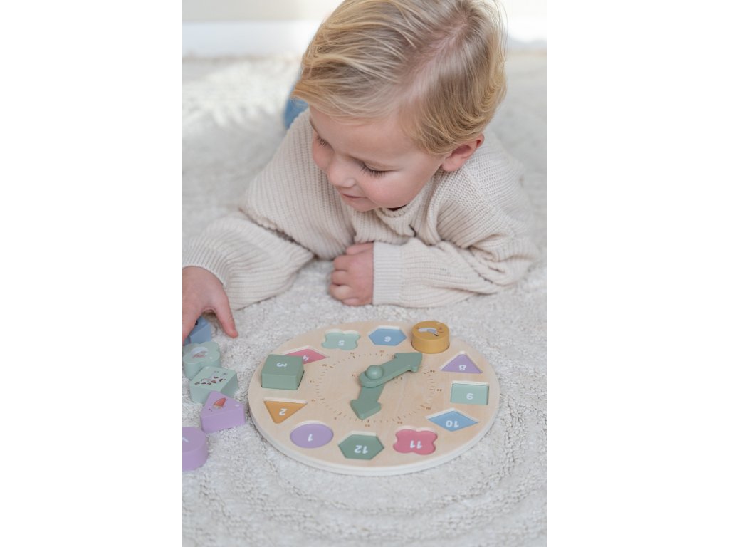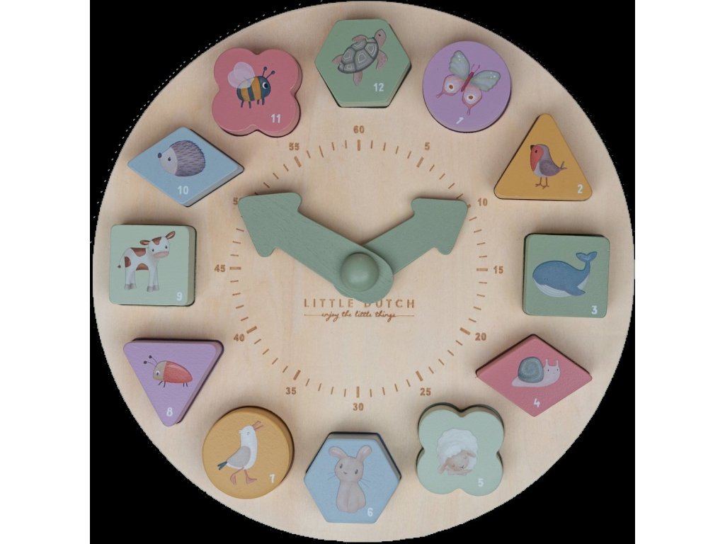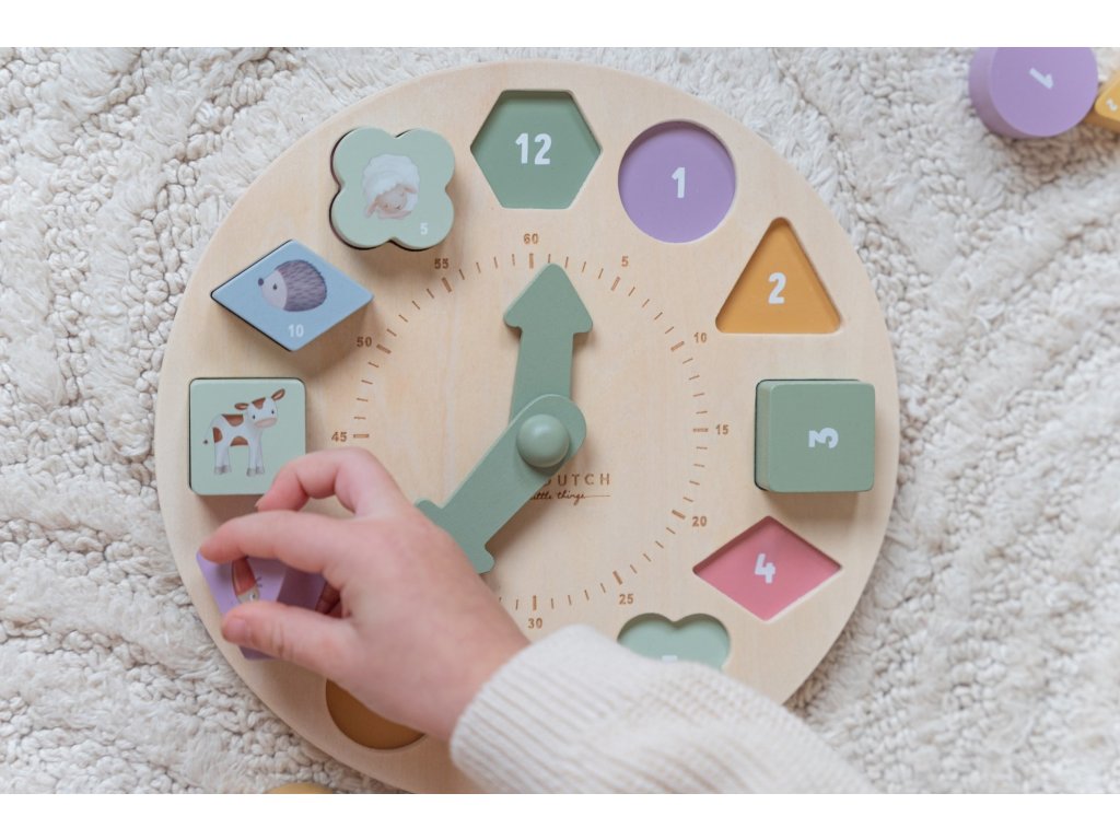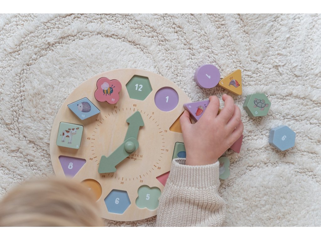 S pomocí puzzle hodin Little Dutch se děti učí rozpoznávat barvy, čísla, tvary i zvířátka.