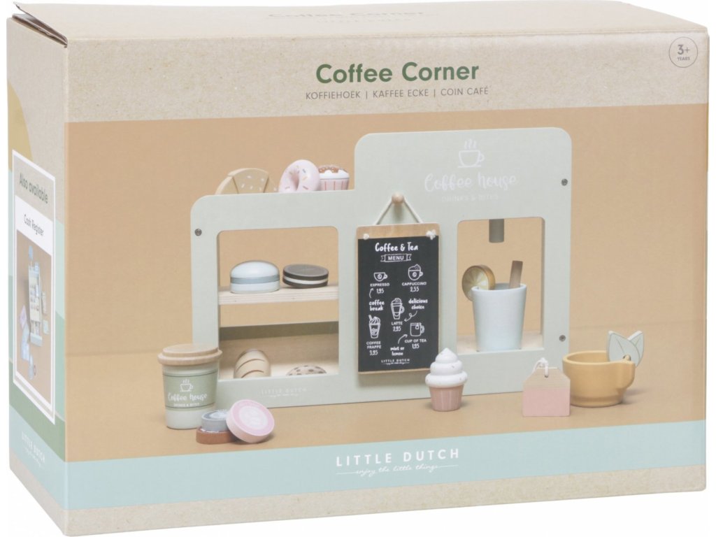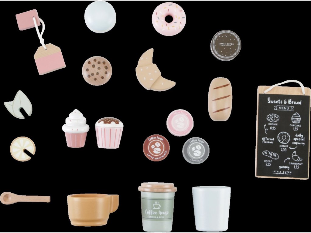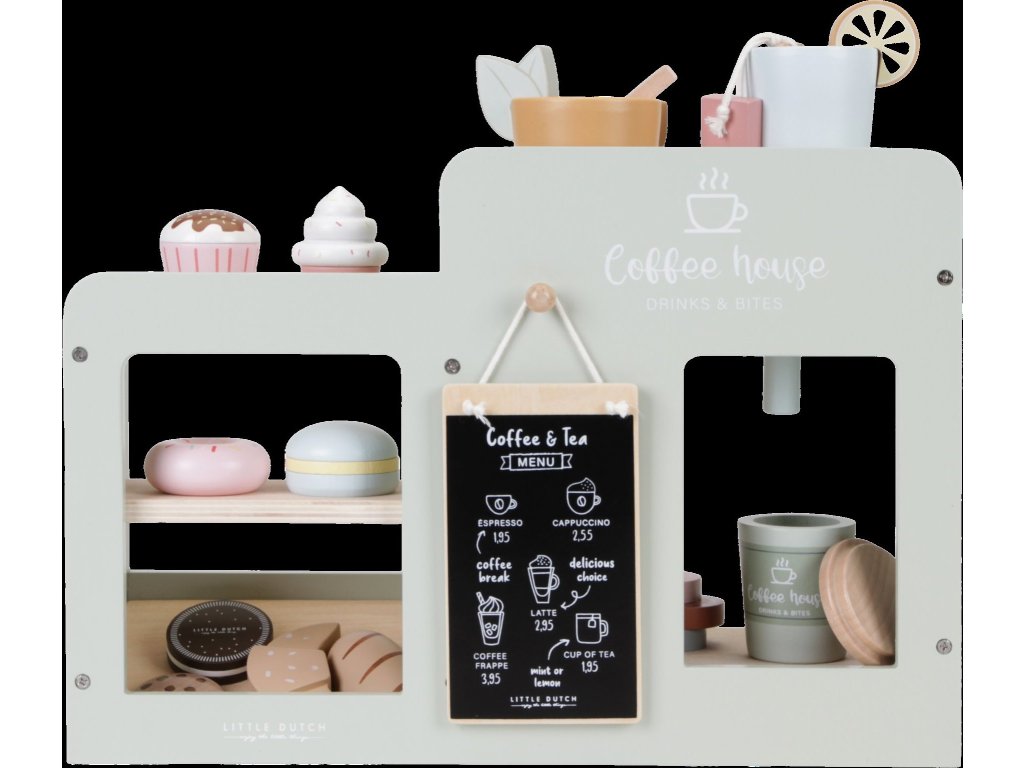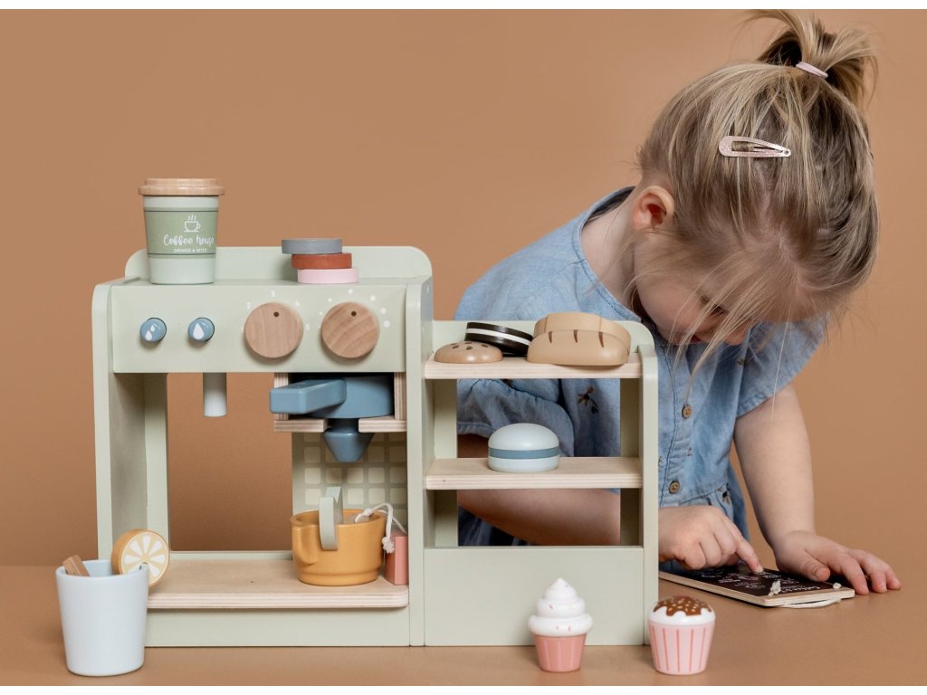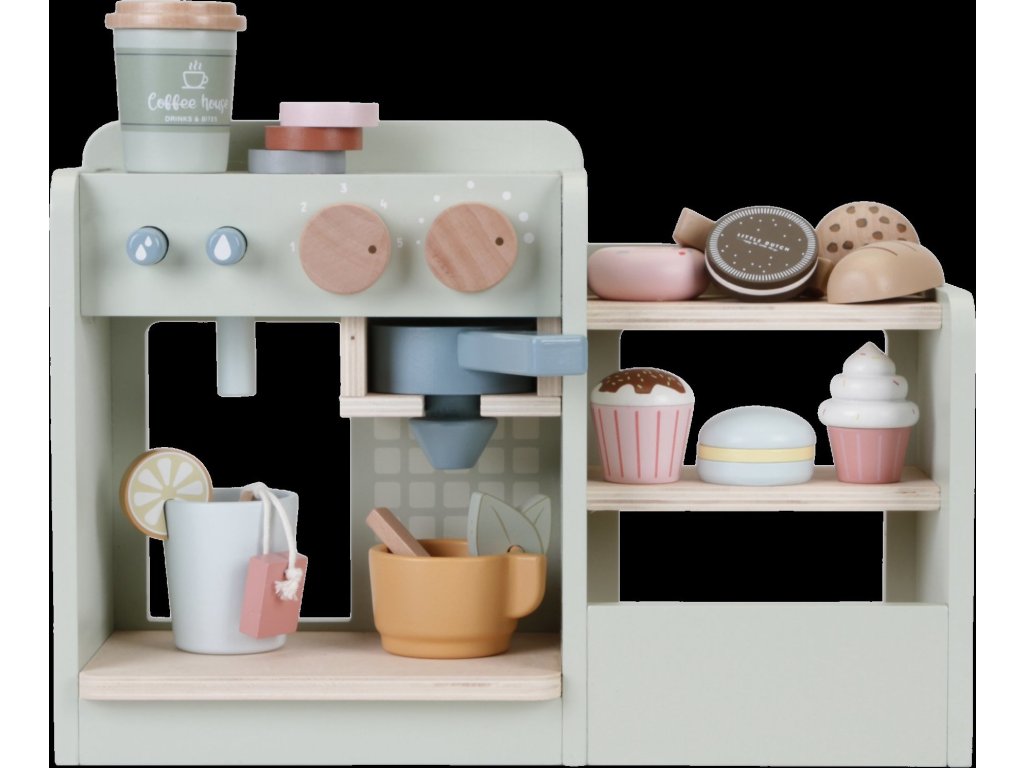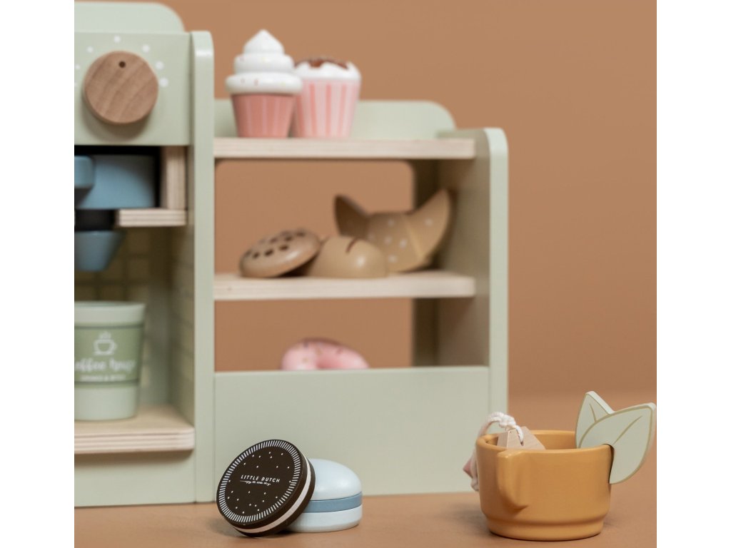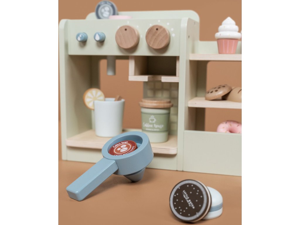 Dáte si kávu nebo čaj? S tímto dřevěným kávovarem s bohatým příslušenstvím si může vaše dítě otevřít doma vlastní kavárnu a pozvat vás na cappuccino či espresso spolu s dortíkem, koláčkem či sendvičem. Pro přípravu kávy stačí otočit knoflíkem, zmáčknout tlačítko a káva je hotová! Poličky s vystavenými zákusky lákají k ochutnání, nápojový lístek vám usnadní objednávání nápojů.