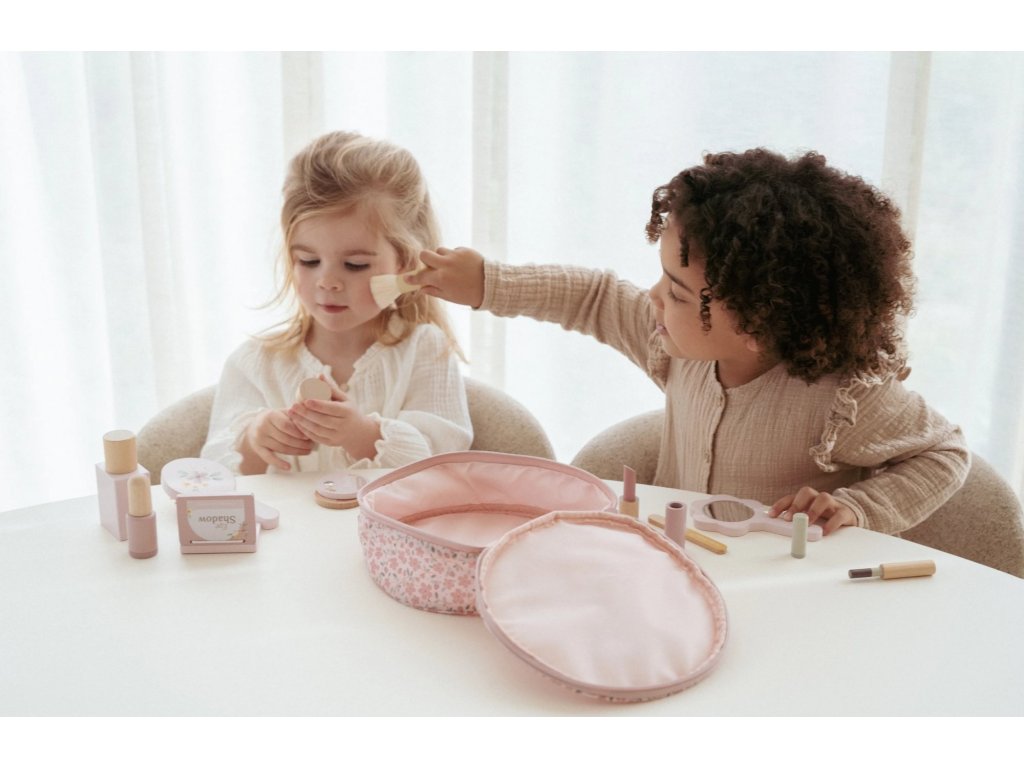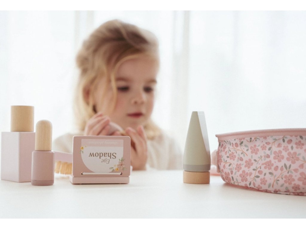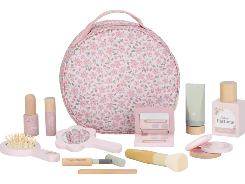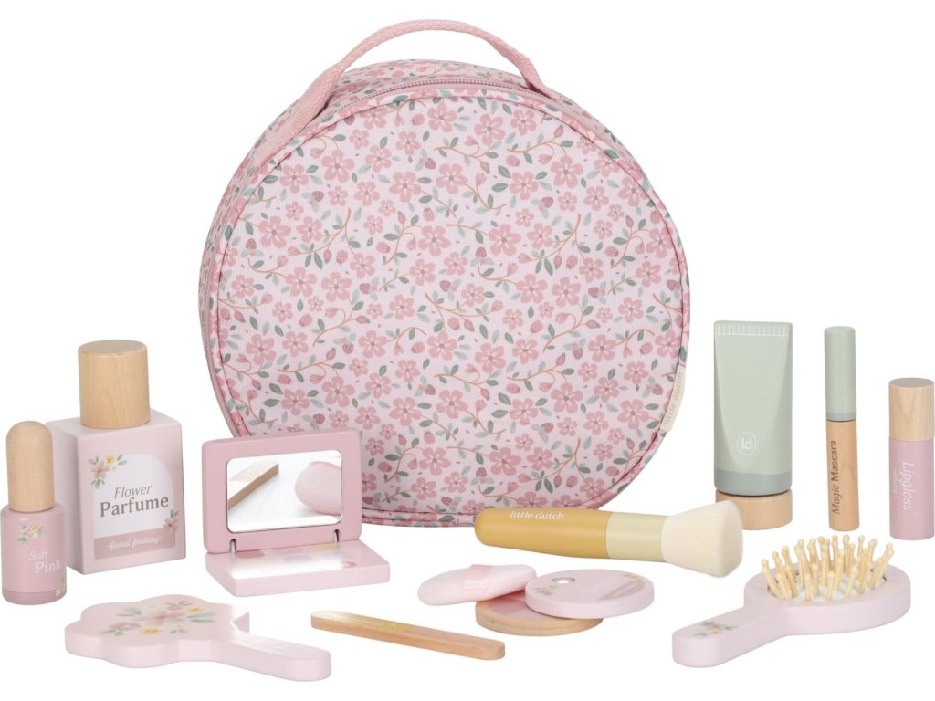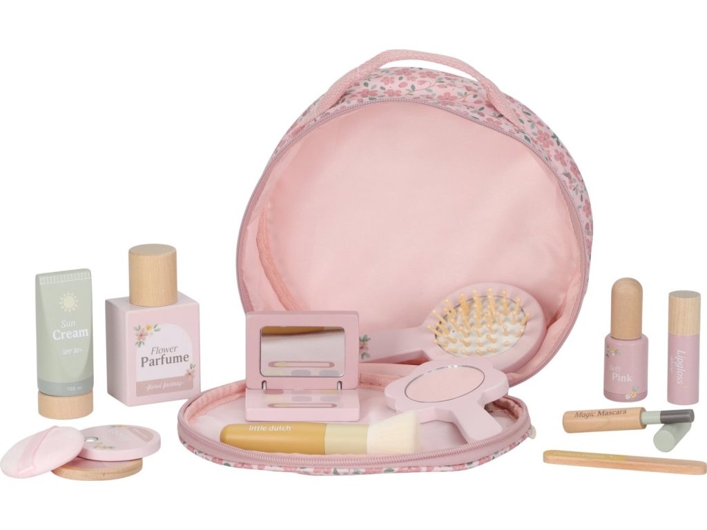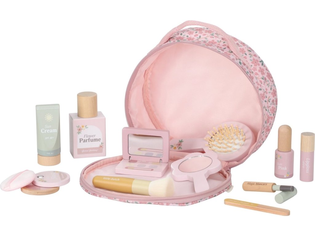 S touto krásnou dřevěnou kosmetickou sadou si vaše malá parádnice užije spoustu zábavy! Měkká látková taštička s květinovým vzorem ukrývá nejrůznější doplňky na hraní – zrcátko, lahvičku parfému, rtěnku, lak na nehty a další nezbytnosti pro každou malou stylistku.