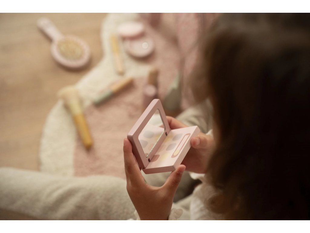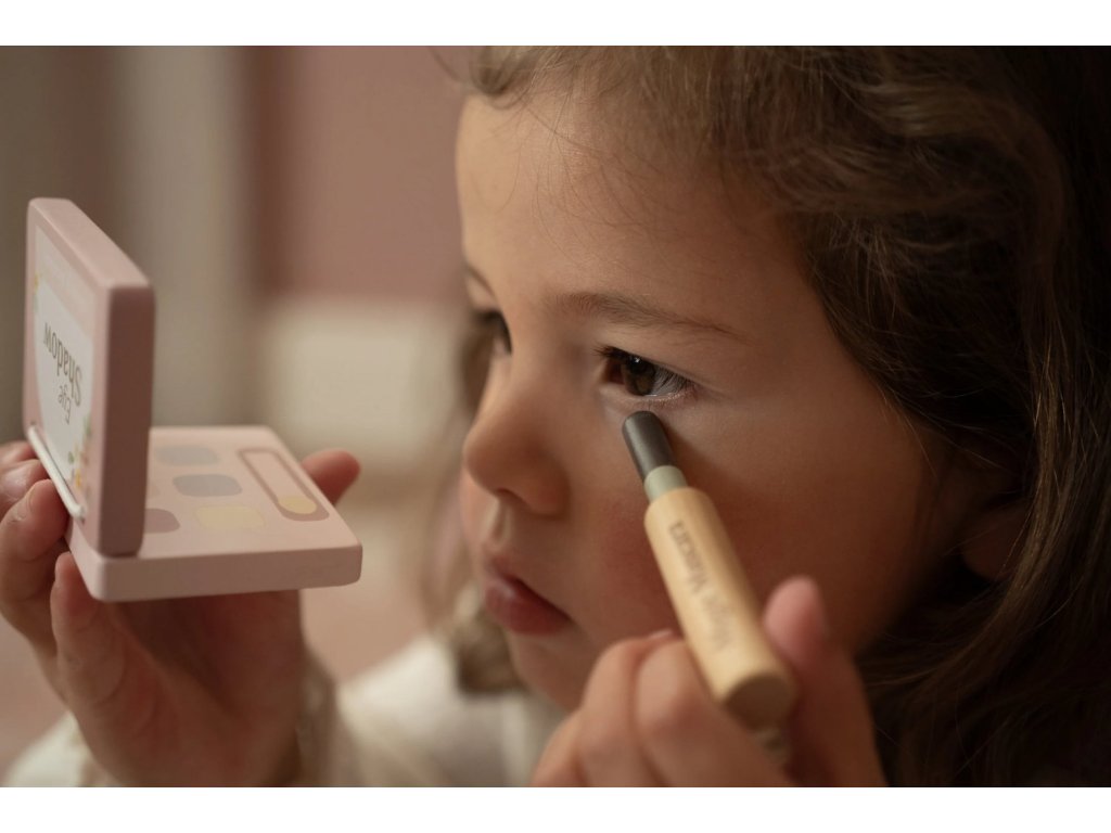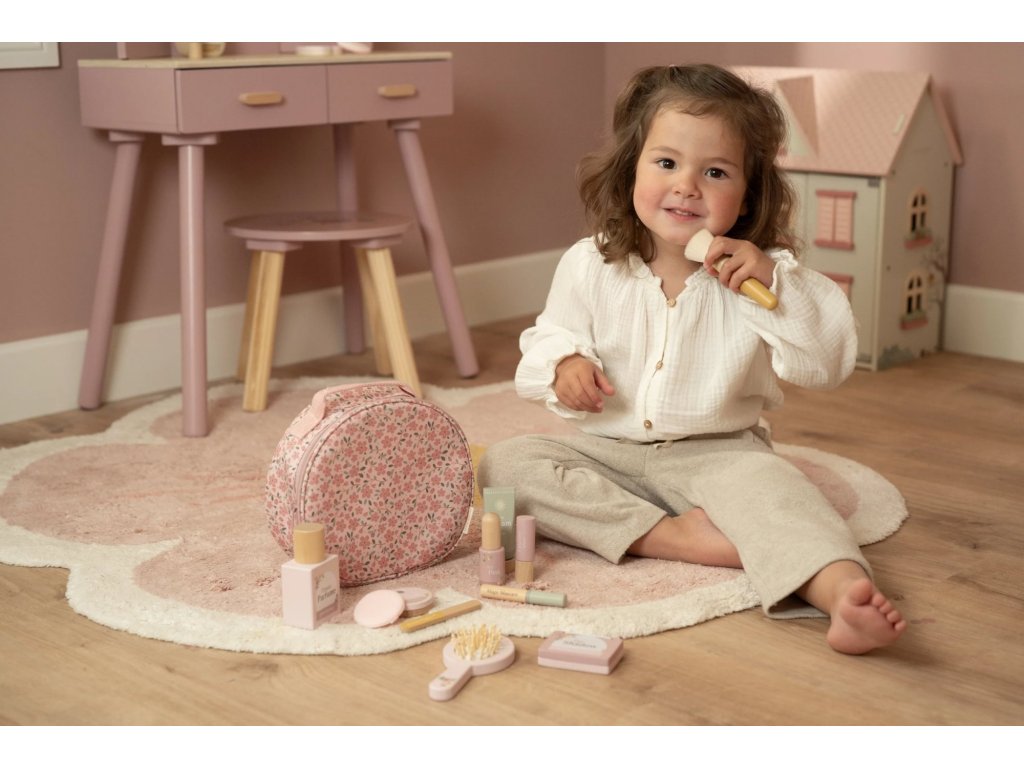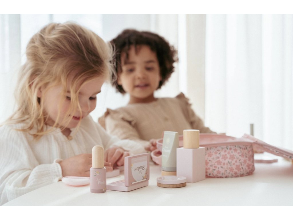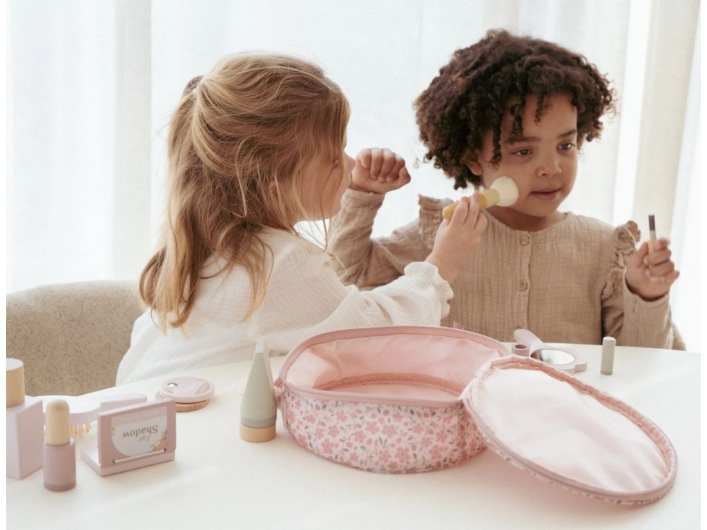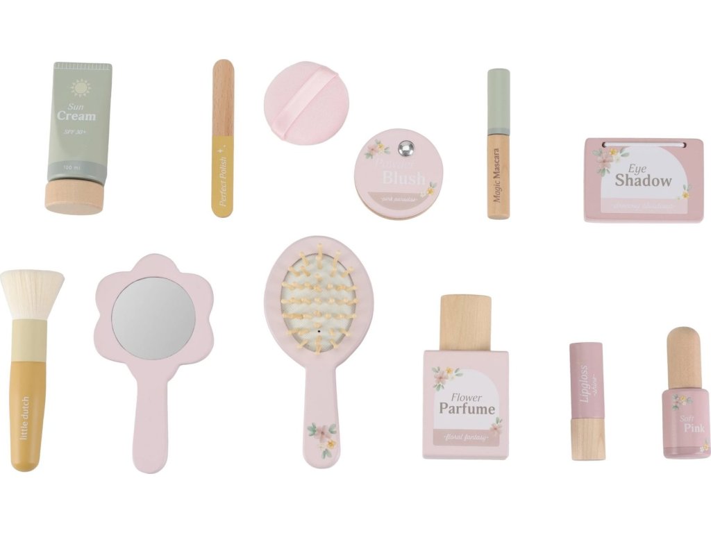 S touto krásnou dřevěnou kosmetickou sadou si vaše malá parádnice užije spoustu zábavy! Měkká látková taštička s květinovým vzorem ukrývá nejrůznější doplňky na hraní – zrcátko, lahvičku parfému, rtěnku, lak na nehty a další nezbytnosti pro každou malou stylistku.