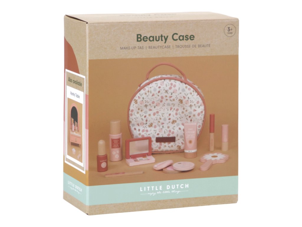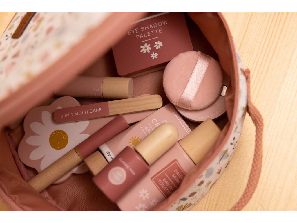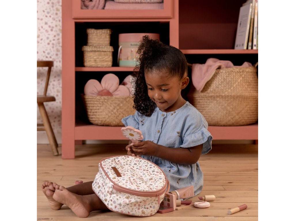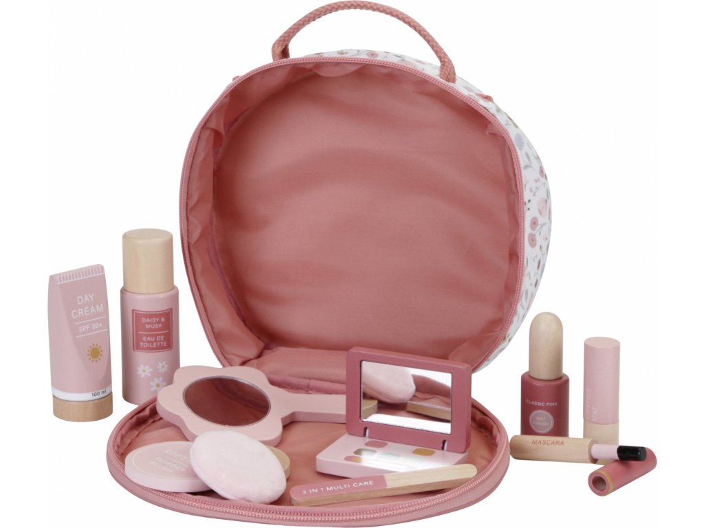 Kosmetická taštička na zip s krásným květinovým vzorem v sobě skrývá kompletní kosmetickou výbavu pro vaši malou parádnici. V taštičce najdete ruční zrcátko, lahvičku s parfémem, tubu s krémem, rtěnku, lak na nehty, pudr na obličej, labutěnku, oční stíny, řasenku a pilník na nehty. Vše v krásném dřevěném provedení, které je zárukou dlouhé životnosti a hraní bez nepořádku.