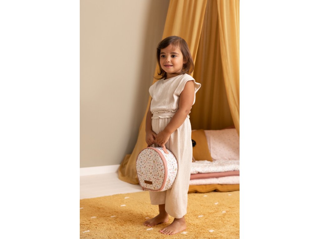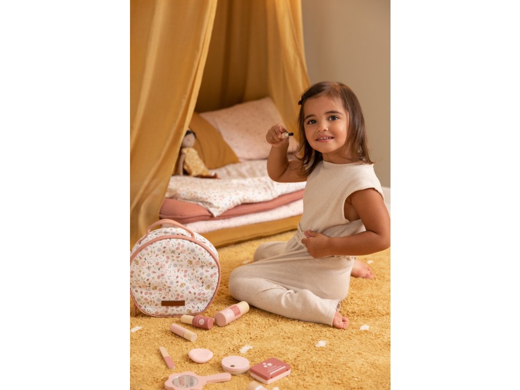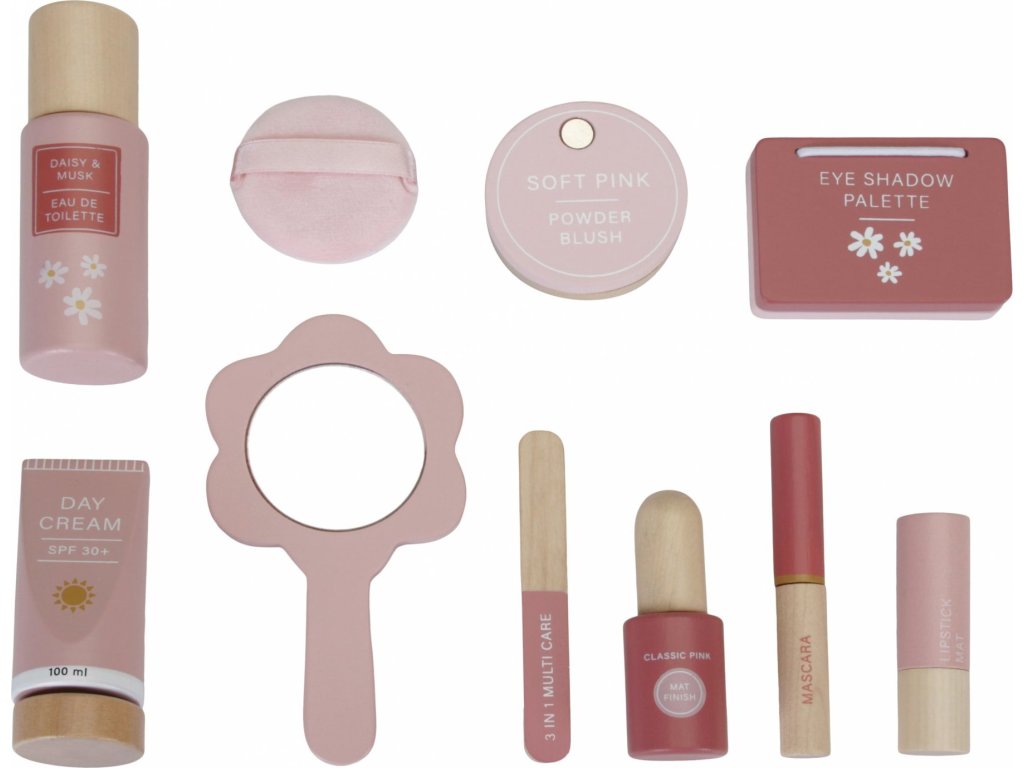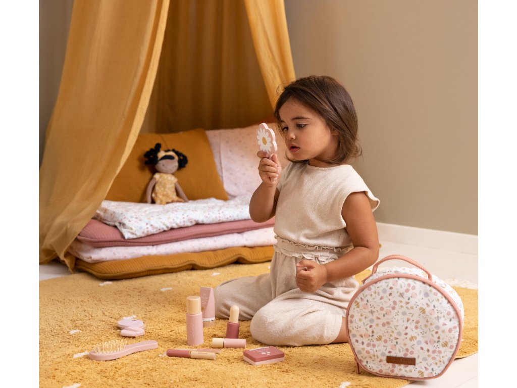 Kosmetická taštička na zip s krásným květinovým vzorem v sobě skrývá kompletní kosmetickou výbavu pro vaši malou parádnici. V taštičce najdete ruční zrcátko, lahvičku s parfémem, tubu s krémem, rtěnku, lak na nehty, pudr na obličej, labutěnku, oční stíny, řasenku a pilník na nehty. Vše v krásném dřevěném provedení, které je zárukou dlouhé životnosti a hraní bez nepořádku.