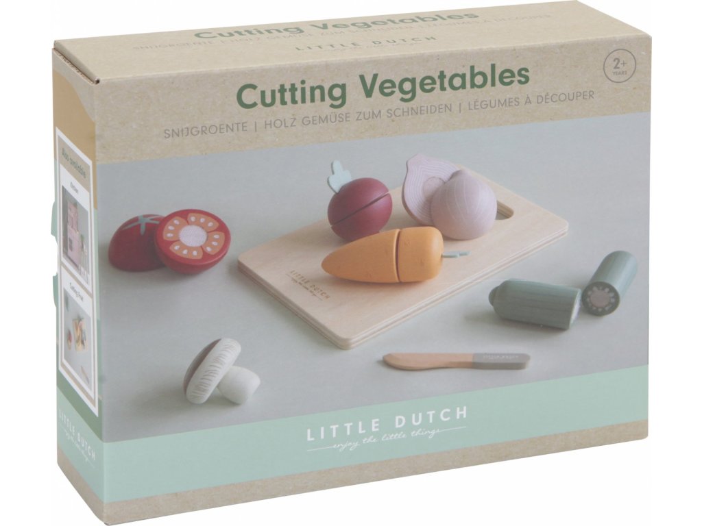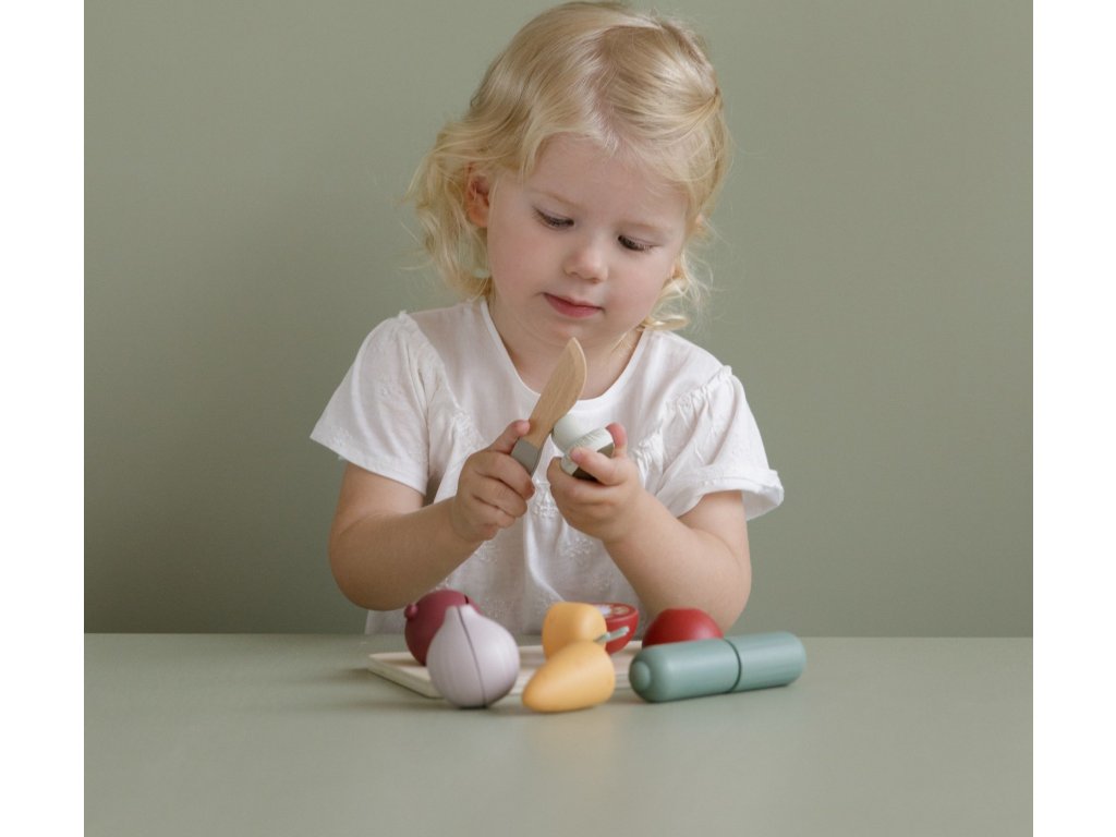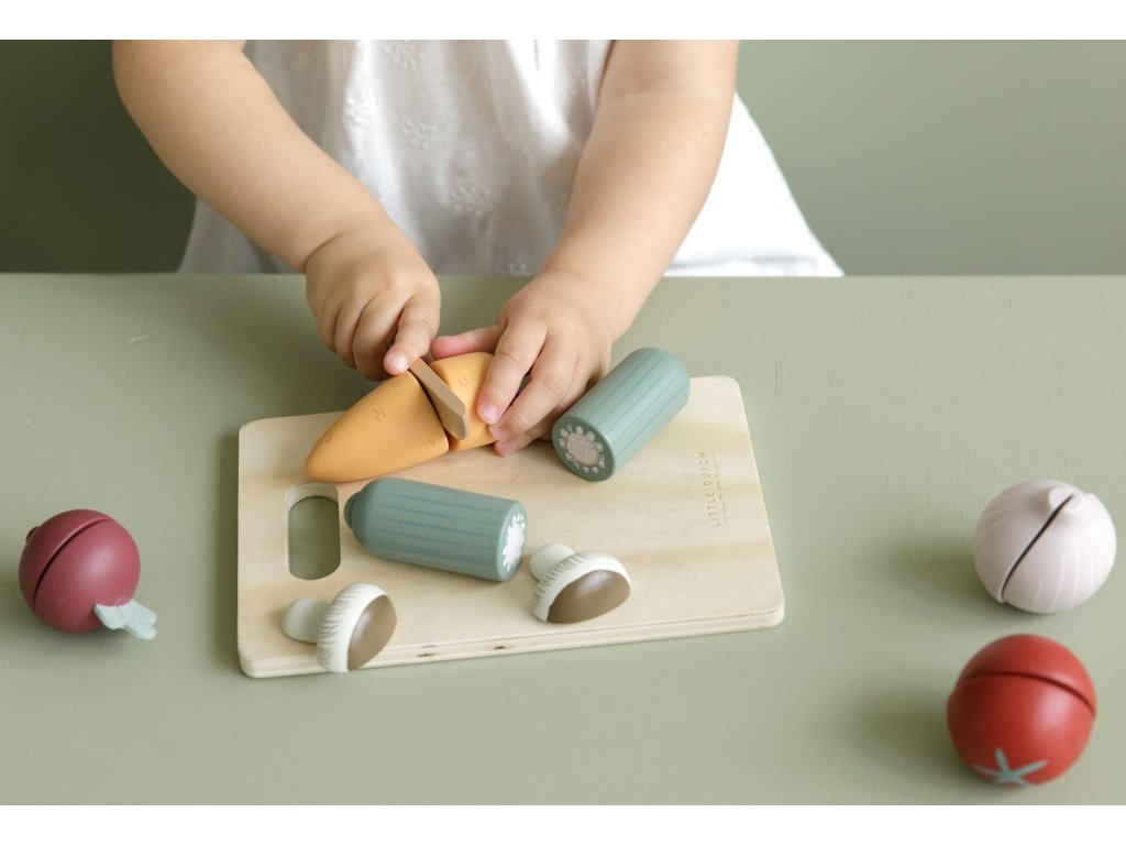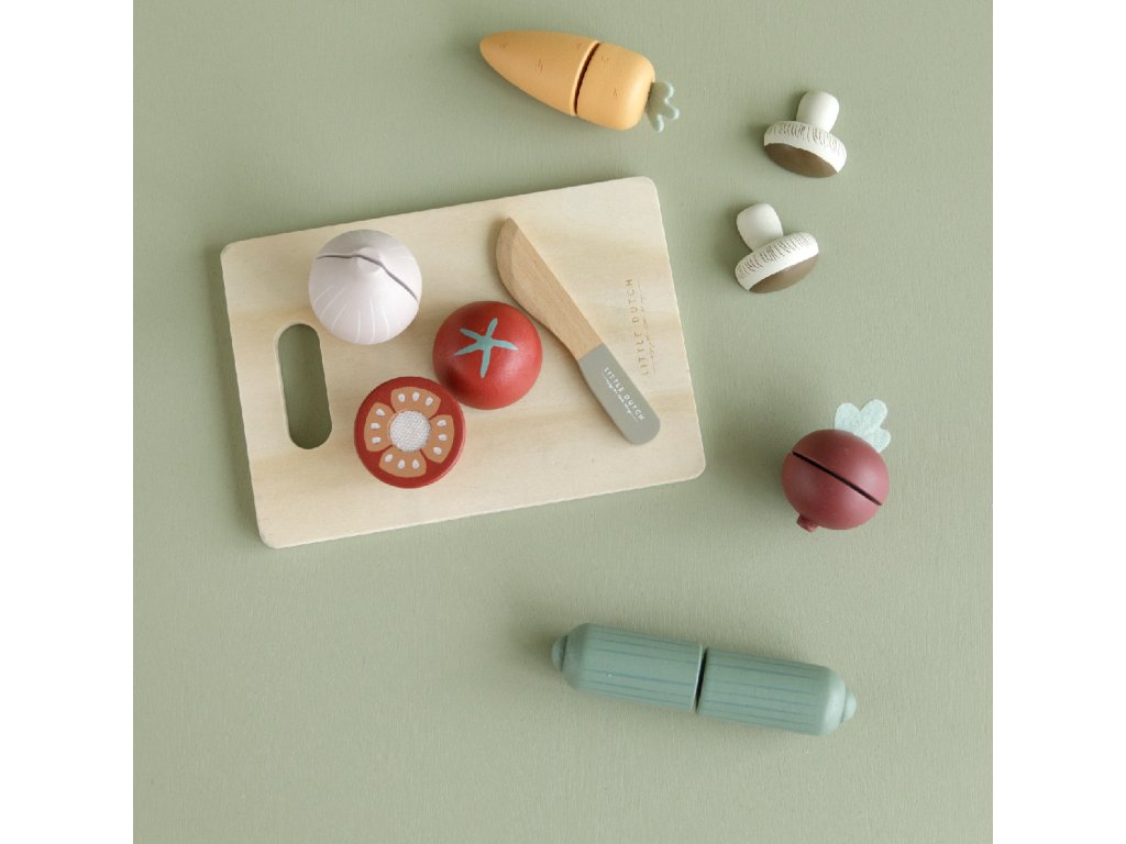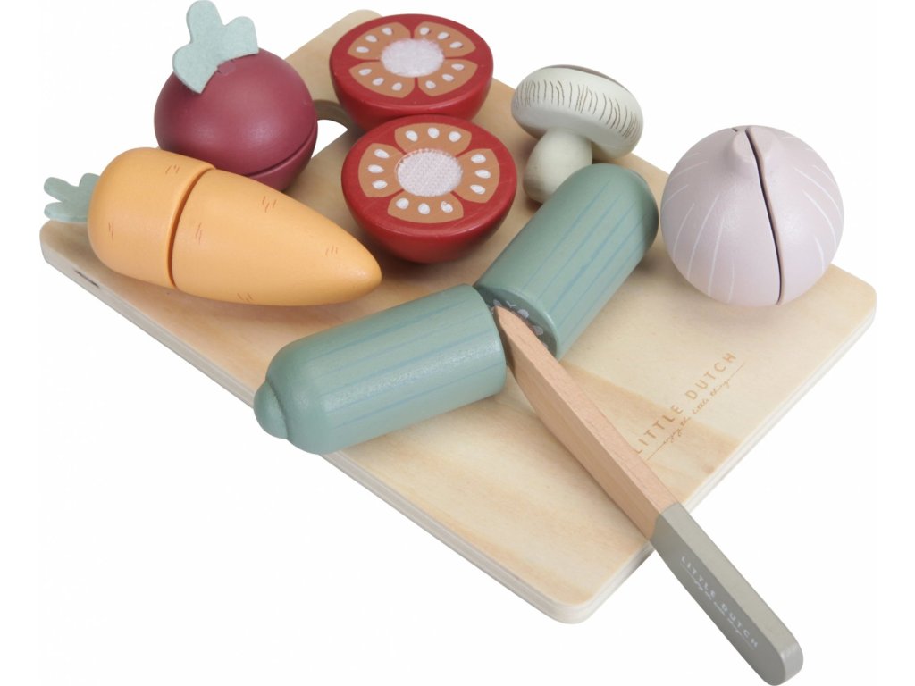 Zeleninu je potřeba před vařením nakrájet, to ví každý malý kuchař i kuchařka. Tato dřevěná sada obsahuje 6 druhů zeleniny (mrkev, okurku, hříbek, rajče, cibuli a červenou řepu), dřevěný nožík a krájecí prkénko. Každý kousek zeleniny je možné rozdělit na dva kusy a opět spojit pomocí suchého zipu.