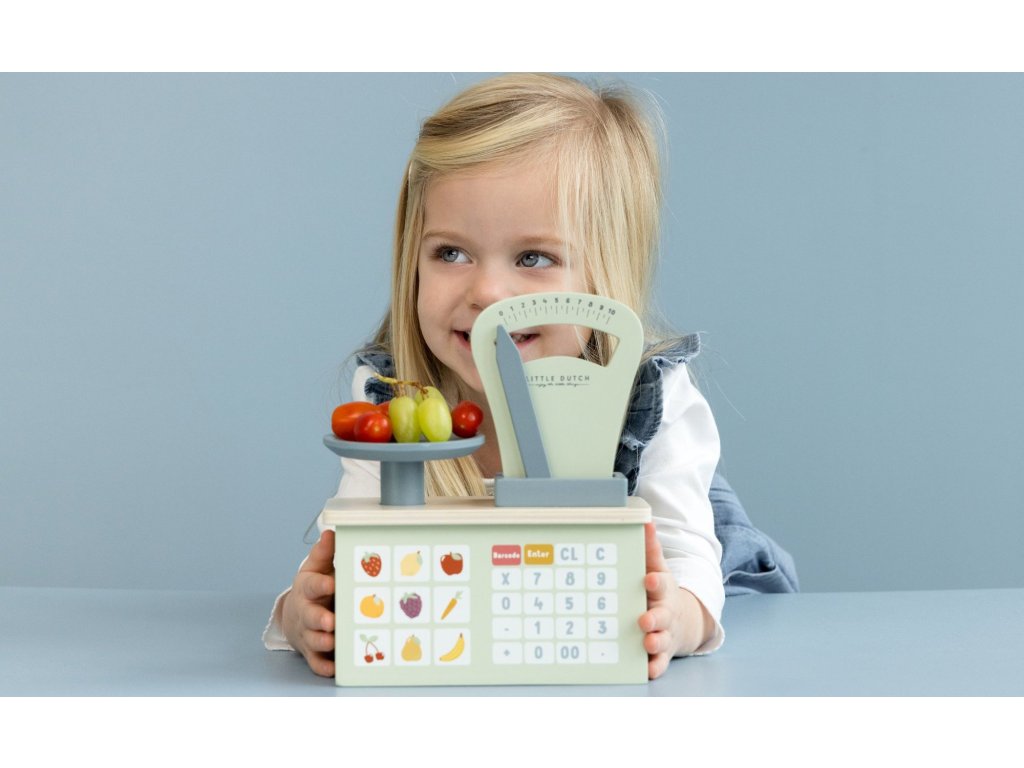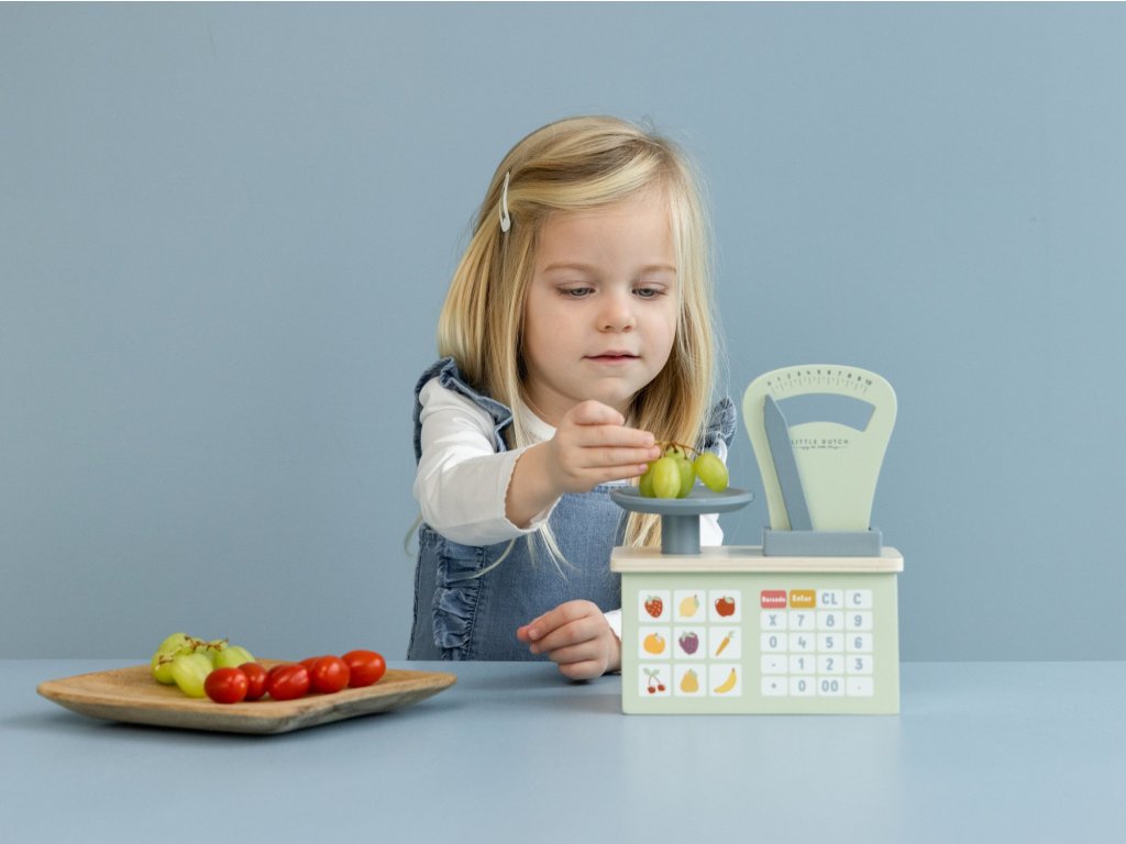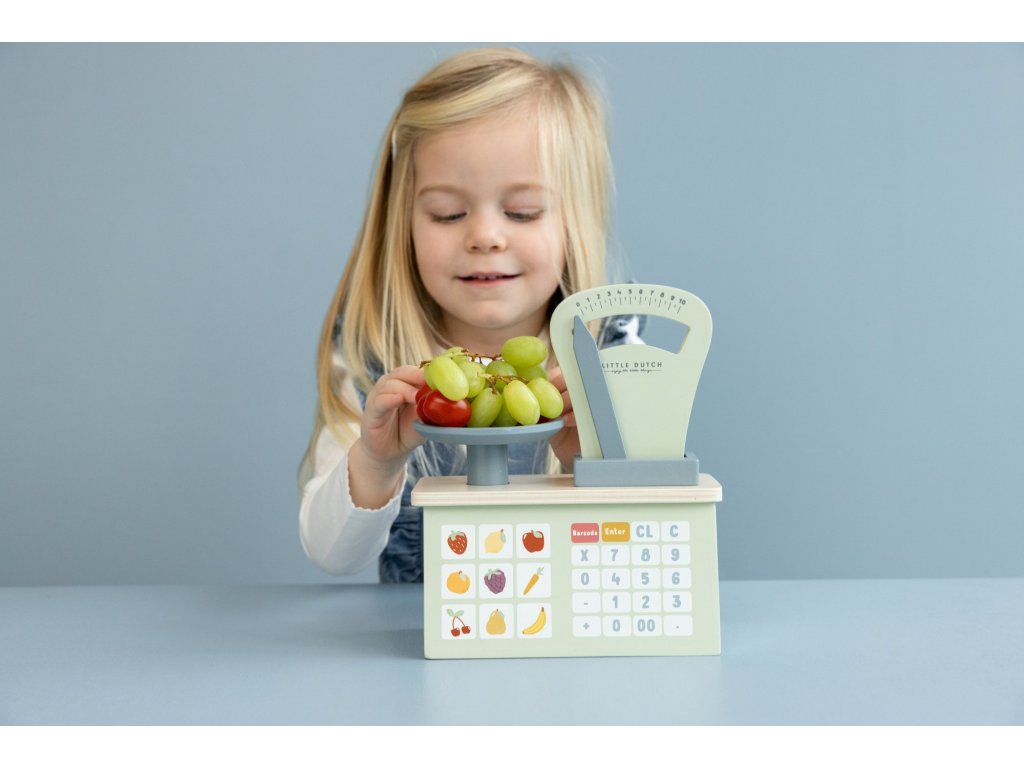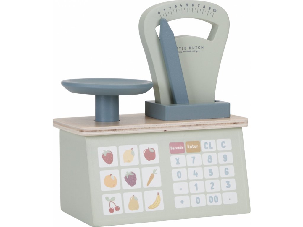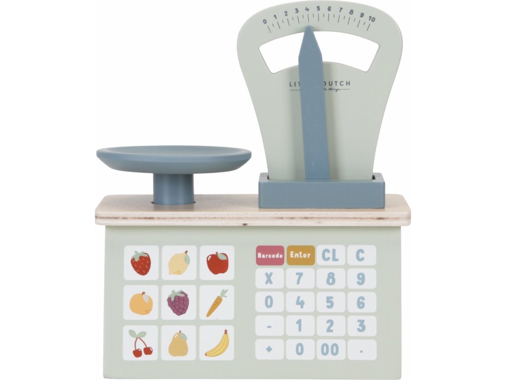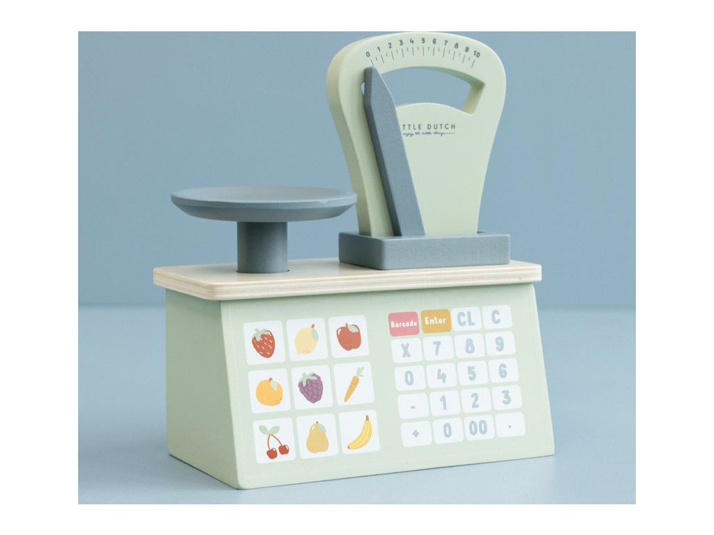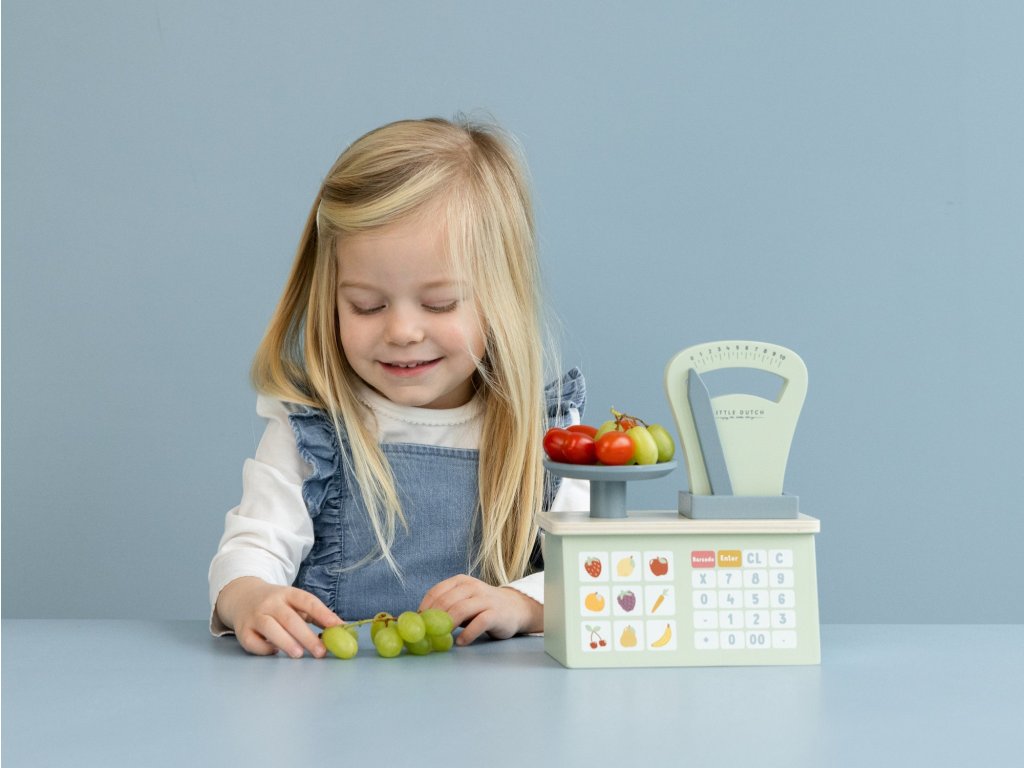 Váha v krásném dřevěném provedení je užitečnou pomůckou kuchaře či kuchařky v dětské kuchyni i prodavače či prodavačky ve stánku se zeleninou a ovocem.