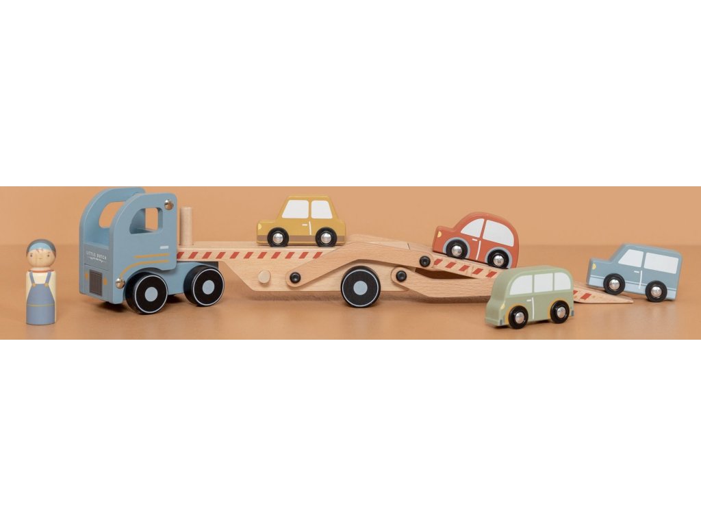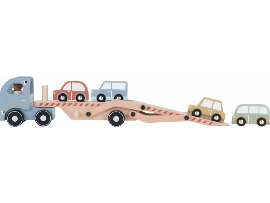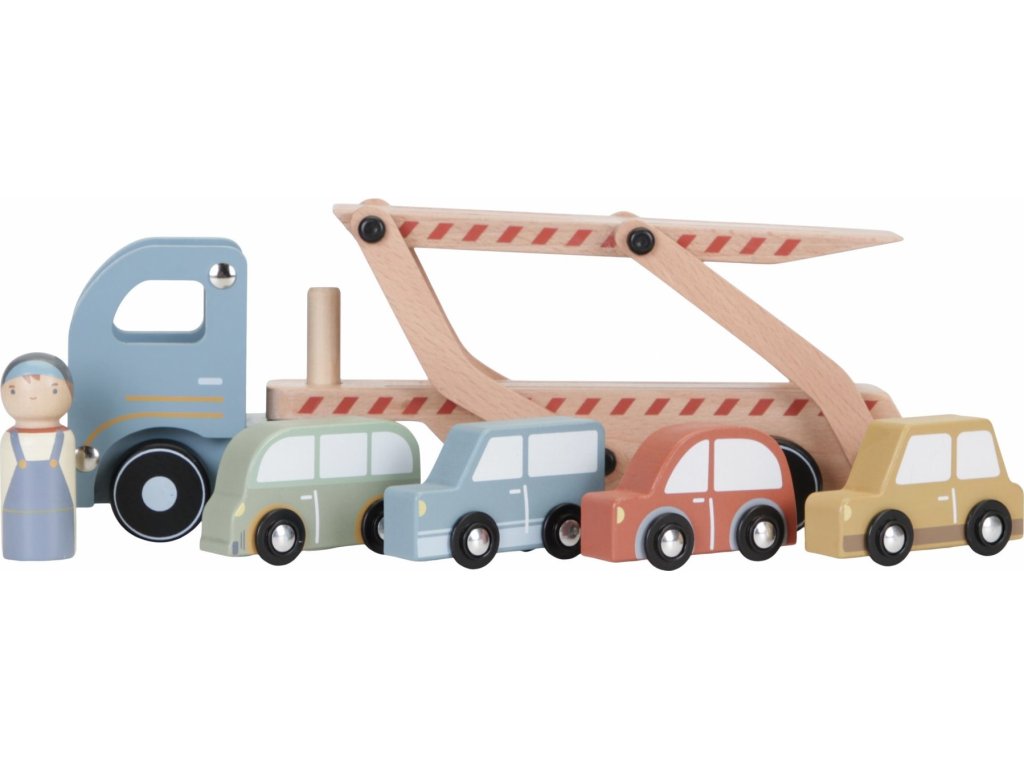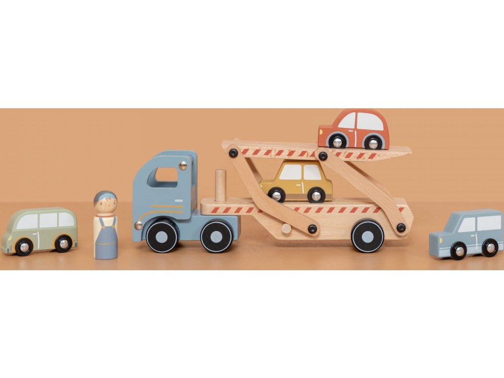 Dřevěný kamion se 4 auty je tou pravou hračkou pro všechny malé řidiče. Sklápěcí nákladní plocha umožní autům pohodlně najet na kamion a stejně pohodlně z něj opět sjet.
