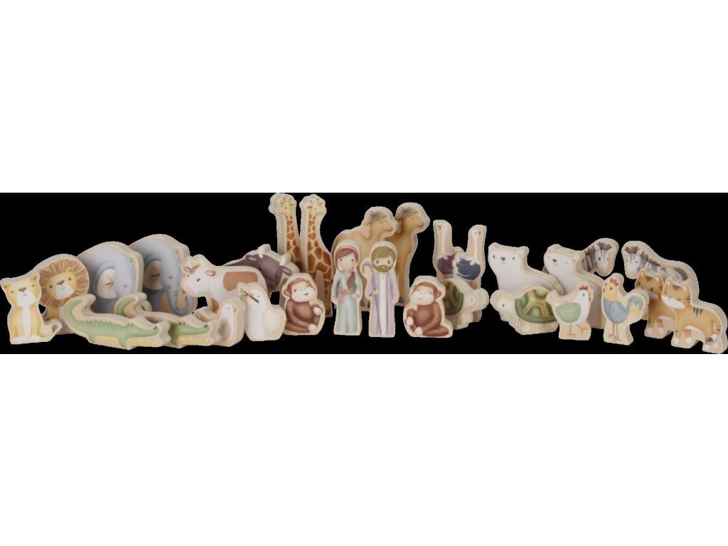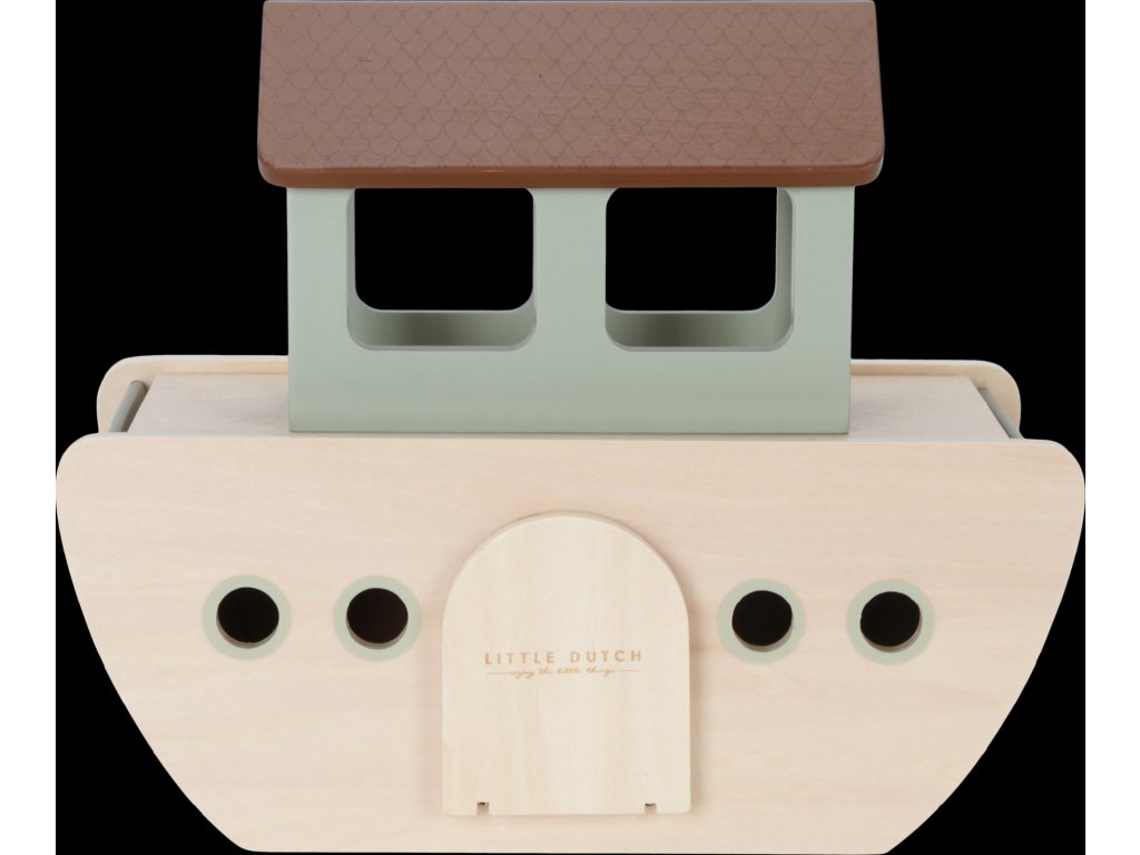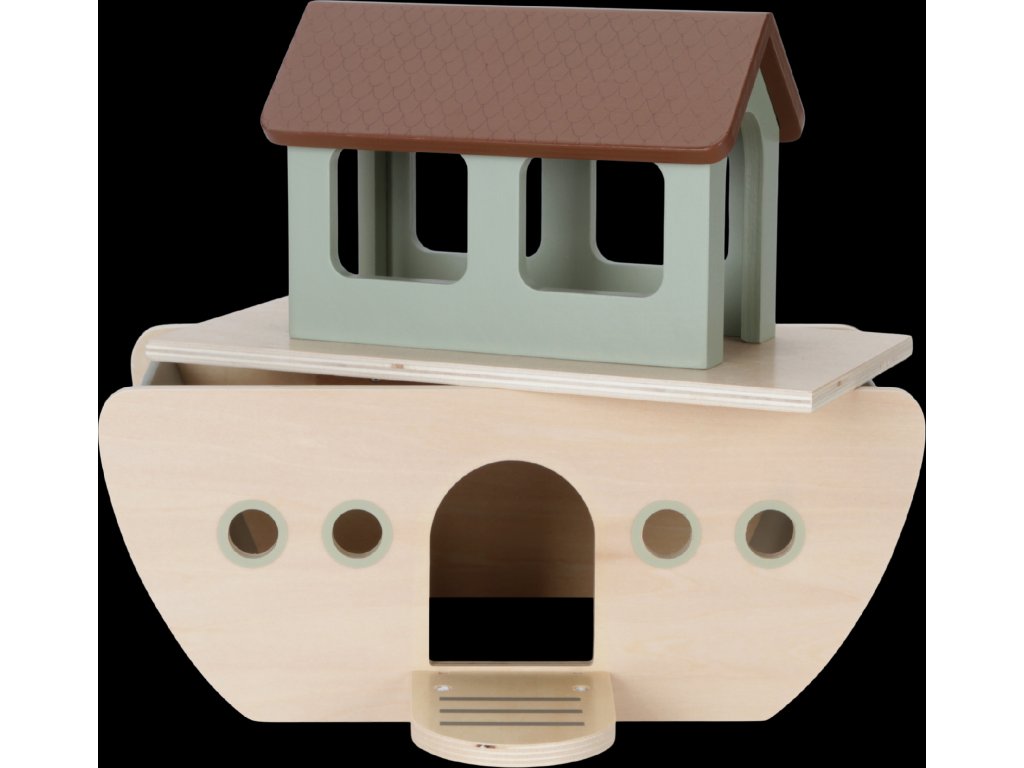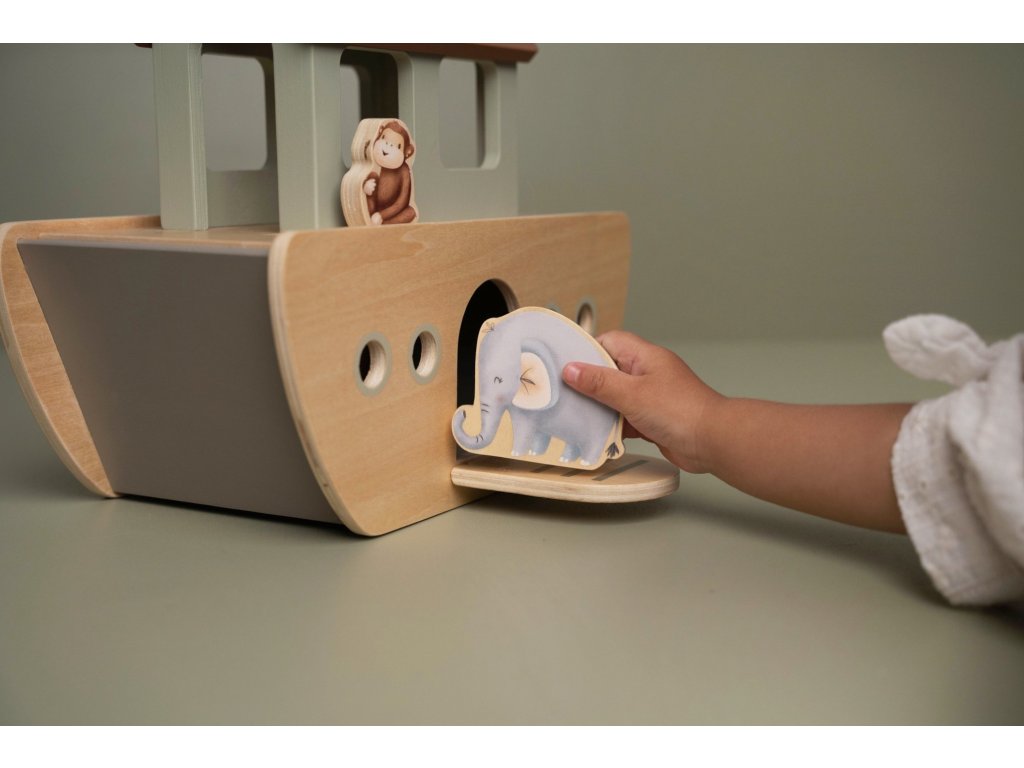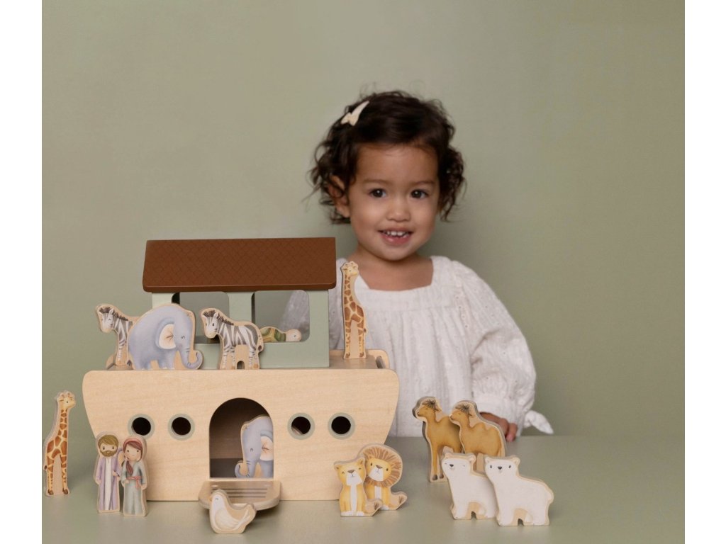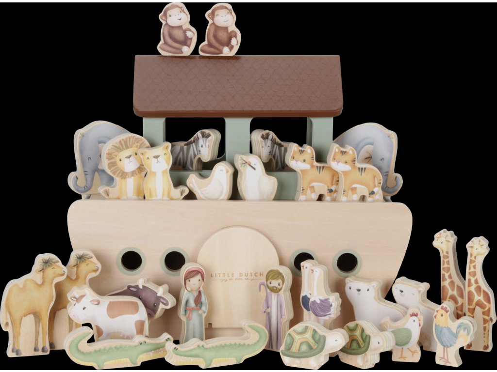 25-dílná dřevěná sada obsahuje archu s dveřmi, palubu, kterou lze zvednout a přivést všechna zvířata na palubu. Noe vezme svoji ženu a velkou skupinu zvířat na cestu přes oceán: 2 lvy, 2 slony, 2 zebry, 2 opice, 2 holuby, 2 krokodýly, 2 želvy, 2 žirafy, 2 pštrosy, 2 krávy, slepici a kohouta.