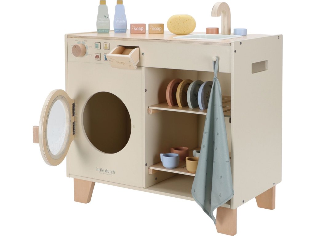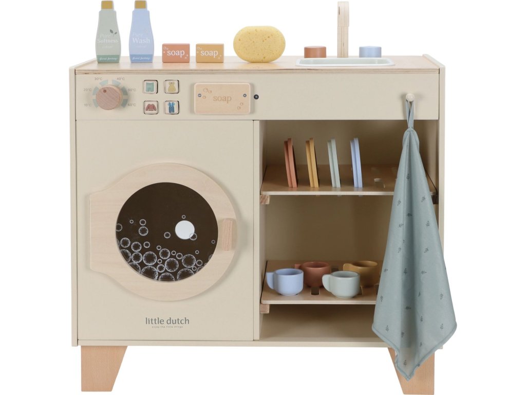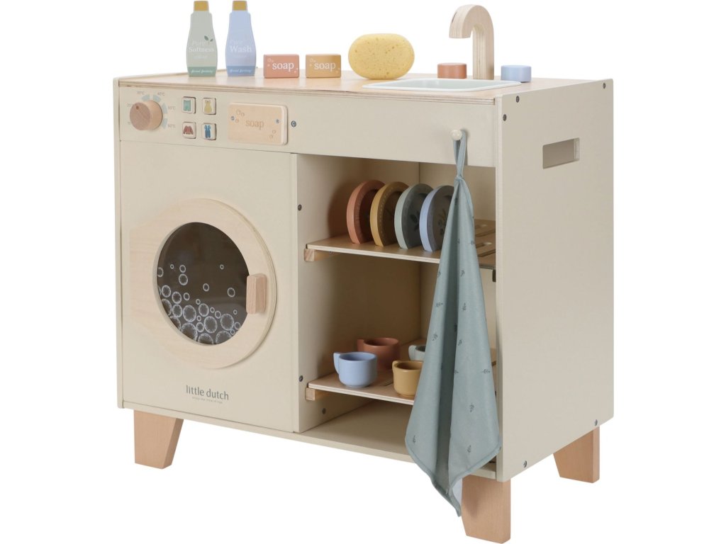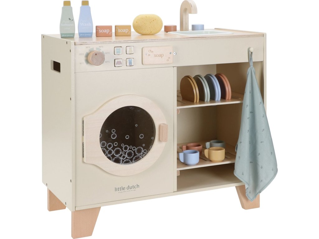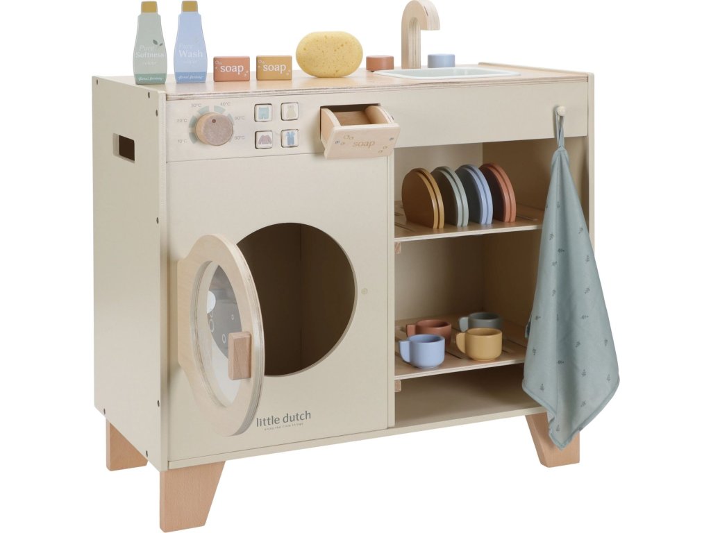 Stylový dřevěný set pračky a dřezu Little Dutch potěší každé dítě, které se rádo stará o své panenky či plyšáky. V pračce jim vypere jejich oblečky, v dřezu umyje nádobí, na kterém servírovalo panenkám svačinku. Díky otočným knoflíkům, tlačítkům i vysunovací přihrádce na prací prostředek působí pračka i dřez realisticky a podněcují děti k nápodobě domácích prací. Součástí balení je bohaté příslušenství: čtyři šálky, čtyři podšálky, mycí houba, prací prostředek, mýdlové kostky a látková utěrka.