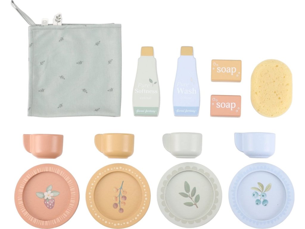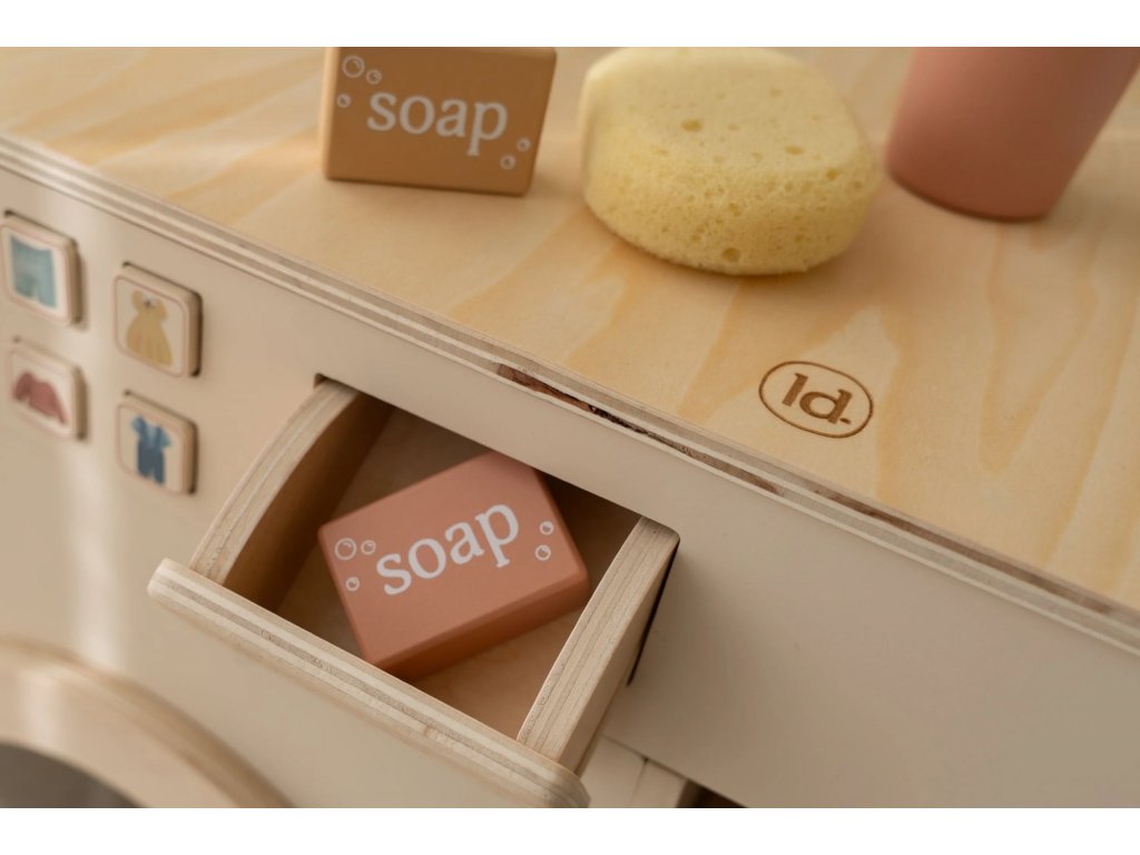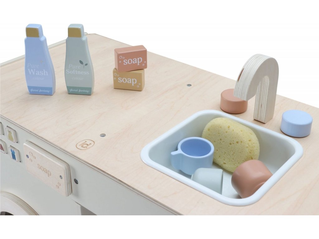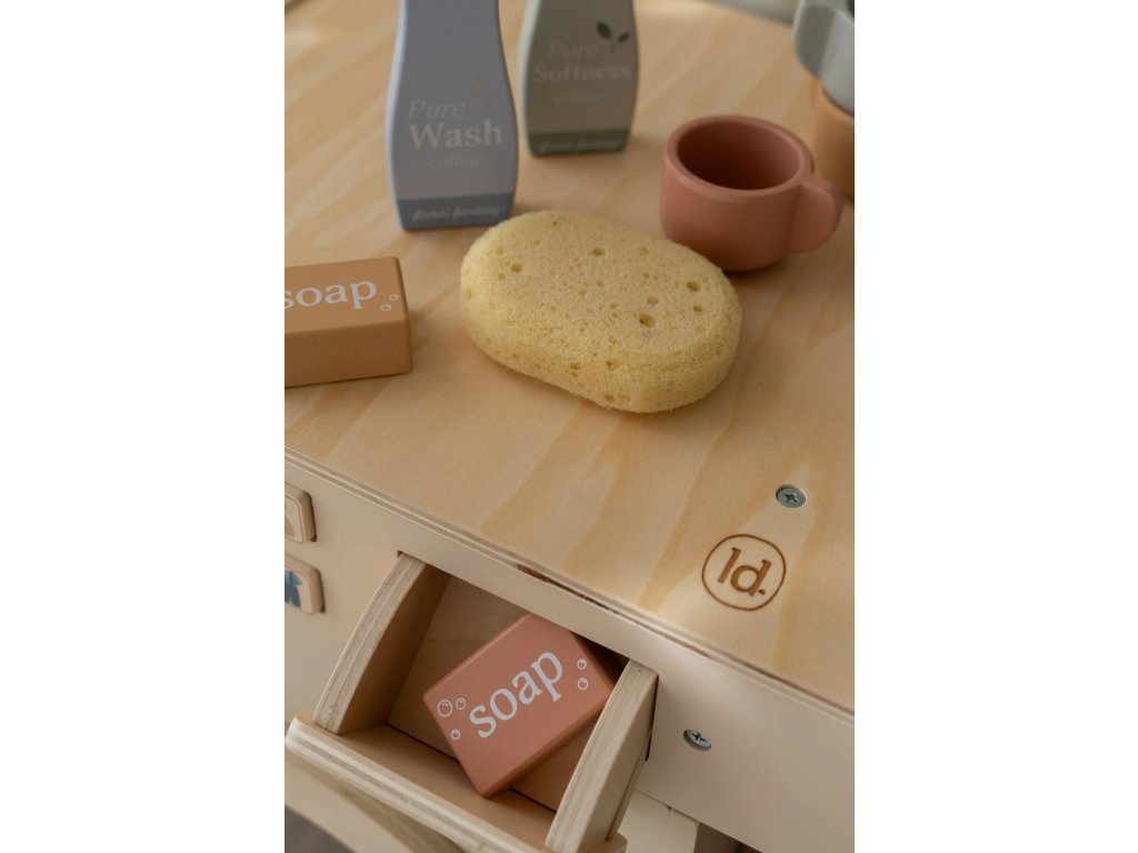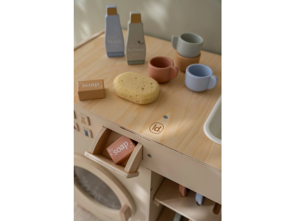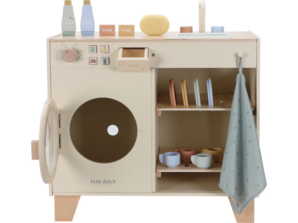 Stylový dřevěný set pračky a dřezu Little Dutch potěší každé dítě, které se rádo stará o své panenky či plyšáky. V pračce jim vypere jejich oblečky, v dřezu umyje nádobí, na kterém servírovalo panenkám svačinku. Díky otočným knoflíkům, tlačítkům i vysunovací přihrádce na prací prostředek působí pračka i dřez realisticky a podněcují děti k nápodobě domácích prací. Součástí balení je bohaté příslušenství: čtyři šálky, čtyři podšálky, mycí houba, prací prostředek, mýdlové kostky a látková utěrka.