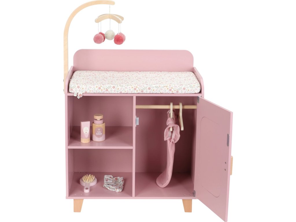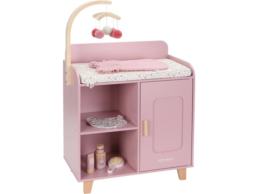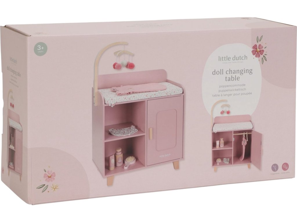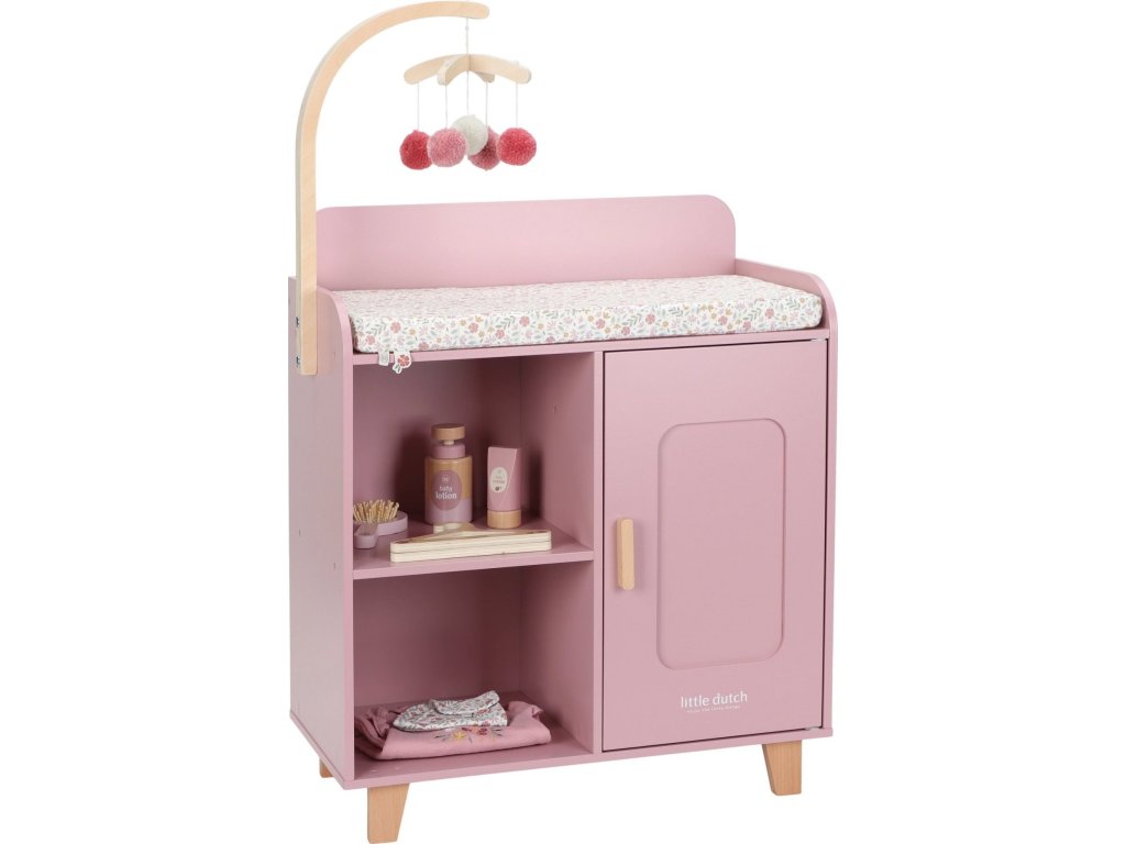 Elegantní přebalovací pult Little Dutch umožňuje dětem napodobovat každodenní péči o miminko a starat se o panenky stejně, jako se maminka či tatínek starají o své miminko. Součástí balení je měkká přebalovací podložka s romantickým květinovým potiskem, závěsný kolotoč, spací pytel, textilní plena, dvě ramínka a dřevěné doplňky pro péči o panenku. Praktická skříňka a poličky ve spodní části přebalovacího pultu umožňují mít vše potřebné pro péči o panenku vždy po ruce a uklizené.
