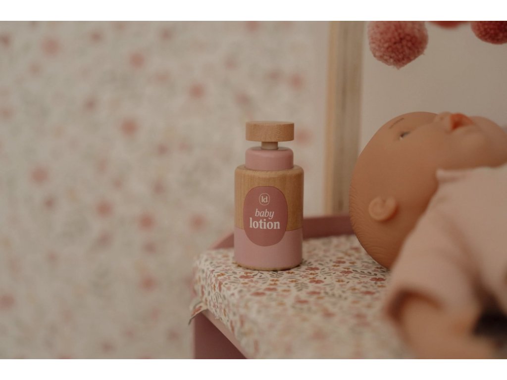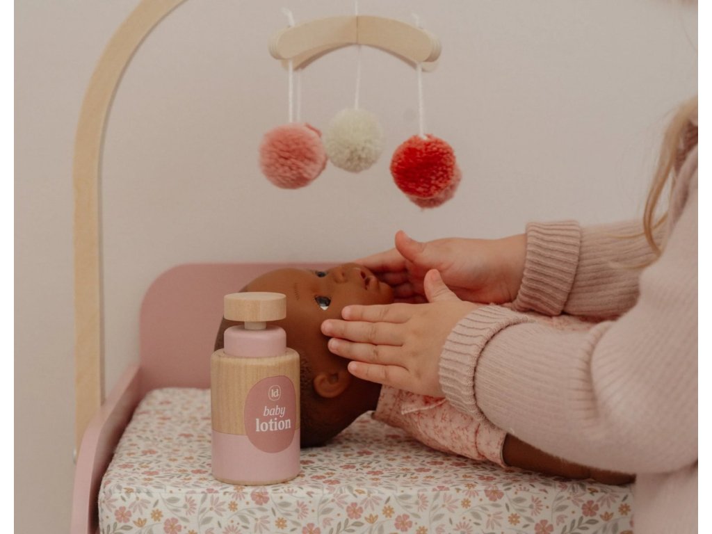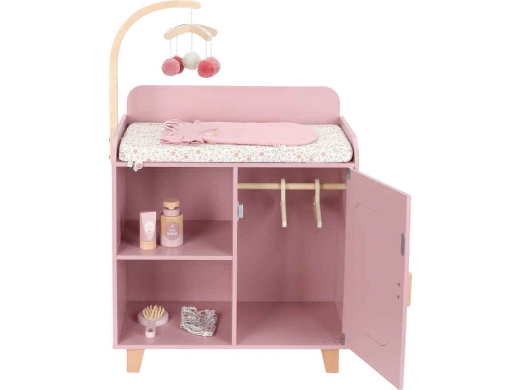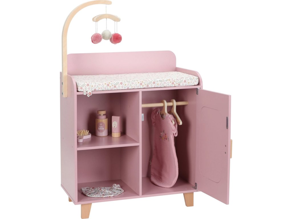 Elegantní přebalovací pult Little Dutch umožňuje dětem napodobovat každodenní péči o miminko a starat se o panenky stejně, jako se maminka či tatínek starají o své miminko. Součástí balení je měkká přebalovací podložka s romantickým květinovým potiskem, závěsný kolotoč, spací pytel, textilní plena, dvě ramínka a dřevěné doplňky pro péči o panenku. Praktická skříňka a poličky ve spodní části přebalovacího pultu umožňují mít vše potřebné pro péči o panenku vždy po ruce a uklizené.