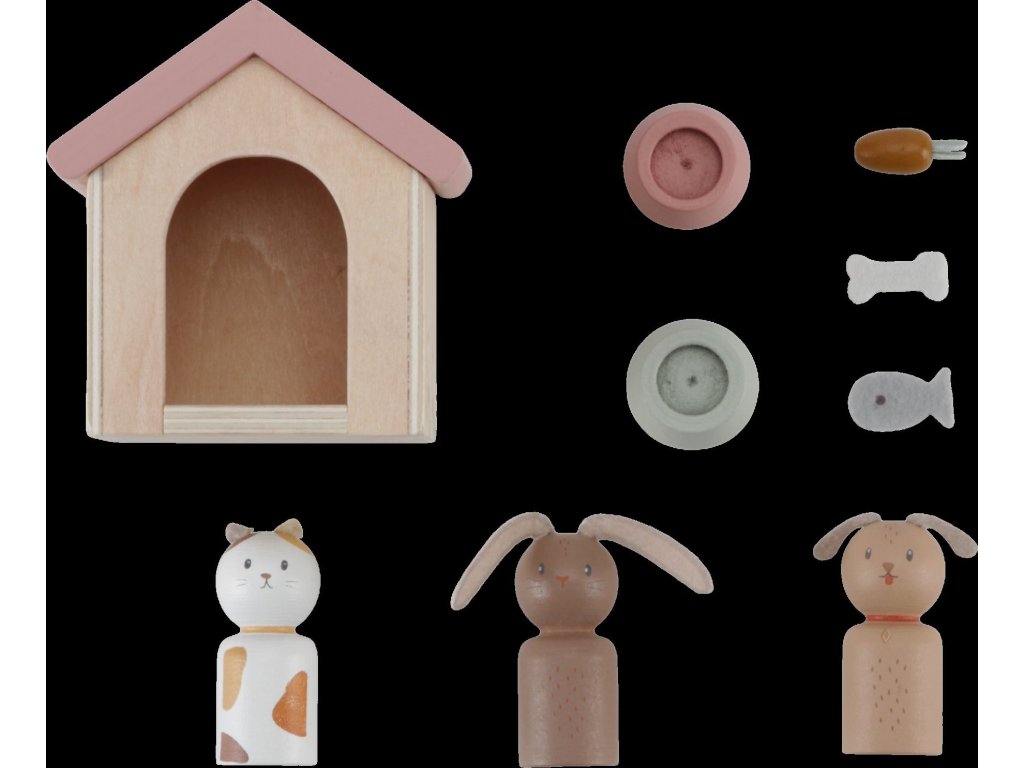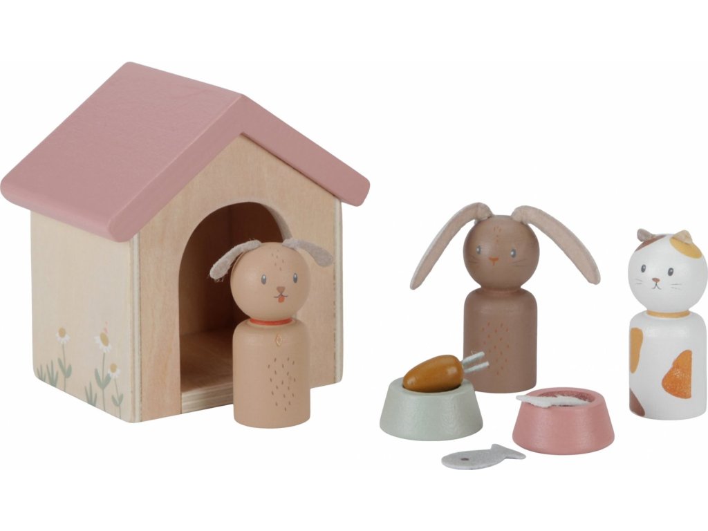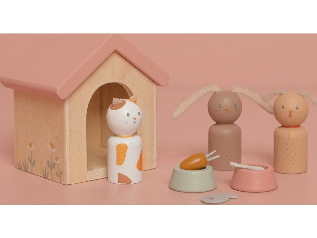 Sada s domácími mazlíčky v krásném dřevěném provedení je vhodný doplněk k dřevěnému domečku pro panenky Little Dutch.