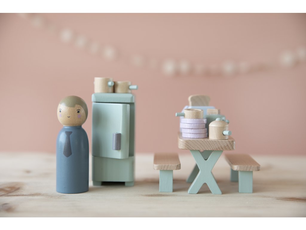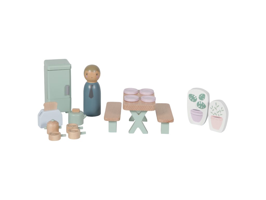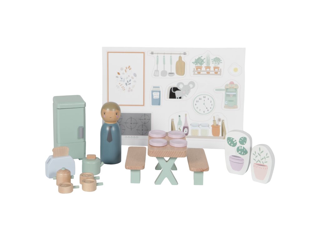 Sada obsahuje stůl, dvě lavice, lednici, toastovač s toustem, čajovou konvici, 4 talíře, 4 hrnce, 2 květiny, figurku tatínka a sadu samolepek.