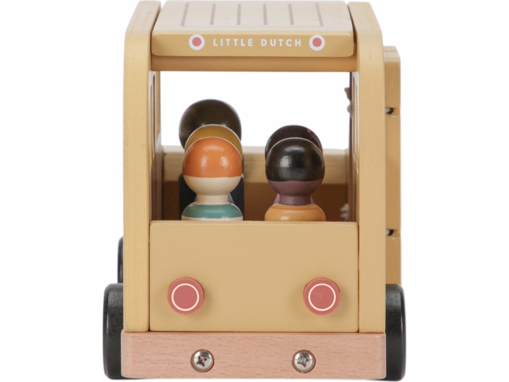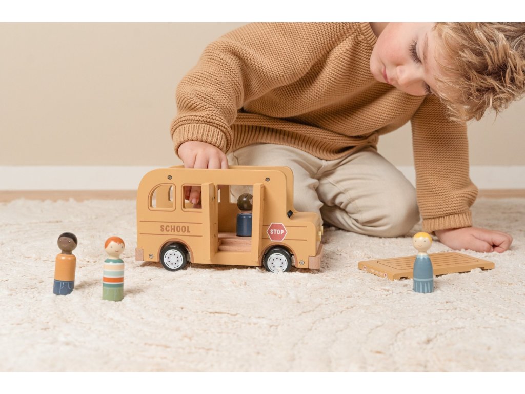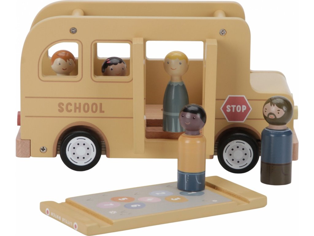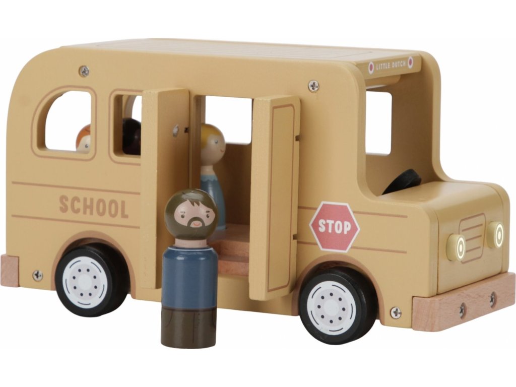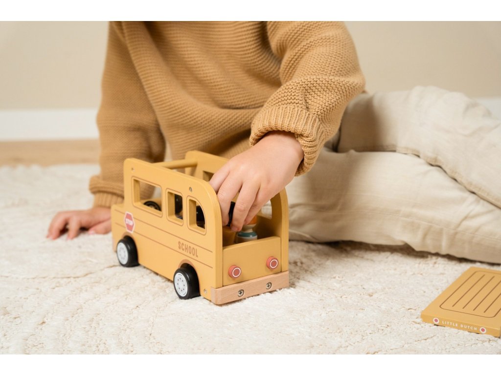 Školní autobus v kvalitním dřevěném provedení má odnímatelnou střechu a otevírací dveře, aby bylo možné dovnitř posadit školáky a řidiče. Jakmile jsou všichni cestující usazeni, řidič může nastartovat a vydat se na cestu do školy!