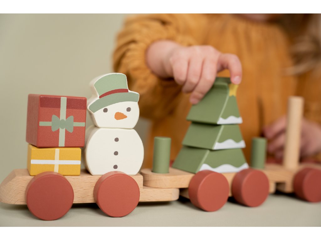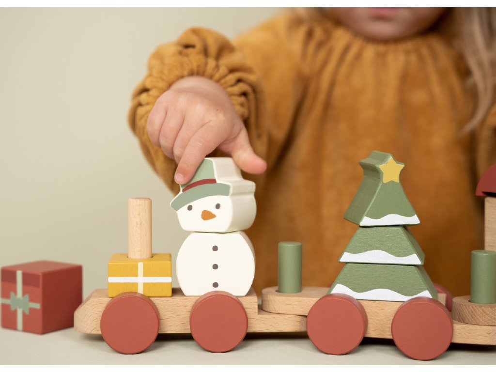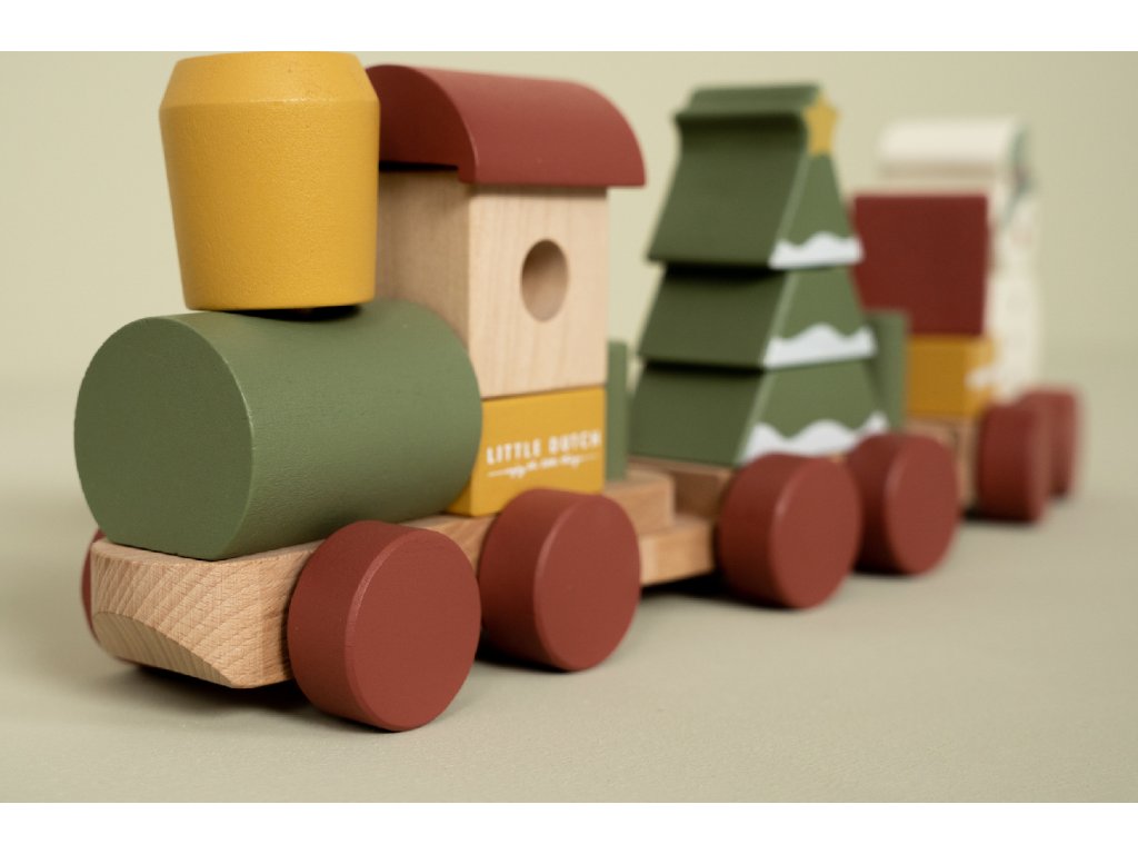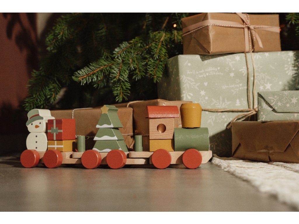 Speciální vánoční edice dřevěného vláčku z dílny Little Dutch. Vláček se skládá z kostek různých tvarů a barev s vánočními motivy, s jejichž pomocí může vaše dítě sestavovat různé varianty vagónů.