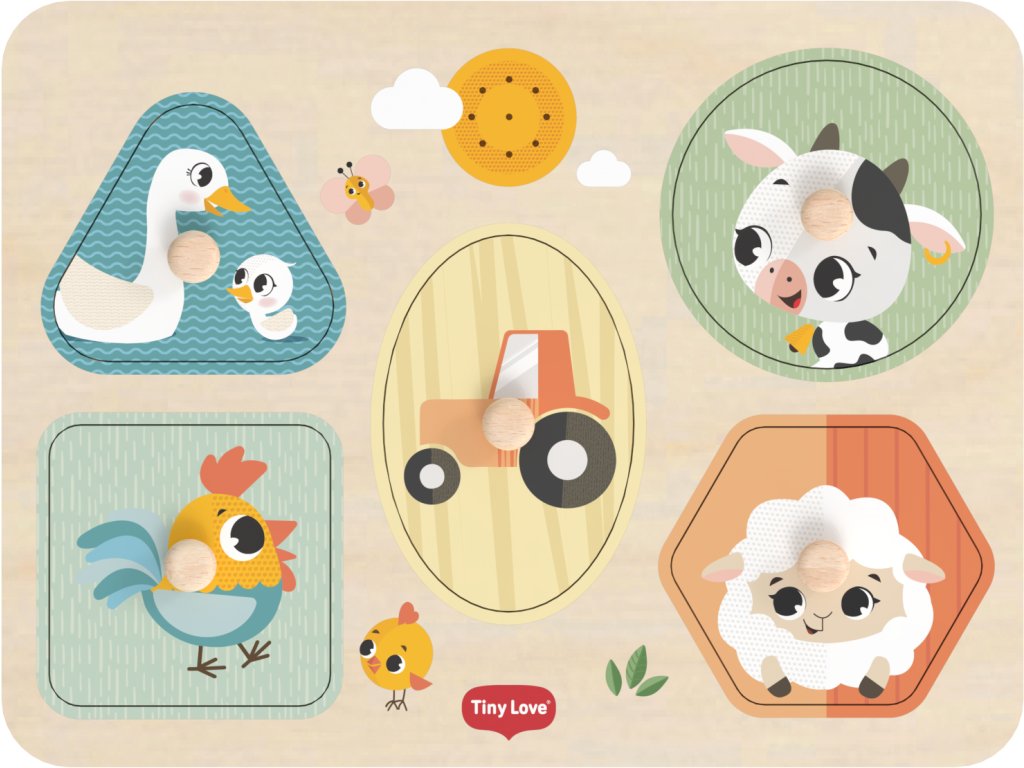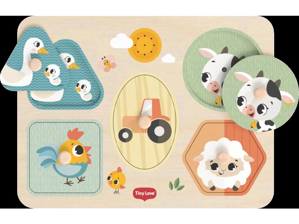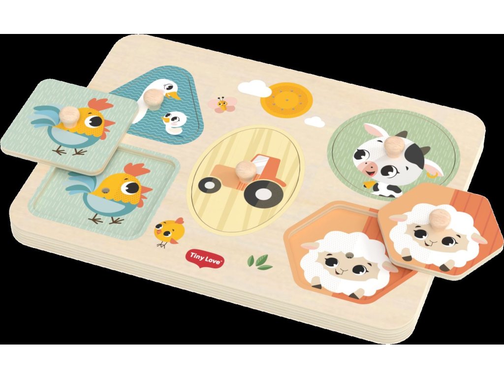 Dřevěné zvukové puzzle Tiny Love jsou zábavná vkládačka pro nejmenší, která učí děti rozpoznávat tvary, barvy a zvířátka. Pět velkých dílků různých tvarů s ilustracemi motivů ze života na farmě se díky úchytům snadno drží. Při vložení dílku na správné místo je dítě odměněno zvukem zvířátka, které je na dílku namalované. Dítě se tak učí vztahu "příčina - následek", uchopováním a vkládáním dílků se rozvíjí jeho jemná motorika a koordinace "ruka - oko".