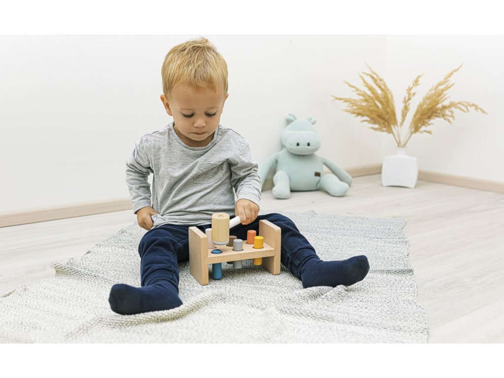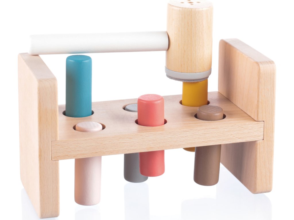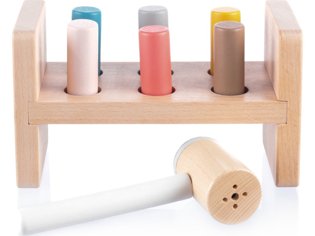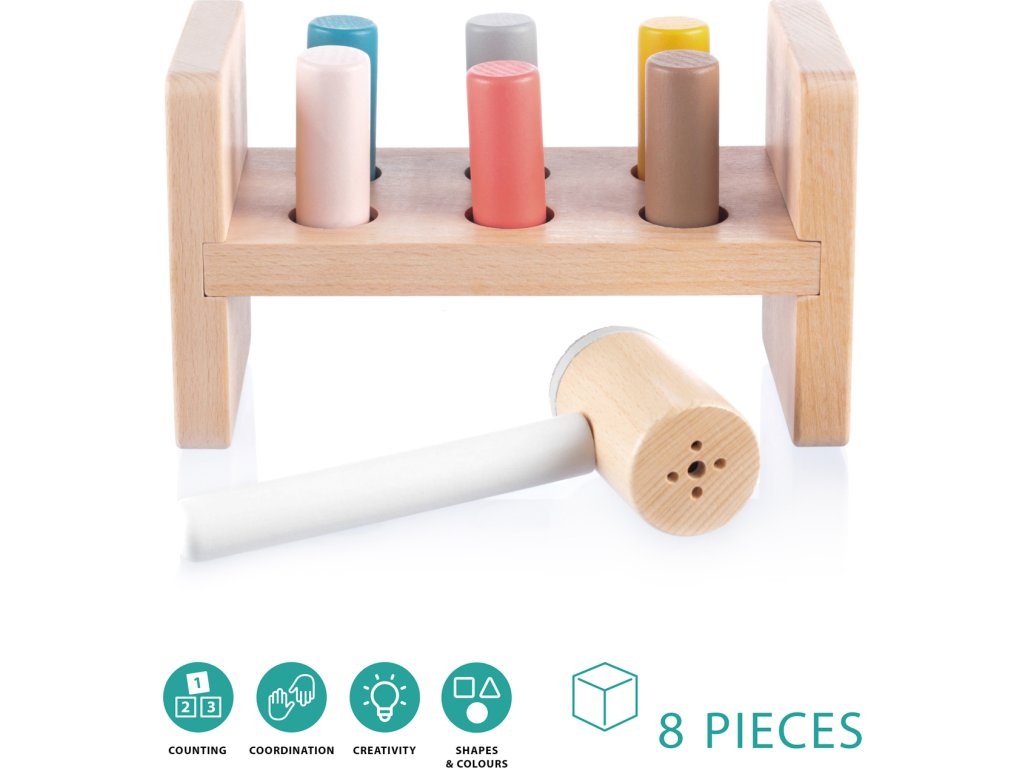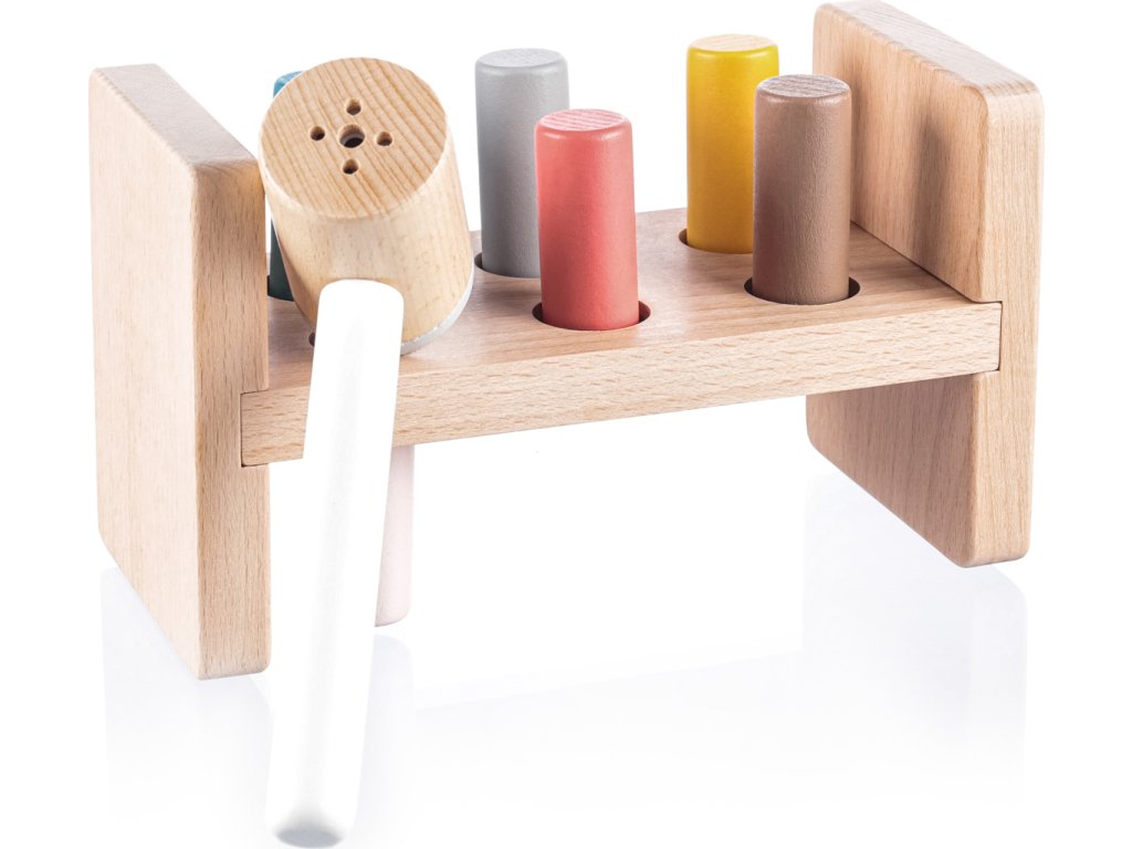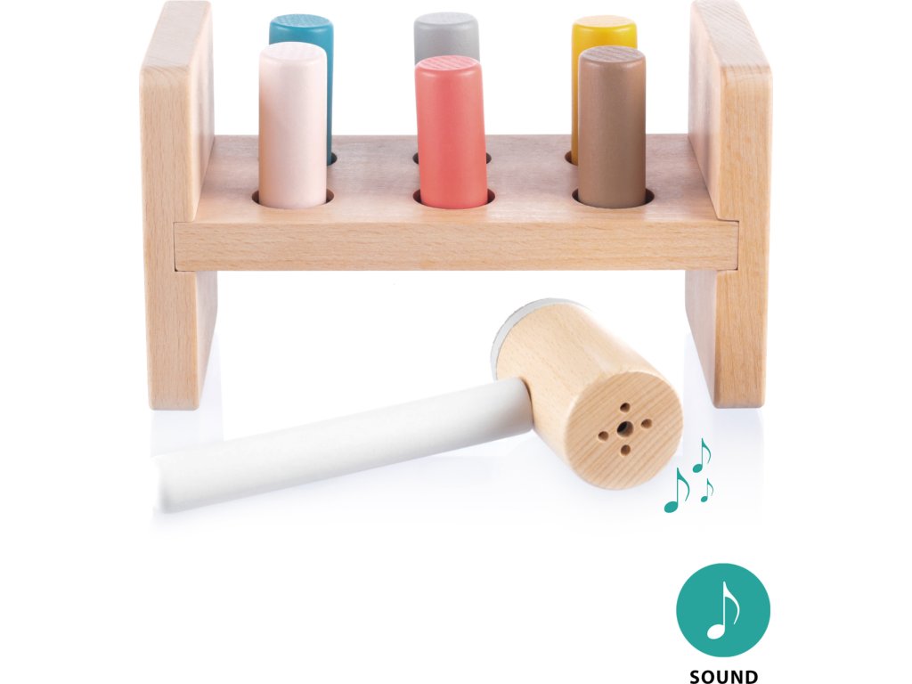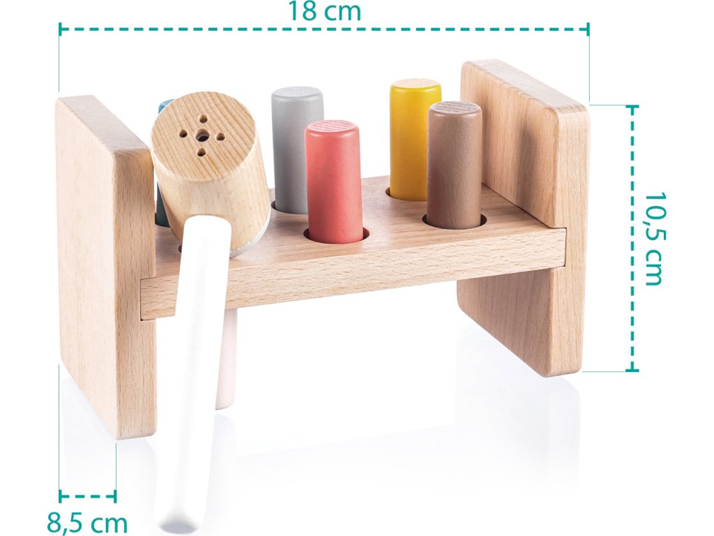 Dřevěná zatloukačka pro malé děti, která je zabaví na dlouhé hodiny. Obsahuje dřevěný stolík s otvory, 6 pestrobarevných kolíků a kladívko. Když je kolík umístěn do otvoru a zatluče se, kladívko vydává příjemný zvuk. Kolíky lze zatloukat z obou stran stolíku.