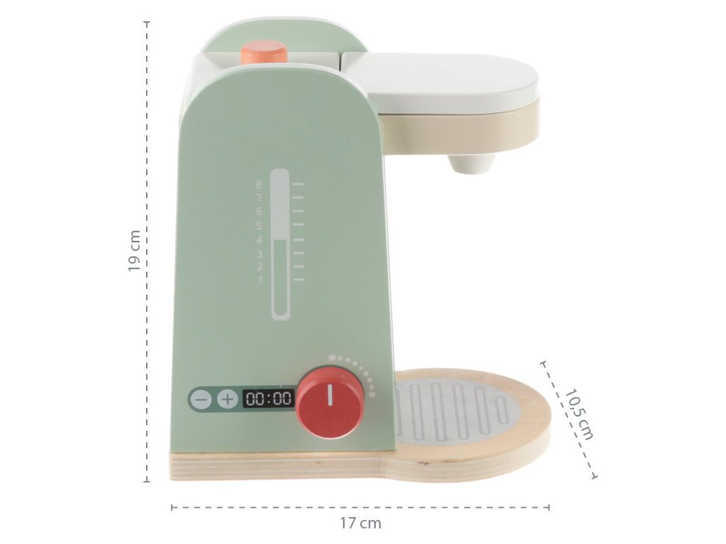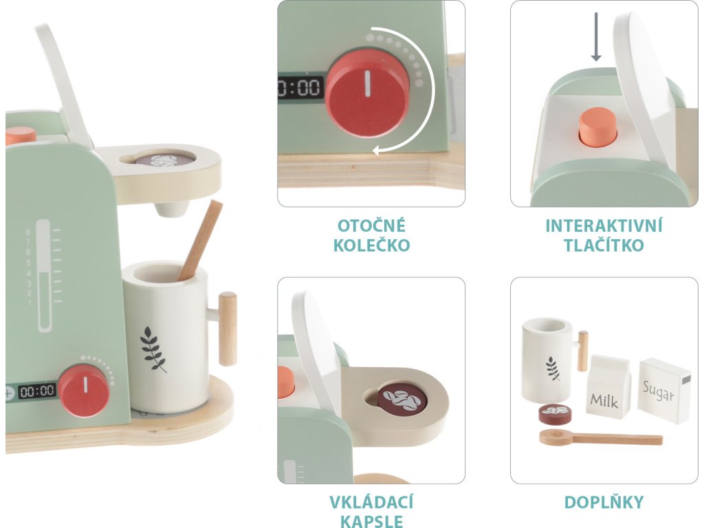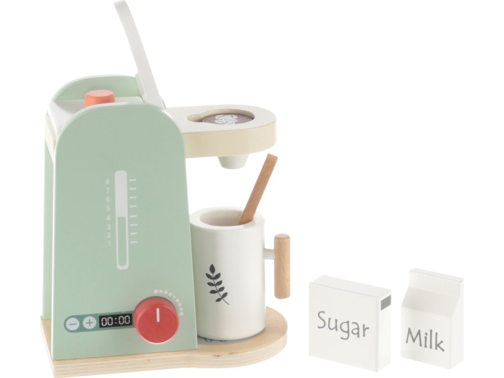Součástí je velký dřevěný šálek se lžičkou a suroviny na přípravu kávy. Hračka