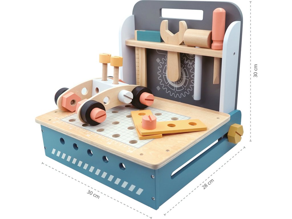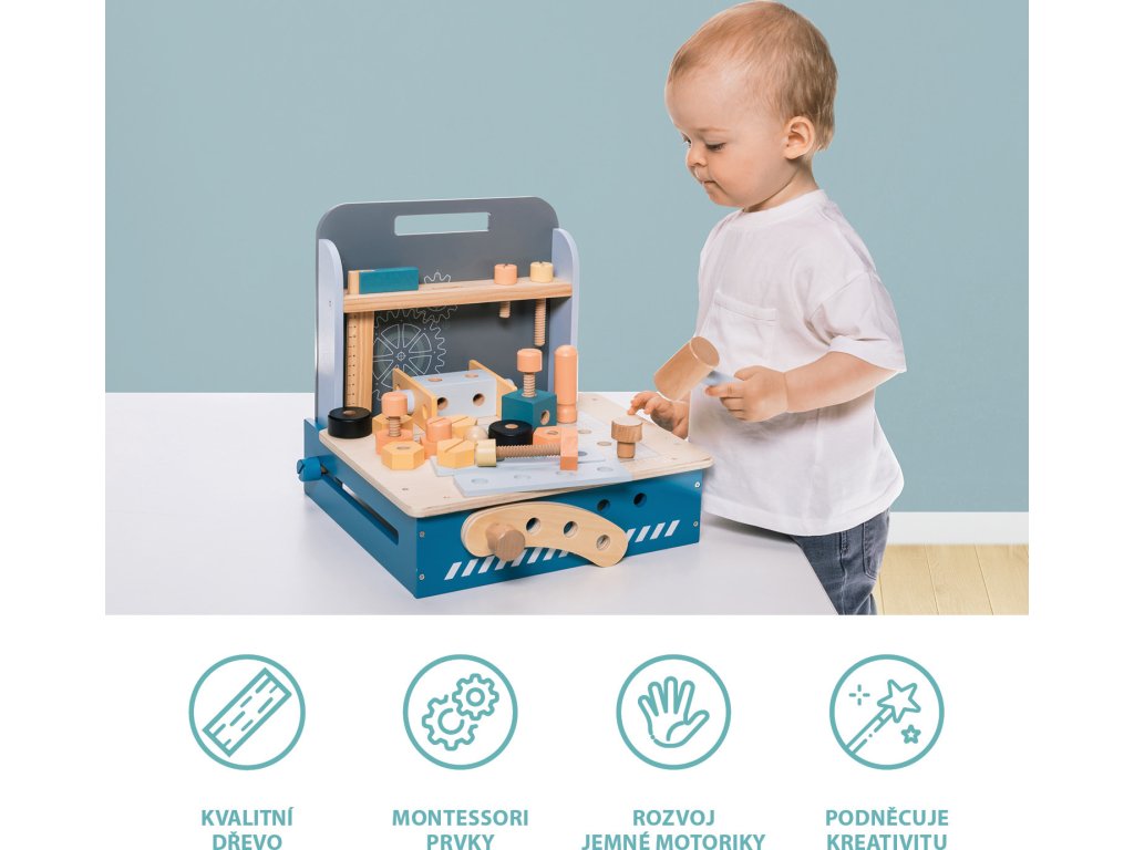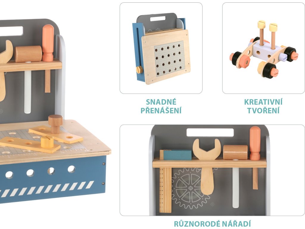 rukou. Skládací ponk je vyrobený z kvalitního dřeva a barev na vodní bázi.