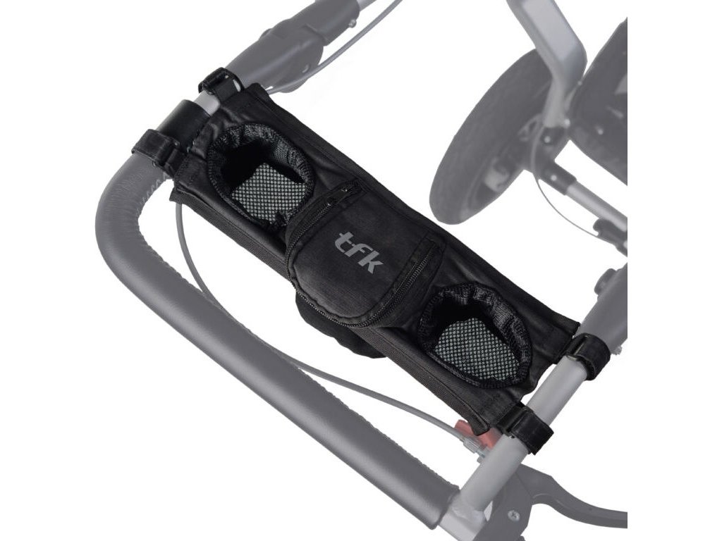 TFK Cupholder T-113-310 •držák nápojů vhodný pro použití na kočárku Twin Trail, Twin Adventure •textilní materiál •pratelný •dvě přihrádky na lahvičky •jedna uzavíratelná kapsa na zip •uchycení pomocí suchého zipu