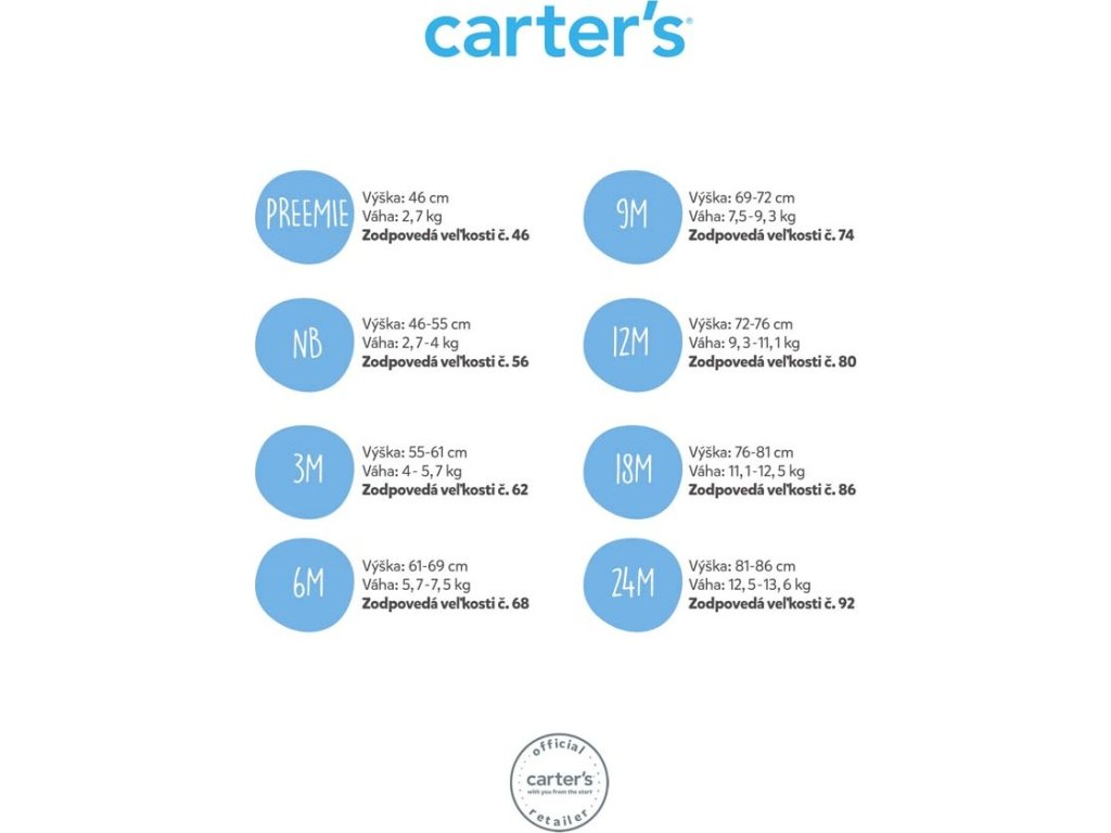 Všechny modely značky Carter 's jsou vyrobeny ze super měkké bavlny a množstvím lásky. Overaly jsou perfektní pro start Vaší výbavičky a určitě by neměly chybět v žádném šatníku děťátka. Navrženy jsou tak aby byly velmi pohodlné. Ideální jsou na hraní a spánek.