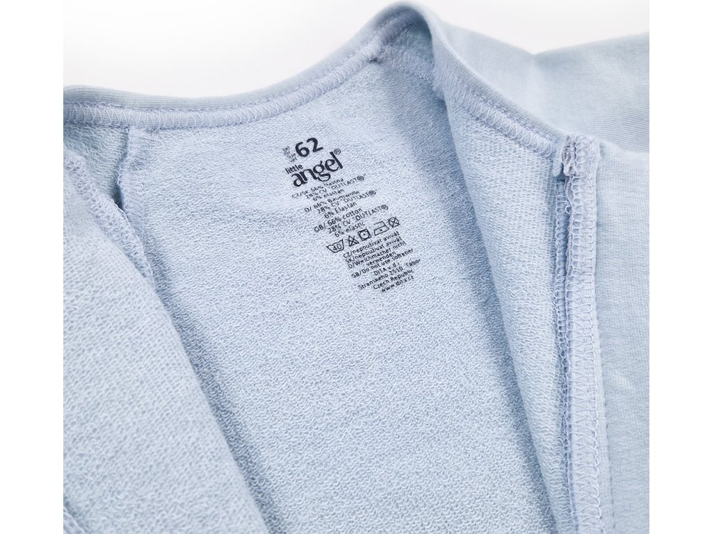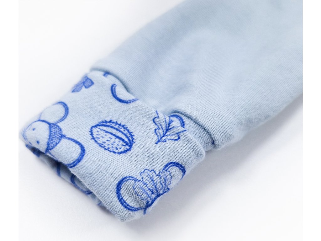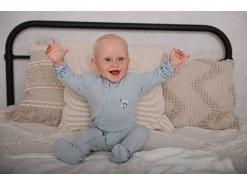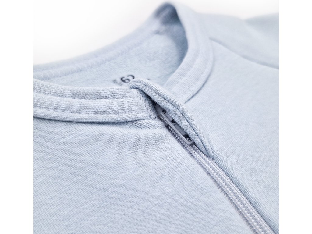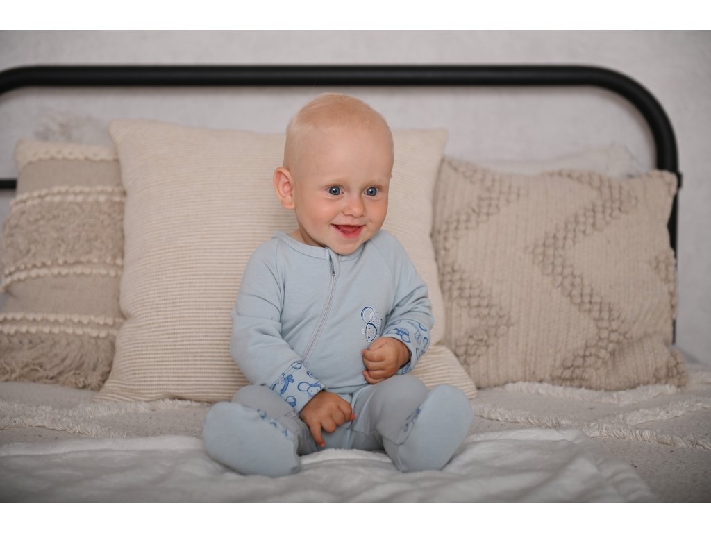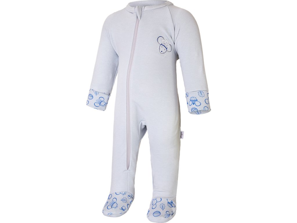 Pohodlný dětský overal z bavlněného úpletu a termoregulačního materiálu Outlast®. Overal má dupačkové nohavice. Rukávy jsou dlouhé a mají široké náplety, které můžete v případě potřeby ohrnout a upravit tak délku rukávů podle aktuální potřeby. Overal se zapíná na dlouhý zip, který usnadní oblékání. Po zapnutí lze jezdec zipu schovat do speciální krytky pod bradou, a zabránit tak otlačení brady. Přední stranu overalu zdobí potisk s motivem zvířátka. Overal má uvnitř nažehlené etikety, které netlačí a nadráždí jemnou dětskou pokožku.