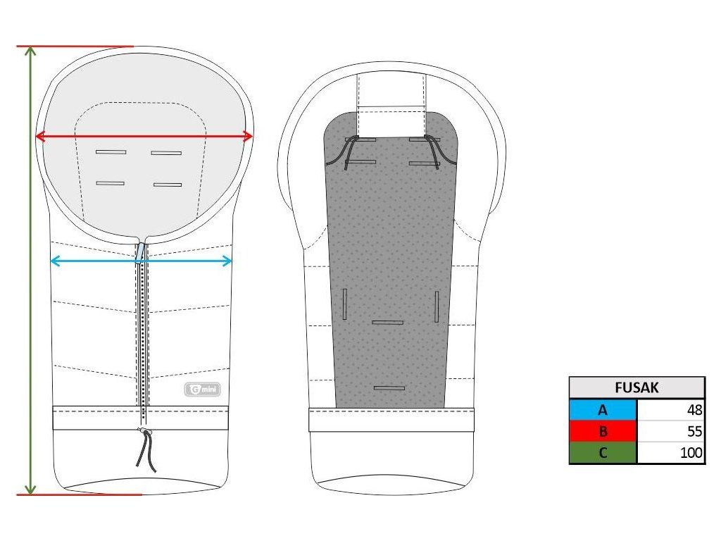 Rozměry vnější: délka fusaku 100 cm, šířka 48 cm
