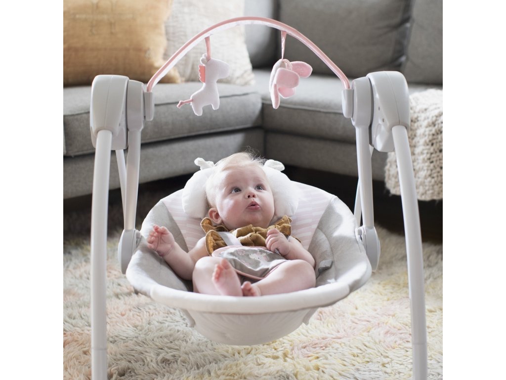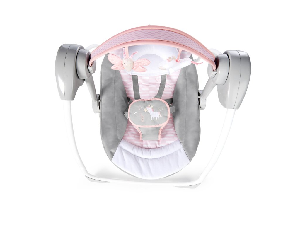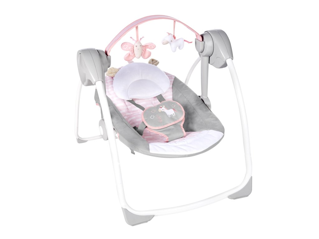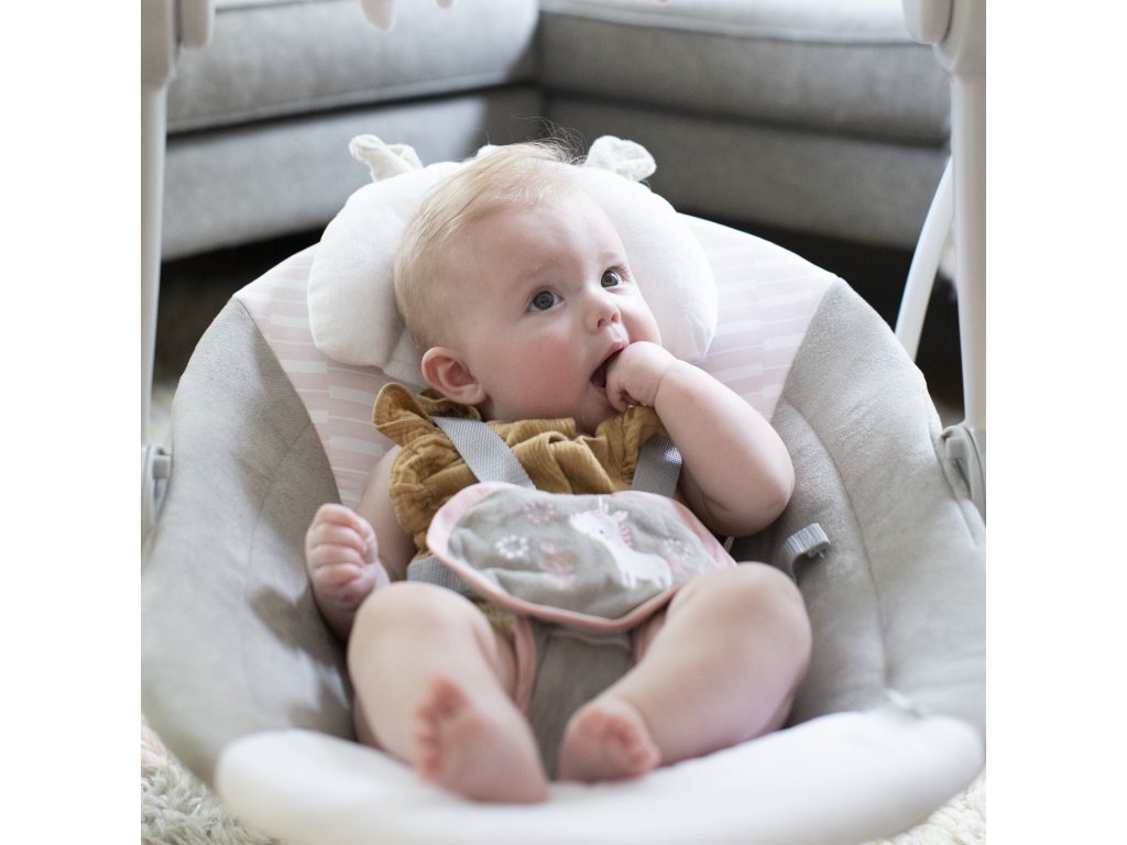 Navrženy s ohledem na rodičovství. Maximální pohodlí kdykoliv a kdekoliv s houpačkou Flora the Unicorn značky Ingenuity. Super kompaktní houpačka, která v sobě zachovává všechny nejdůležitější funkce velké houpačky. Tato lehká houpačka je vybavena množstvím funkcí včetně polohování sedáku do 2 poloh, hrazdičkou s 2 plyšovými hračkami, která se dá jednoduše odstranit pro snadný přístup k dítěti a technologií, která umocňuje uklidňující zážitek děťátka. Získejte pro sebe několik volných okamžiků díky časovači, který lze nastavit na 30, 45 nebo 60 minut. Uklidněte děťátko 12 melodiemi, z nichž všechny mají možnost nastavení hlasitosti. Houpačka je zabalena do dokonalých jemně ladících textilií. A i když se vám přihodí nějaká malá nehoda, tak opěrku hlavy a textilie sedací části můžete jednoduše vyprat v pračce. Sladký růžový design, hračky motýl a jednorožec, z ní dělají ideální houpačku pro holčičku. Používejte od 0 do 9 měsíců.